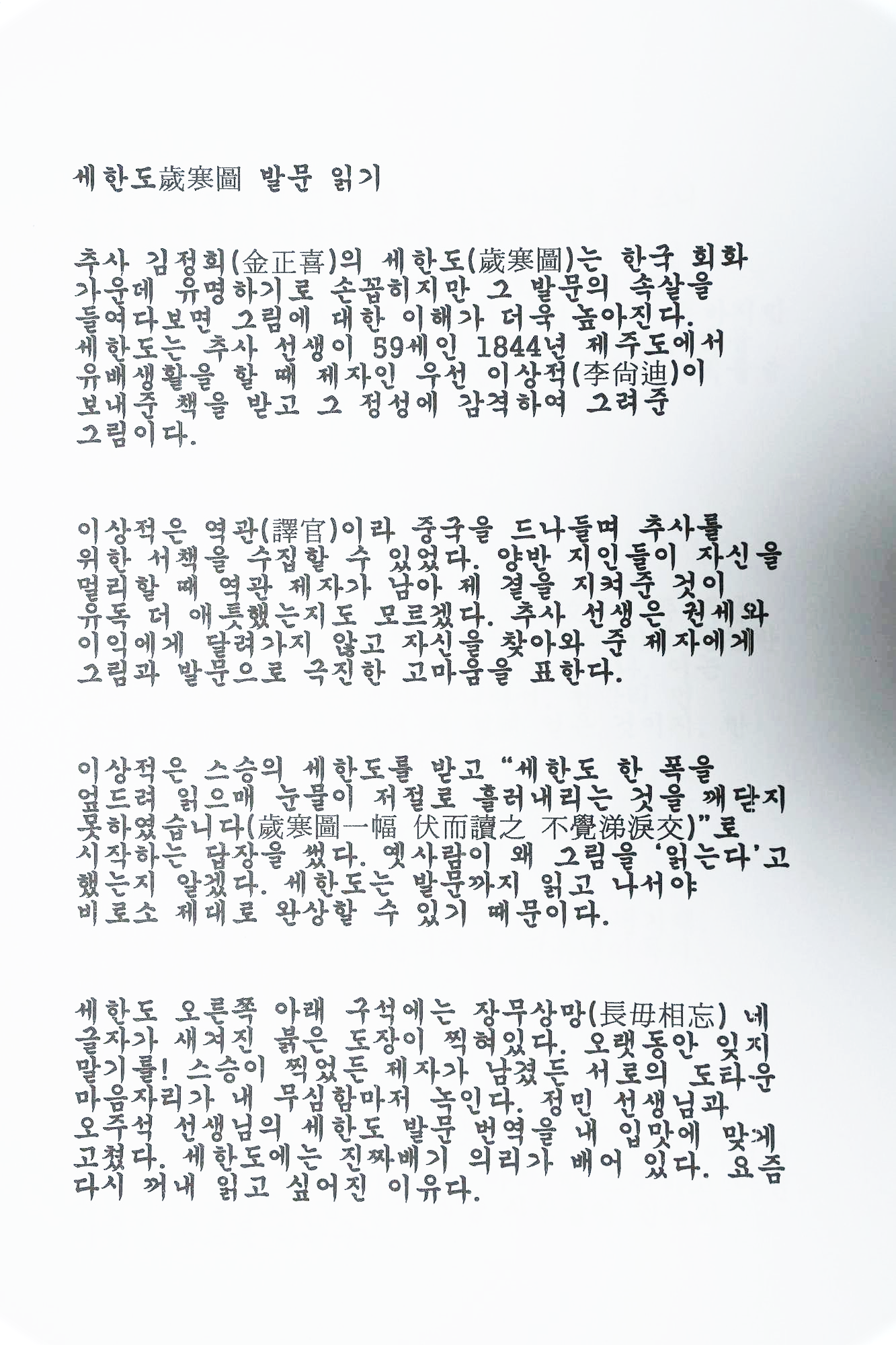 이 발문을 이해하는 것이 세한도를 절반 정도 이해한 것으로 볼 수 있으려나 아니 그에 못미칠지도 모른다