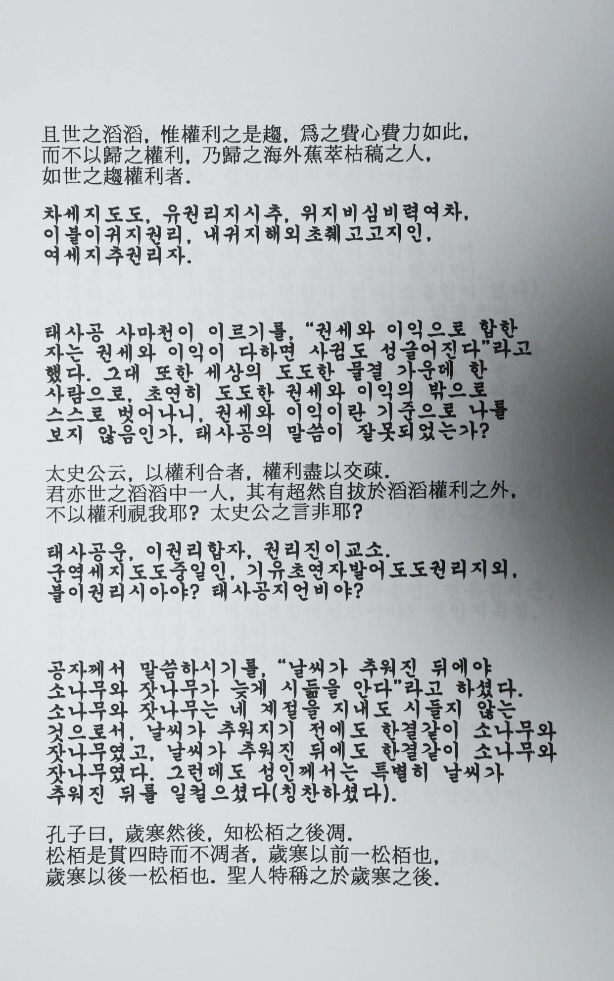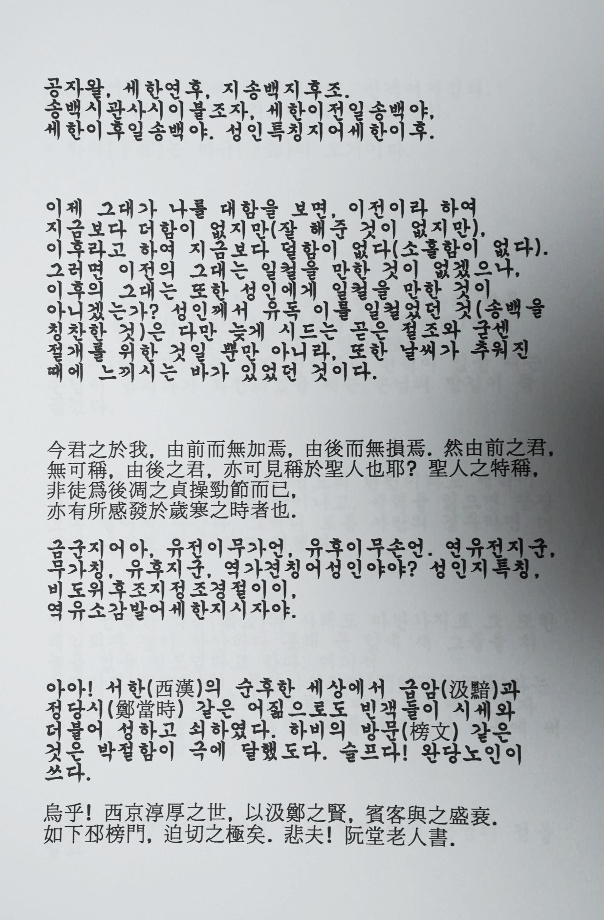 성인께서는 추워진 후의 소나무와 잣나무의 푸름을 특별히 말씀하신 것이라네