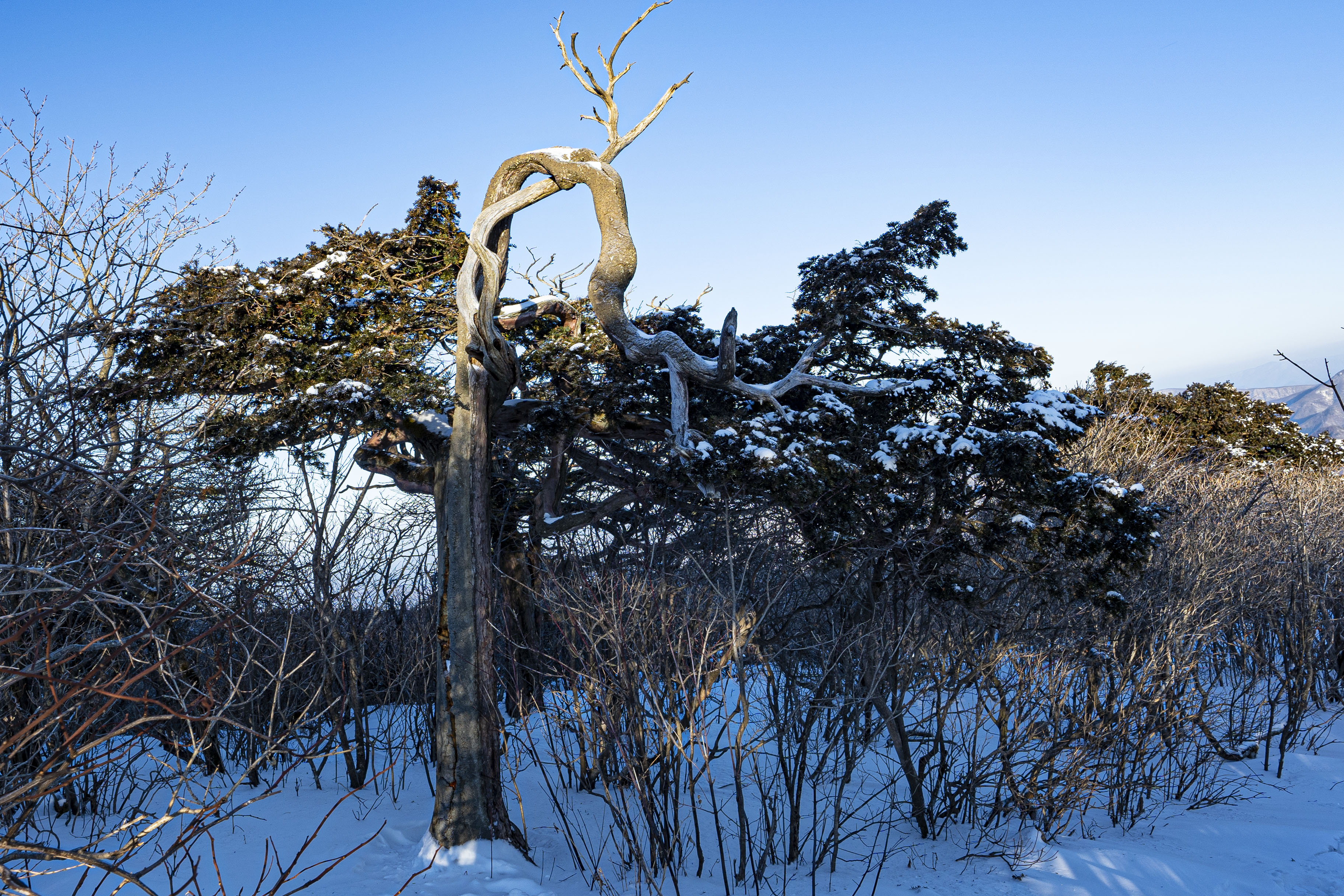 나도 올라올 때 주목 군락지에서 사진 포인트를 찾을 수 있을 것 같아 동행을 먼저 보내고 나는 정상에서 혼자가 되었다