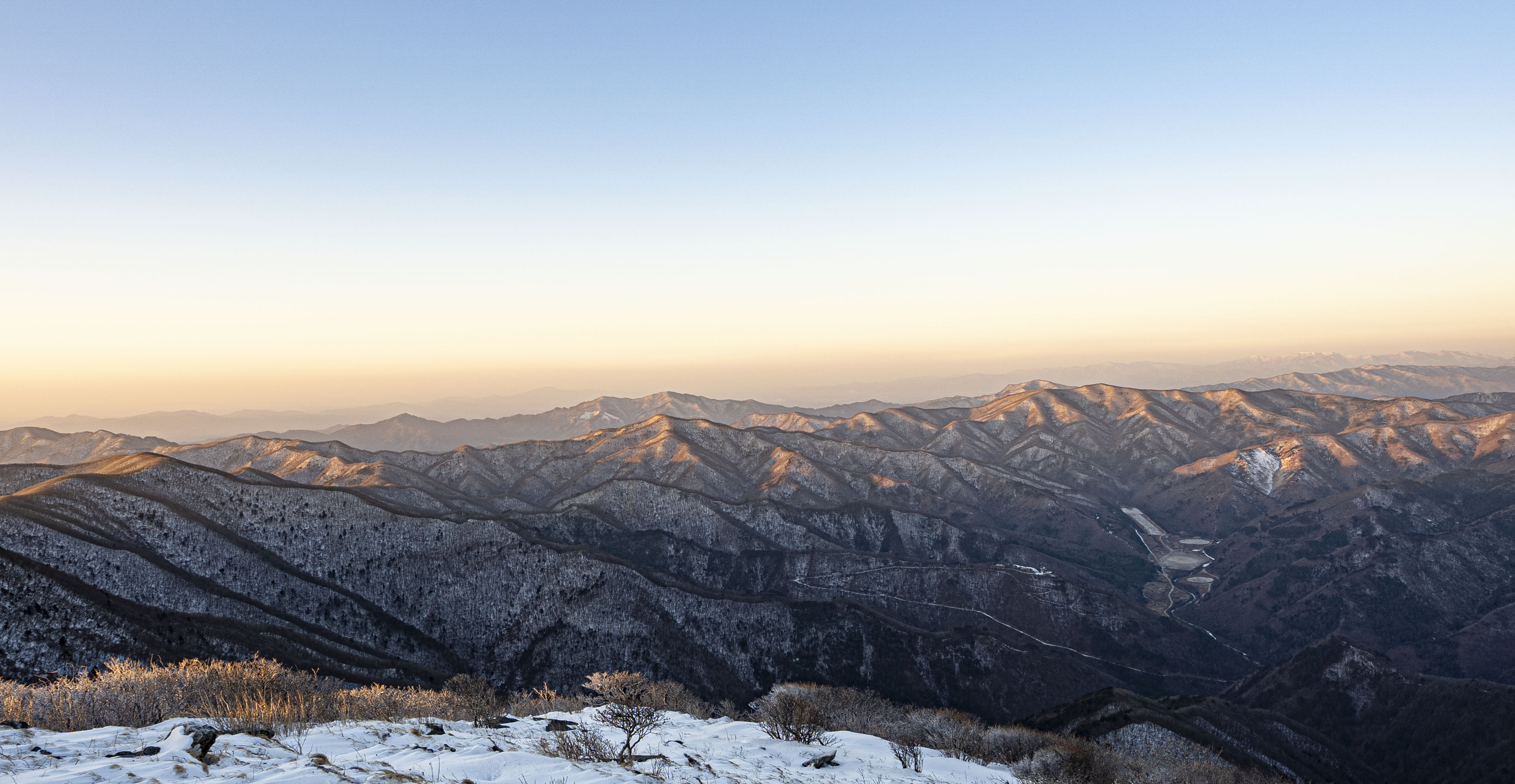 등줄기에 눈이 쌓여서 흰 근육질 굴곡의 산줄기가 빛나는 아침 햇살에 더욱 꿈틀거리며 살아 보인다