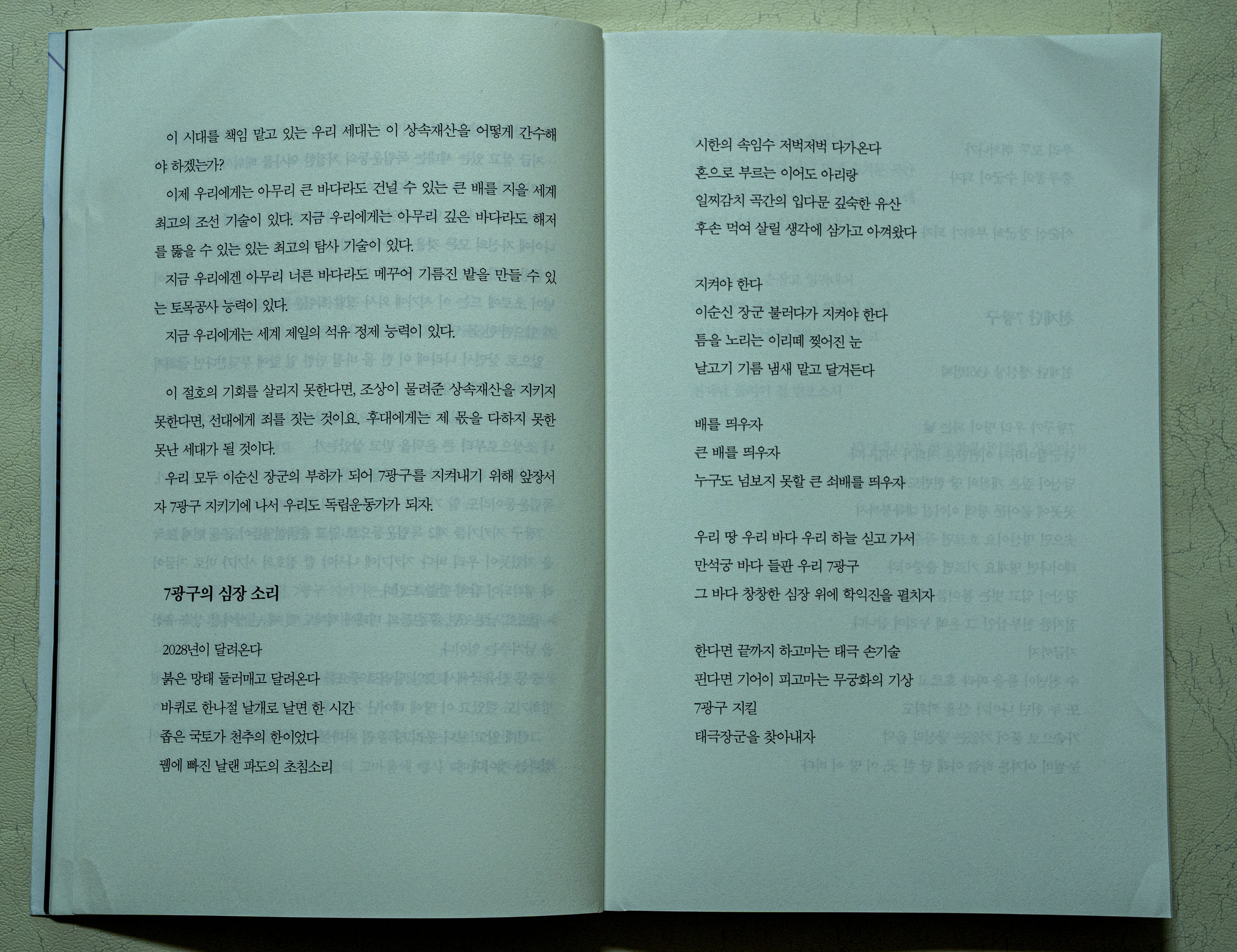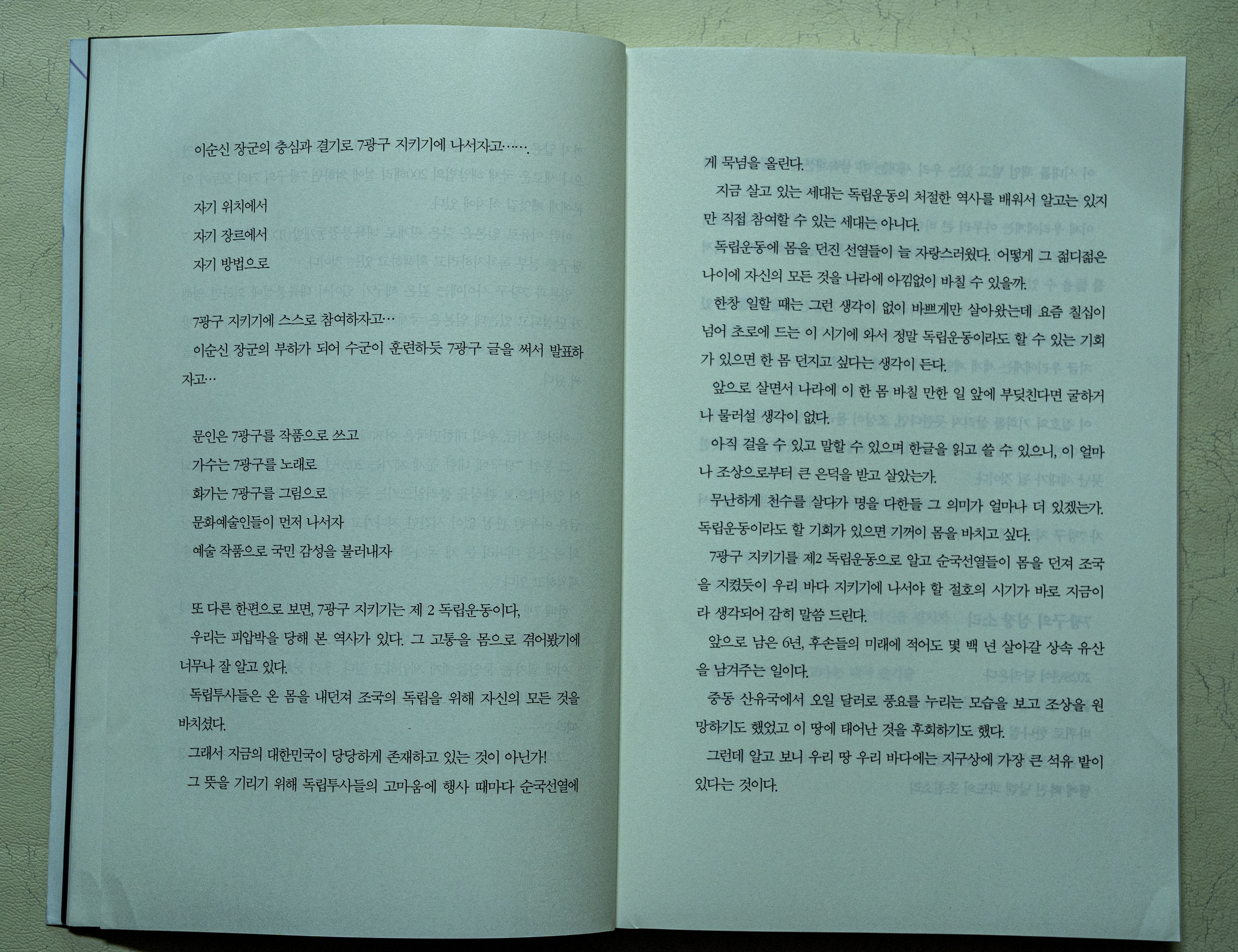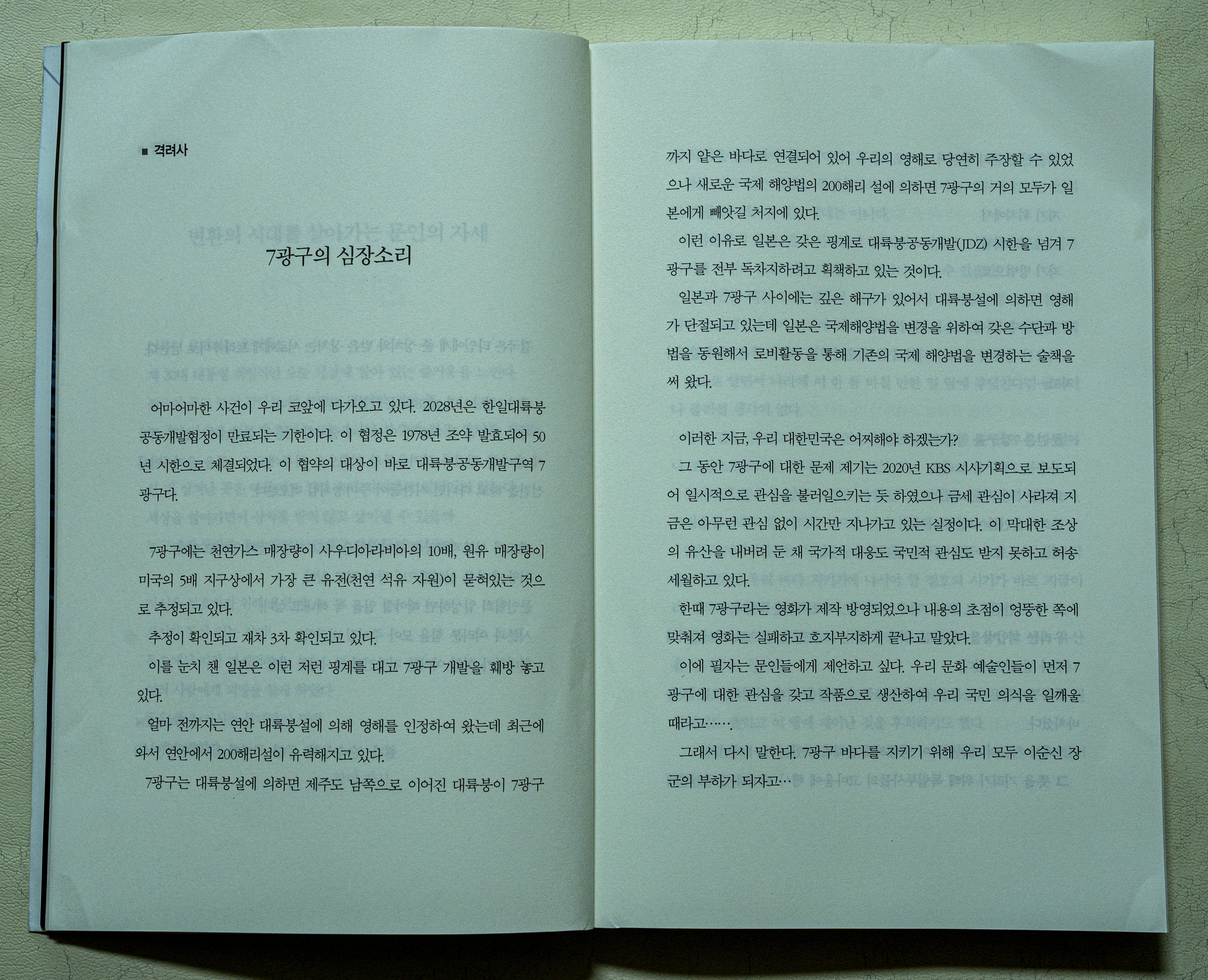 7광구 지키기를 제2 독립운동으로 알고 순국선열들이 몸을 던져 조국을 지켰듯이 우리 바다 지키기에 나서야 할 절호의 시기가 바로 지금이라 생각되어 감히 말씀 드린다