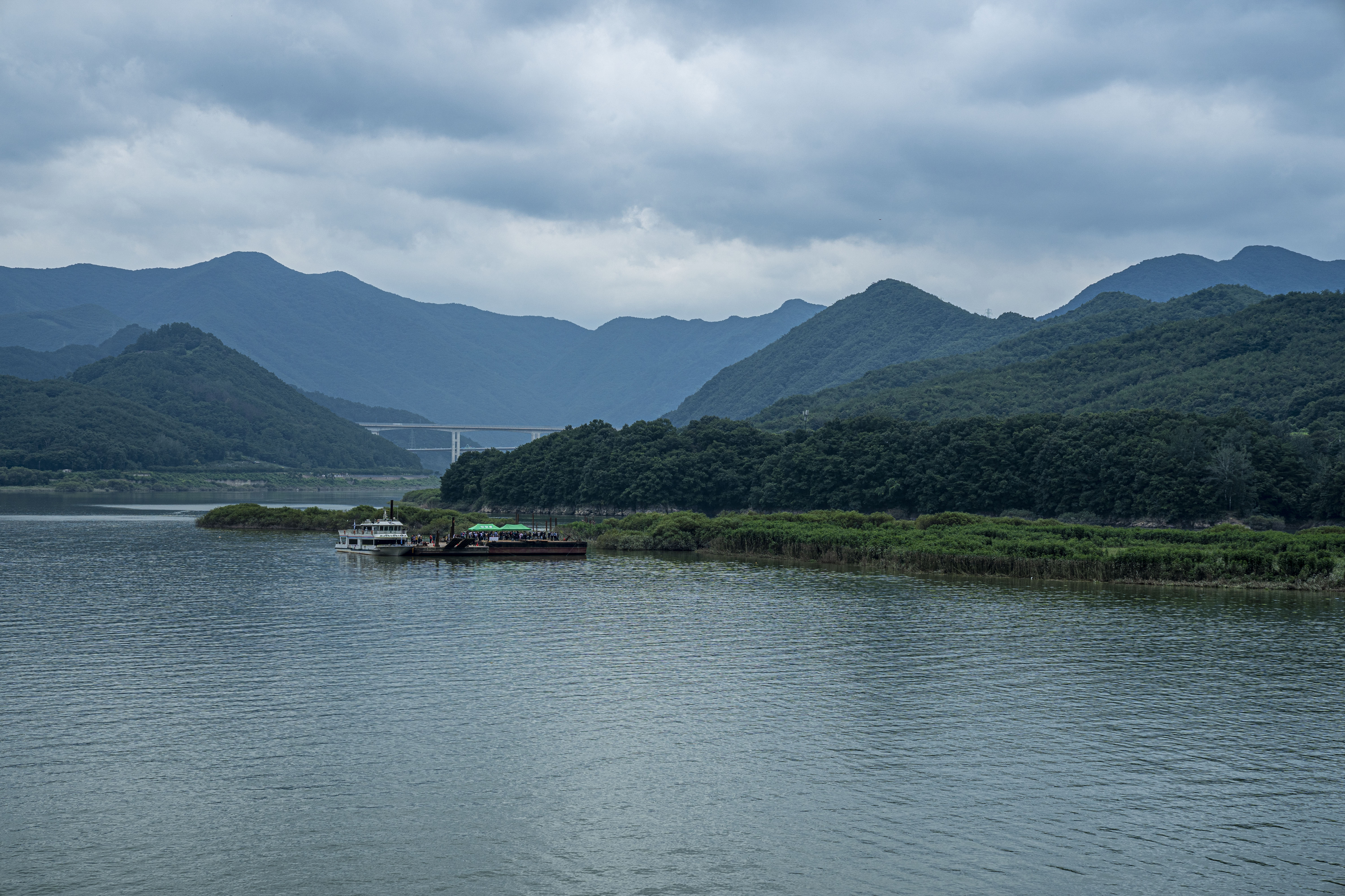 지금으로부터 50년전 단양의 시루섬이었던 지금의 단양역에서 바라보는 남한강이 가장 넓게 펼쳐진 강에 수북한 수풀로 덮여있는 곳이 시루섬이다