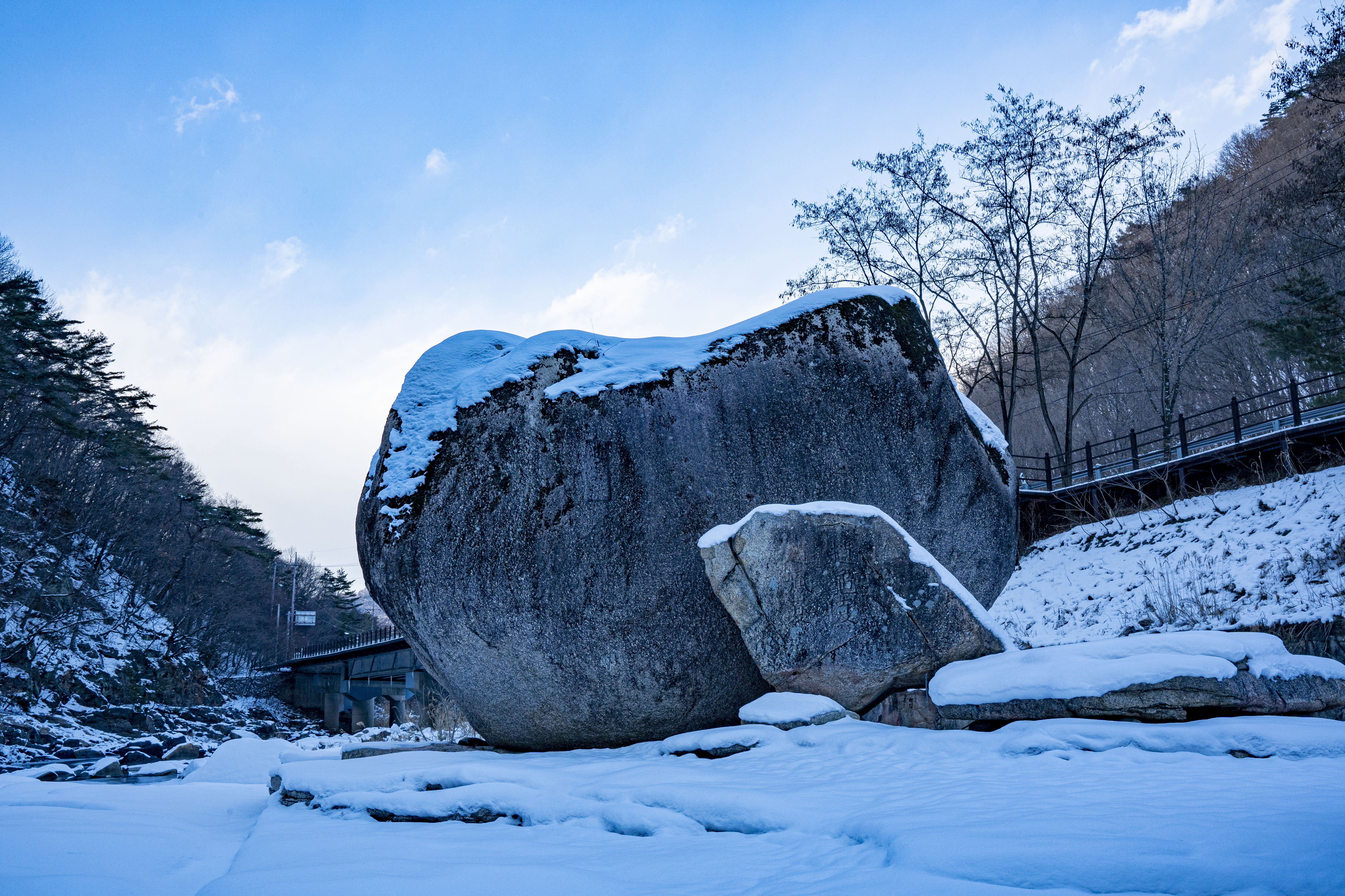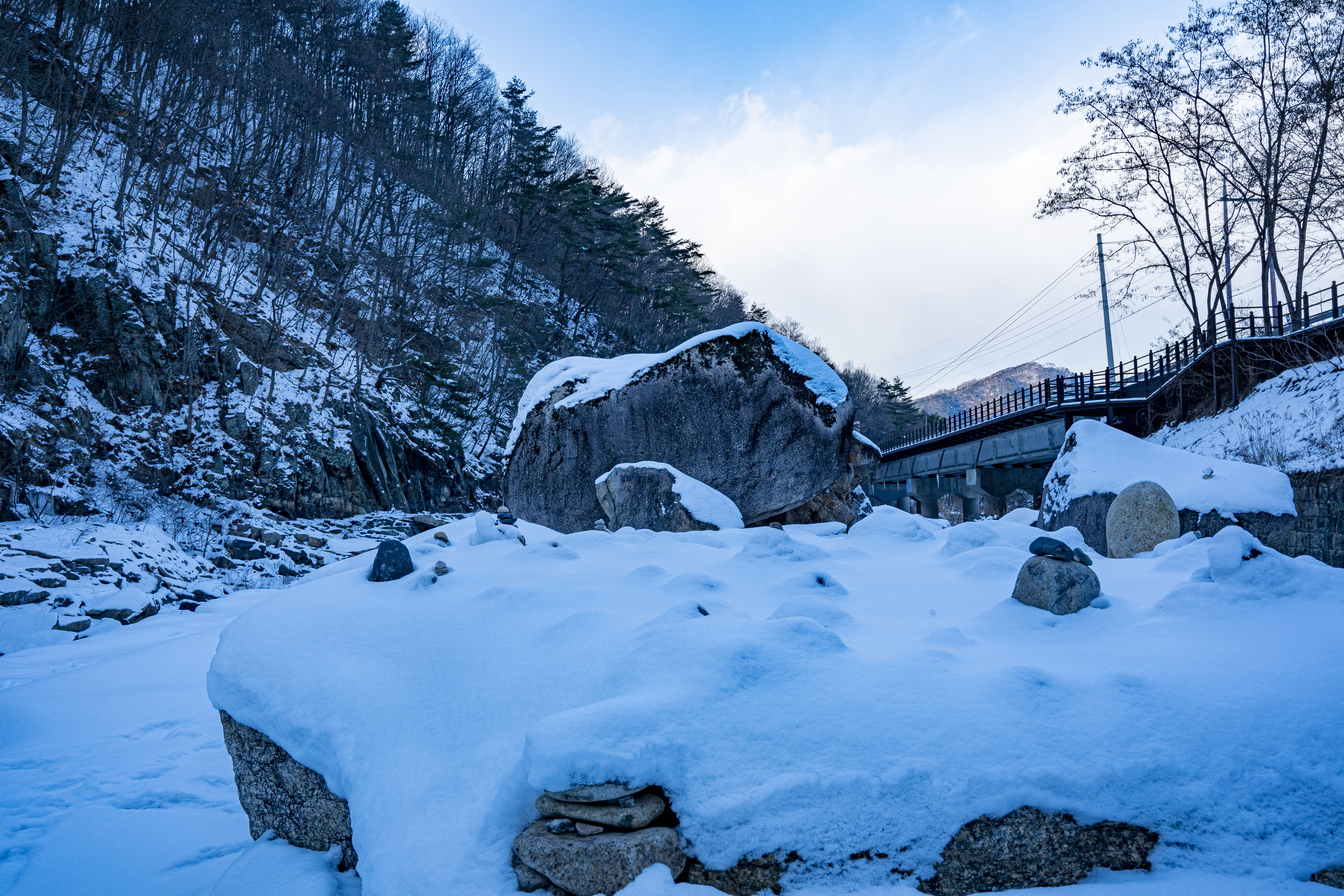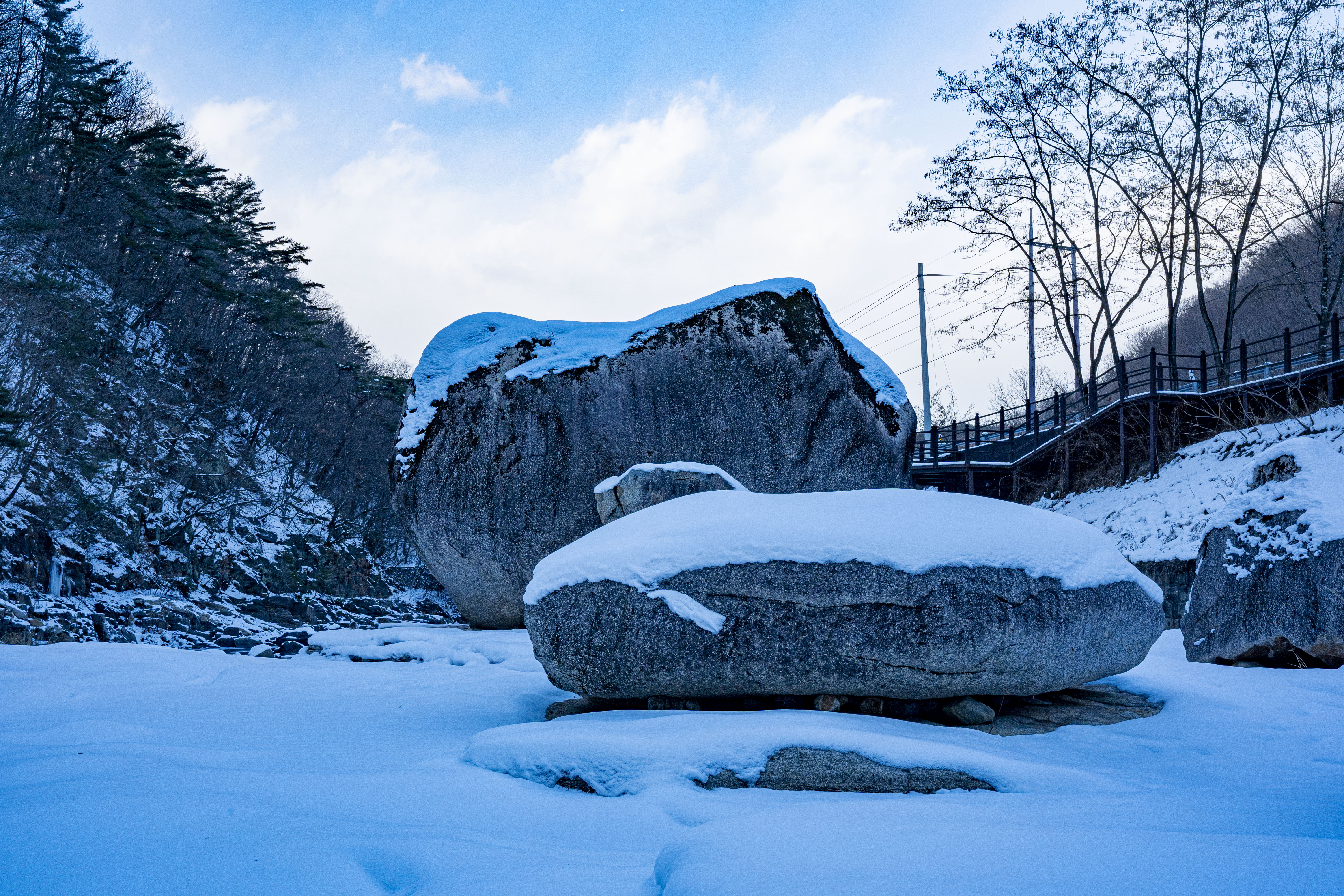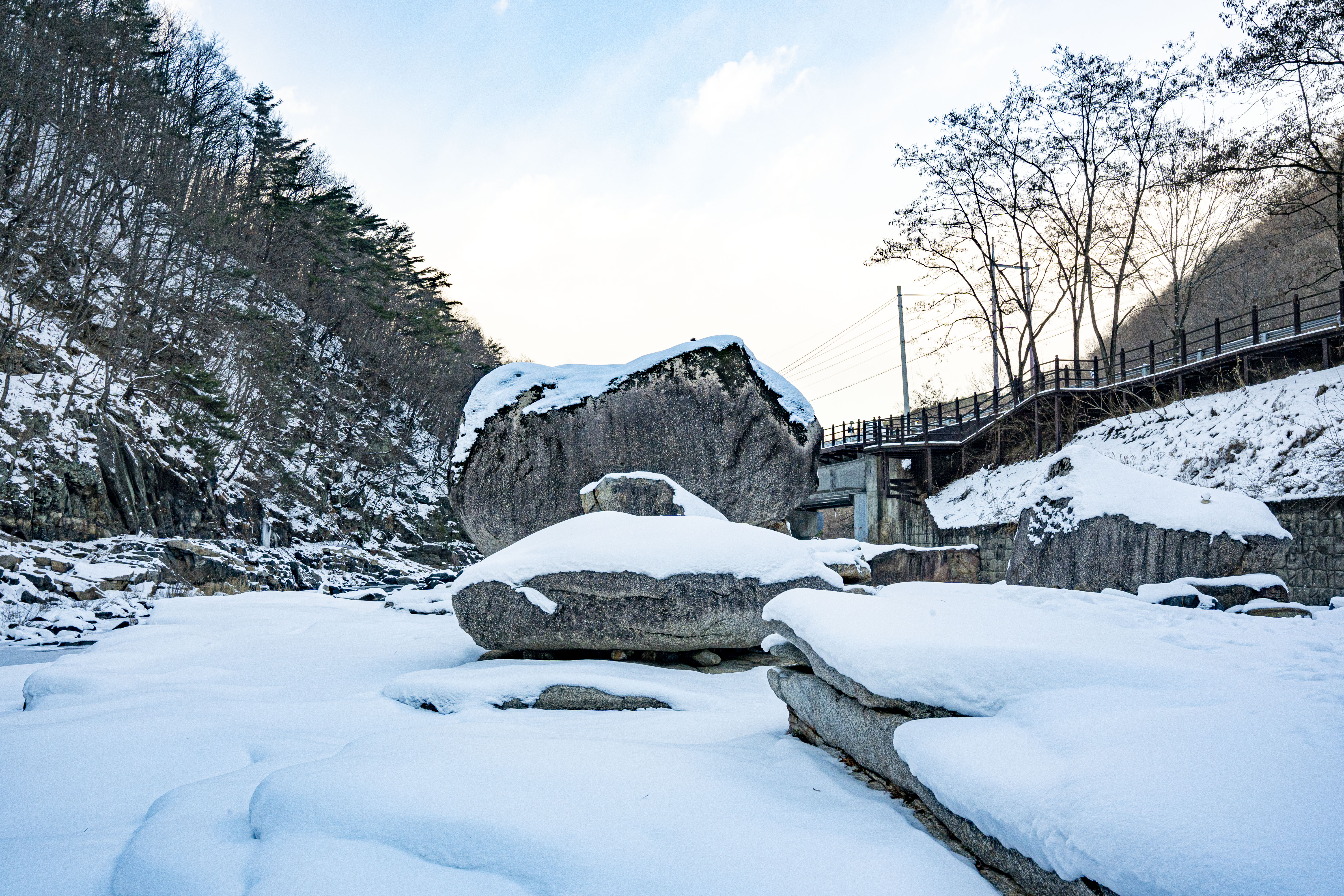선암계곡에 쌓인 설암 풍경을 카메라에 담아 남긴다