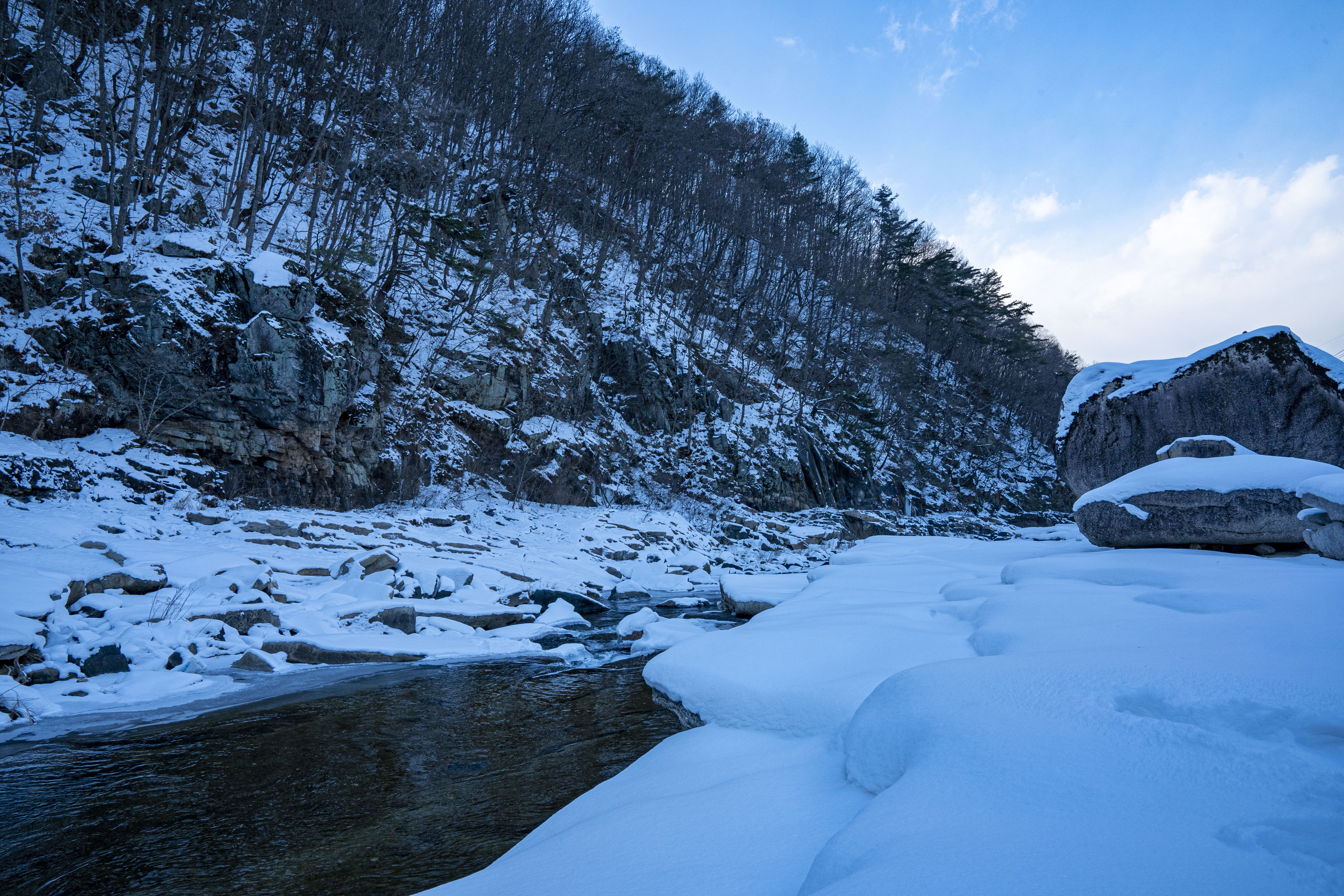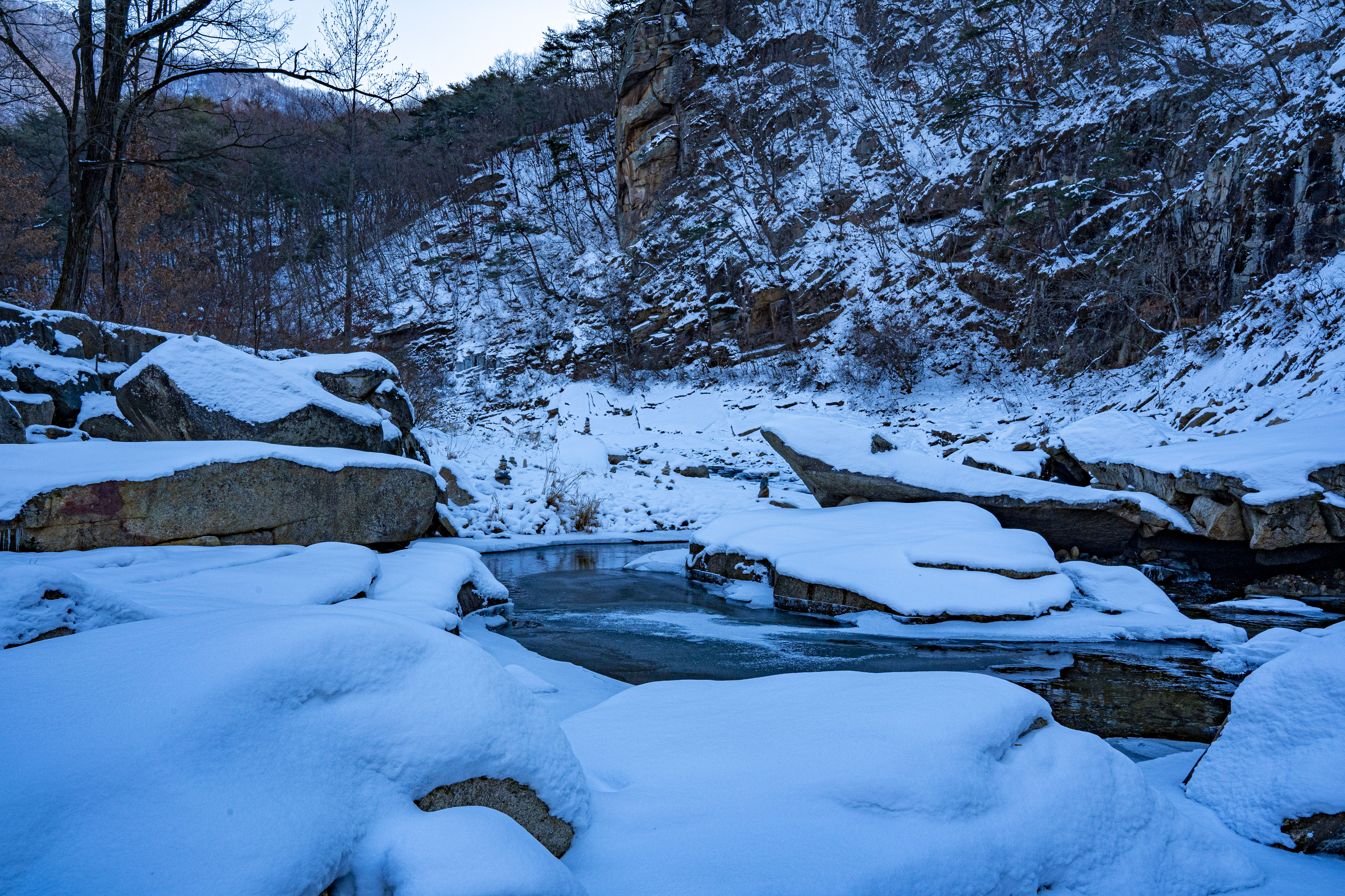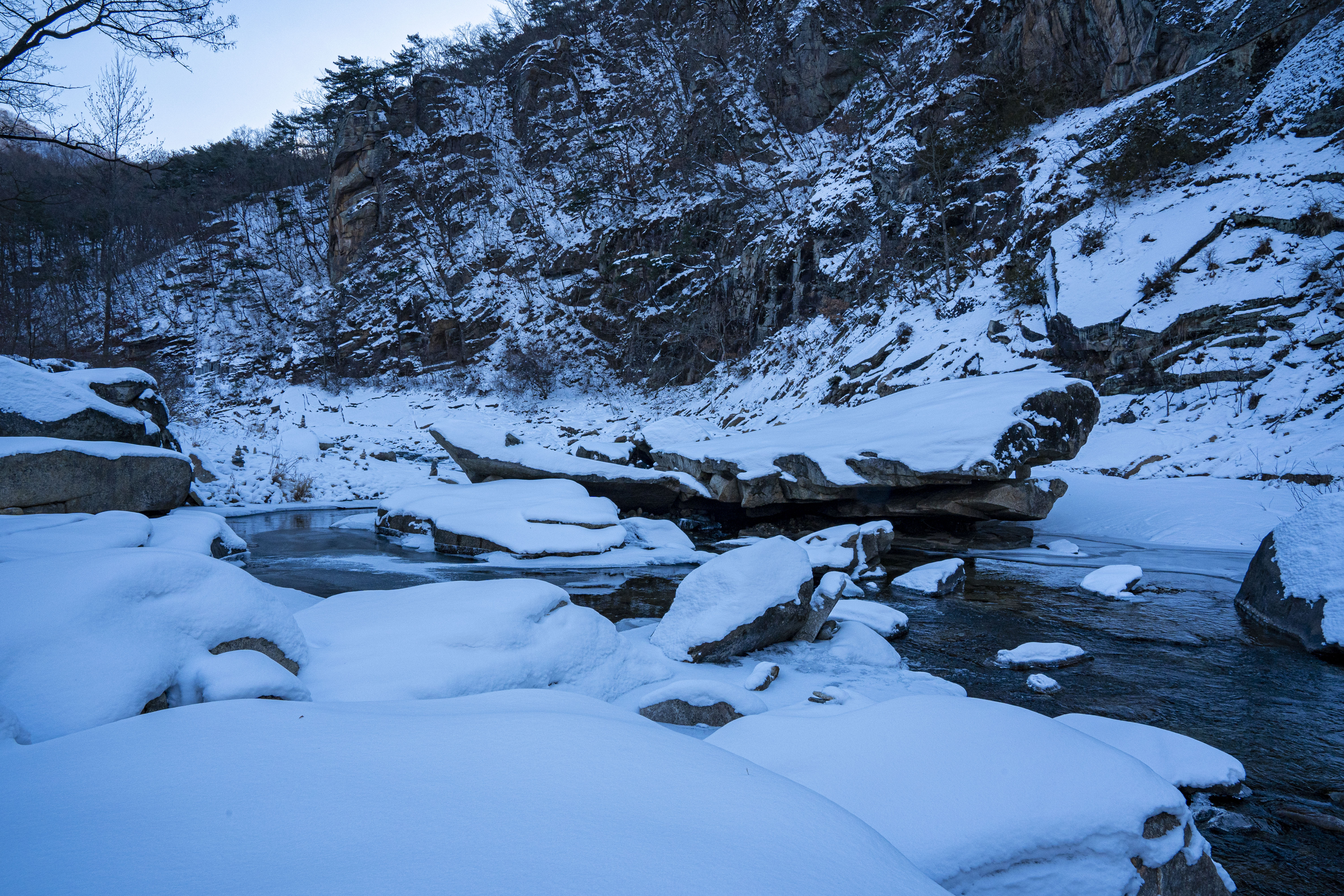 선암계곡에 쌓인 설암 풍경을 카메라에 담아 남긴다