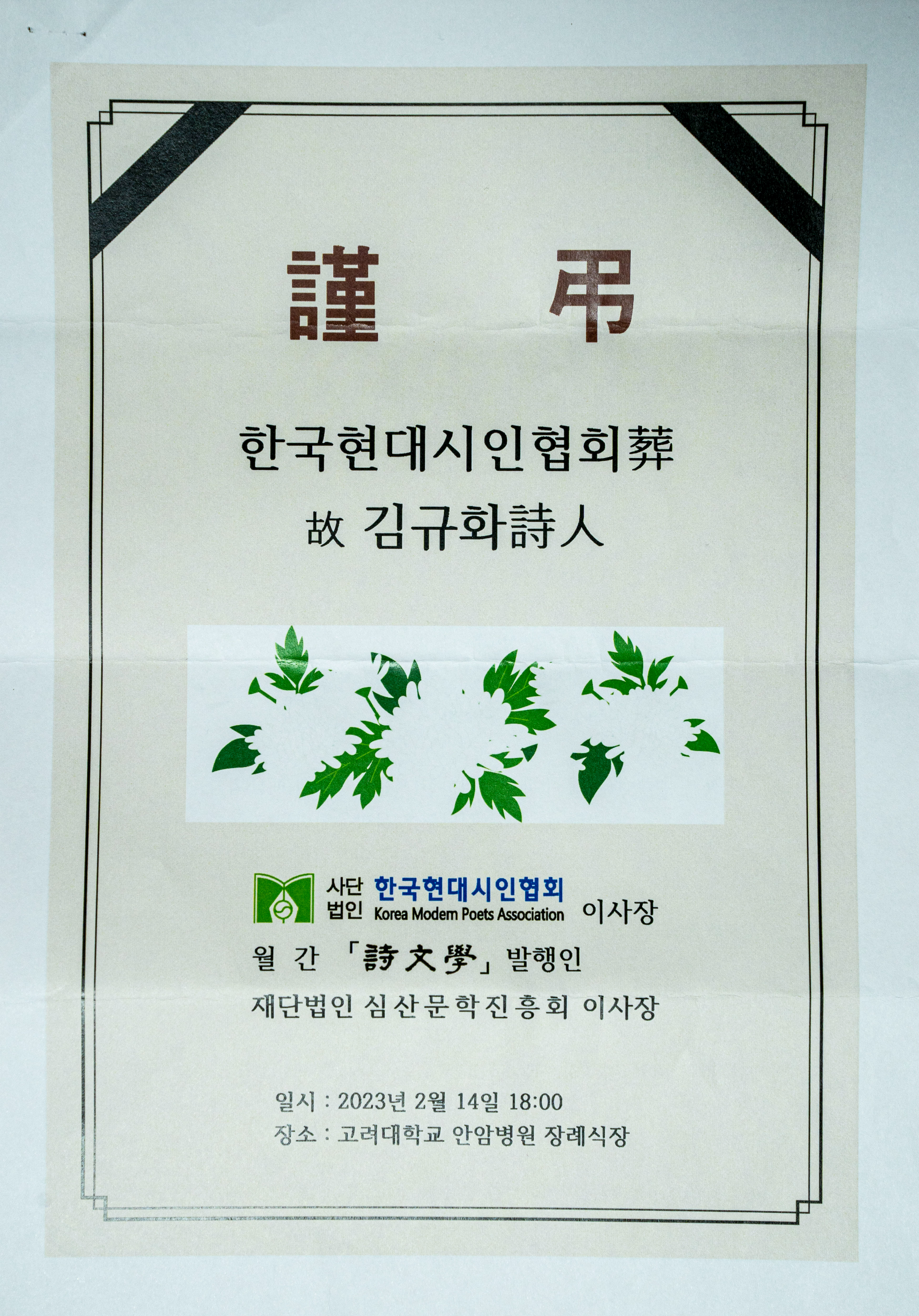 장례식은 2023. 2. 14 18:00에 한국현대시인협회 회원과 각 문인단체에서 참여해서 100여명이 참석하였다