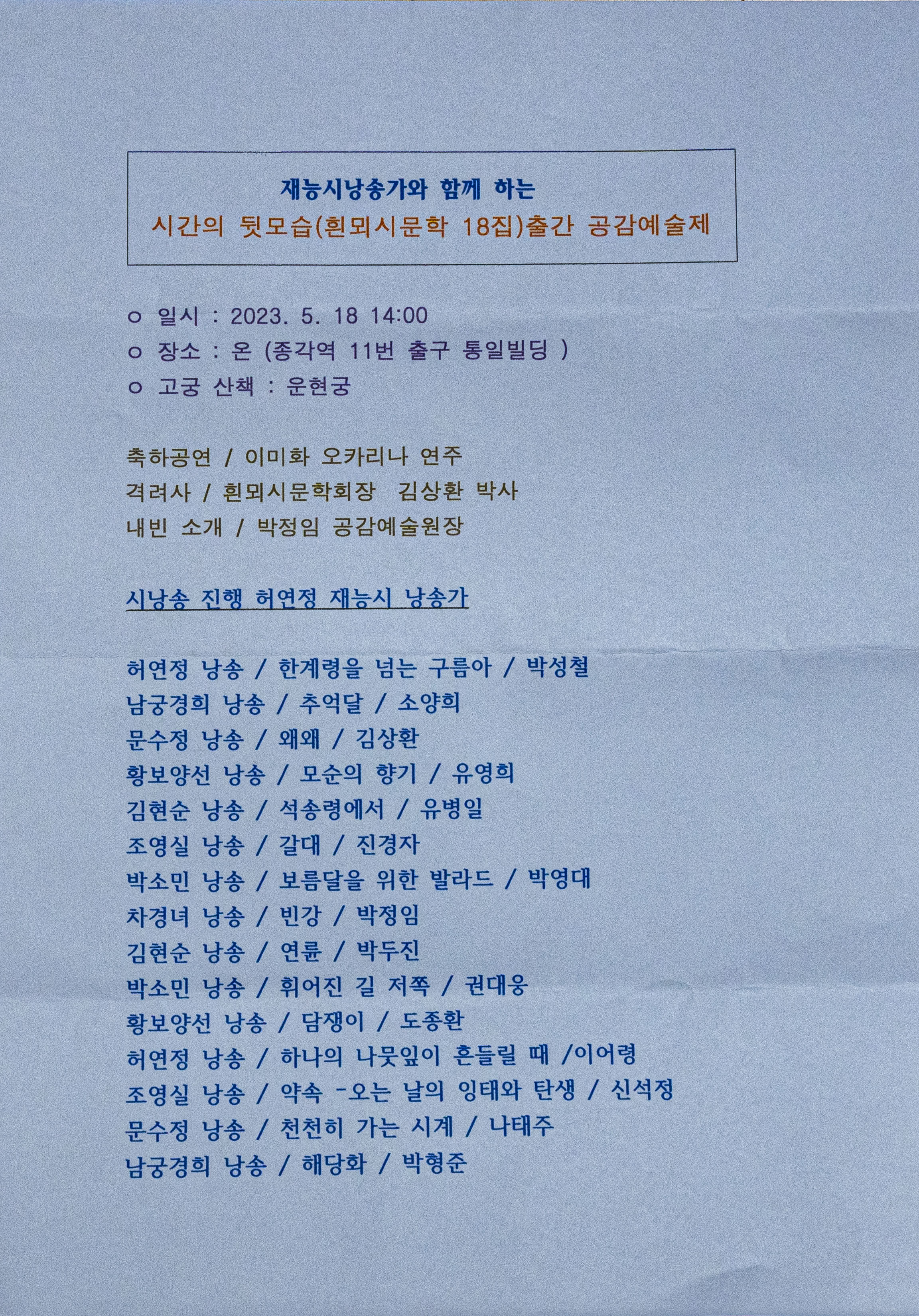 2023. 5. 18 서울 종각역 11번 출구 문화공간 「 온 」에서 특별한 시낭송회가 열렸다