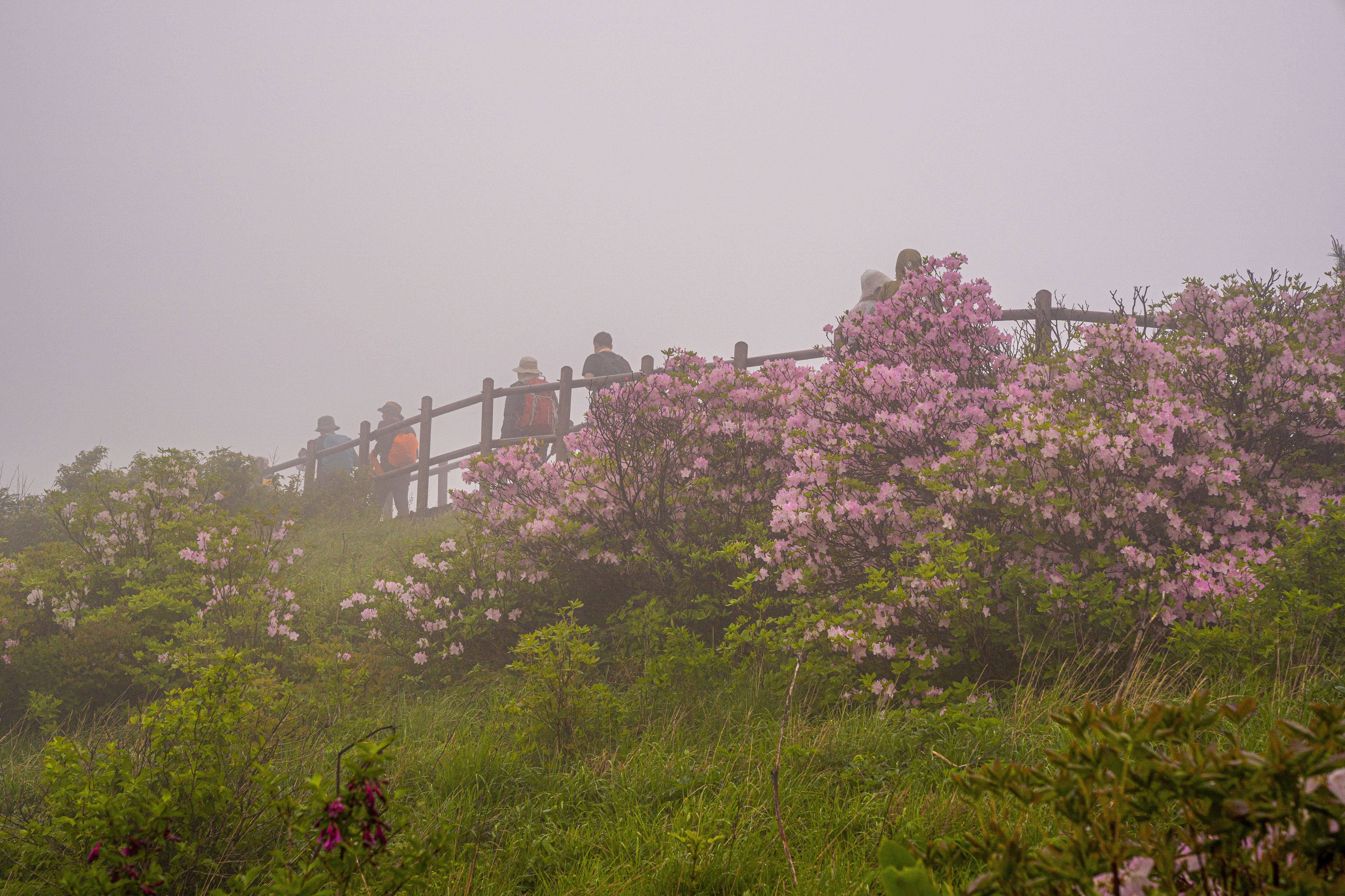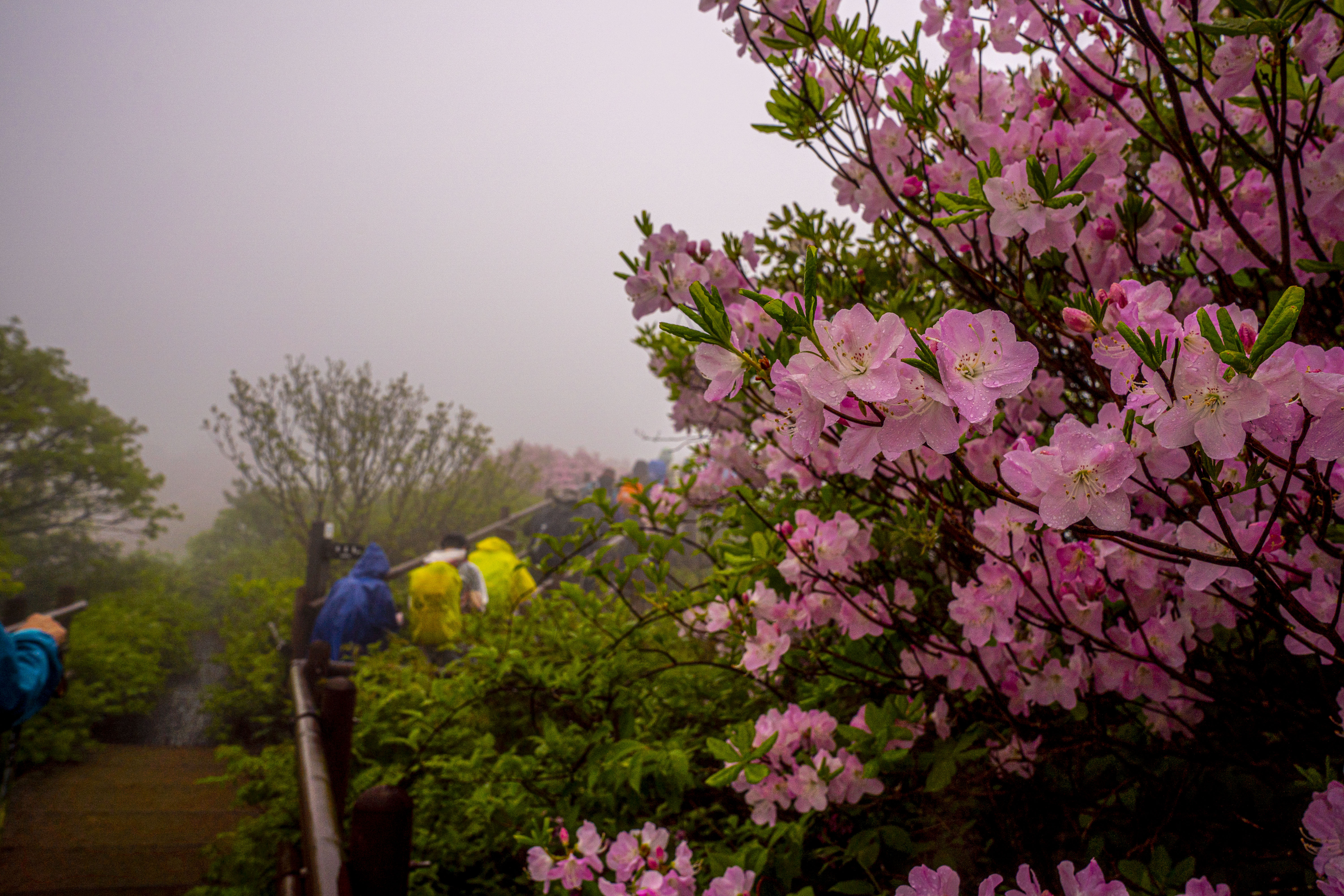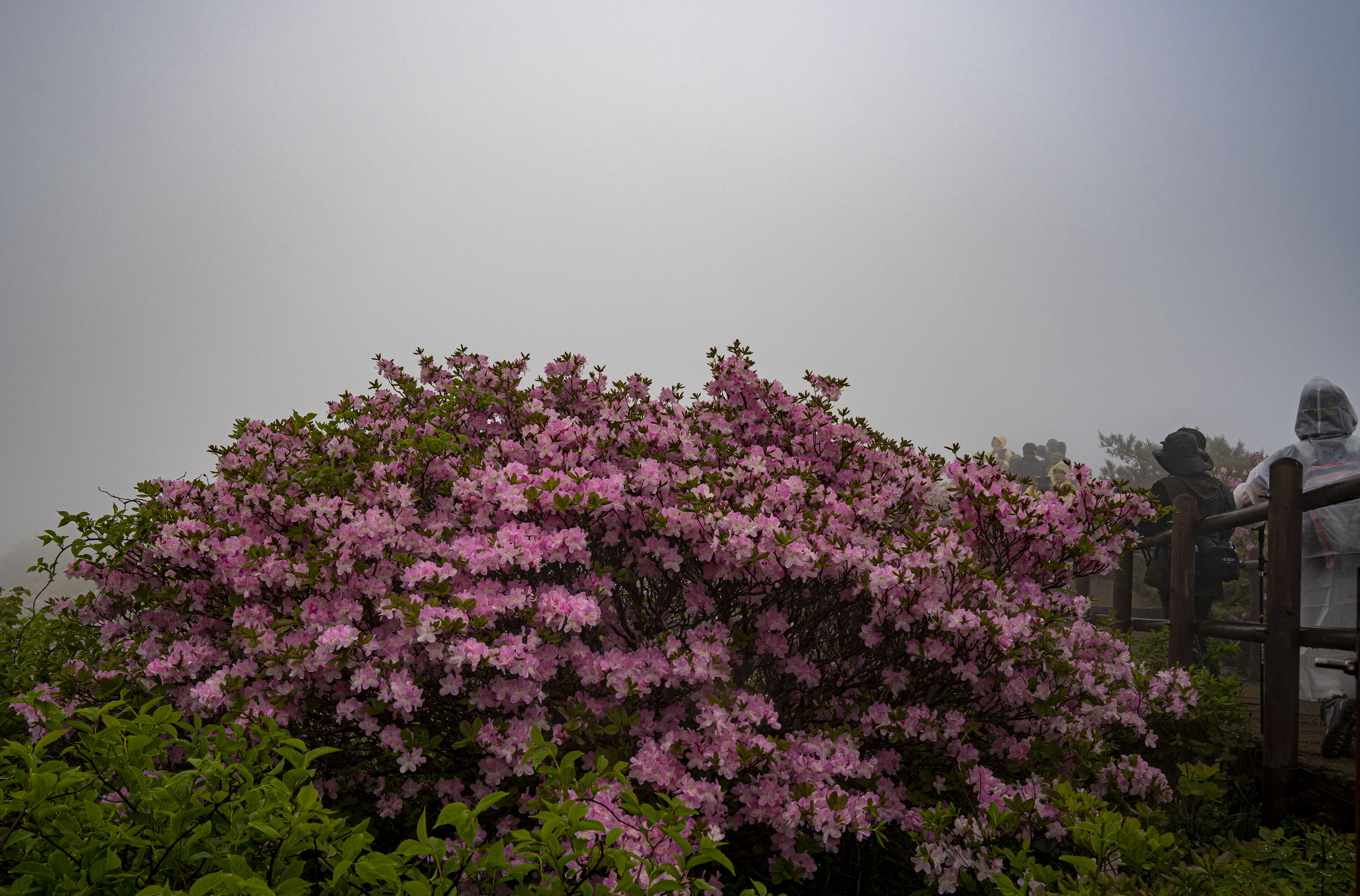 세찬 비바람에 고운 얼굴을 씻기고 있는 연분홍 철쭉의 모습이 선녀 같다.