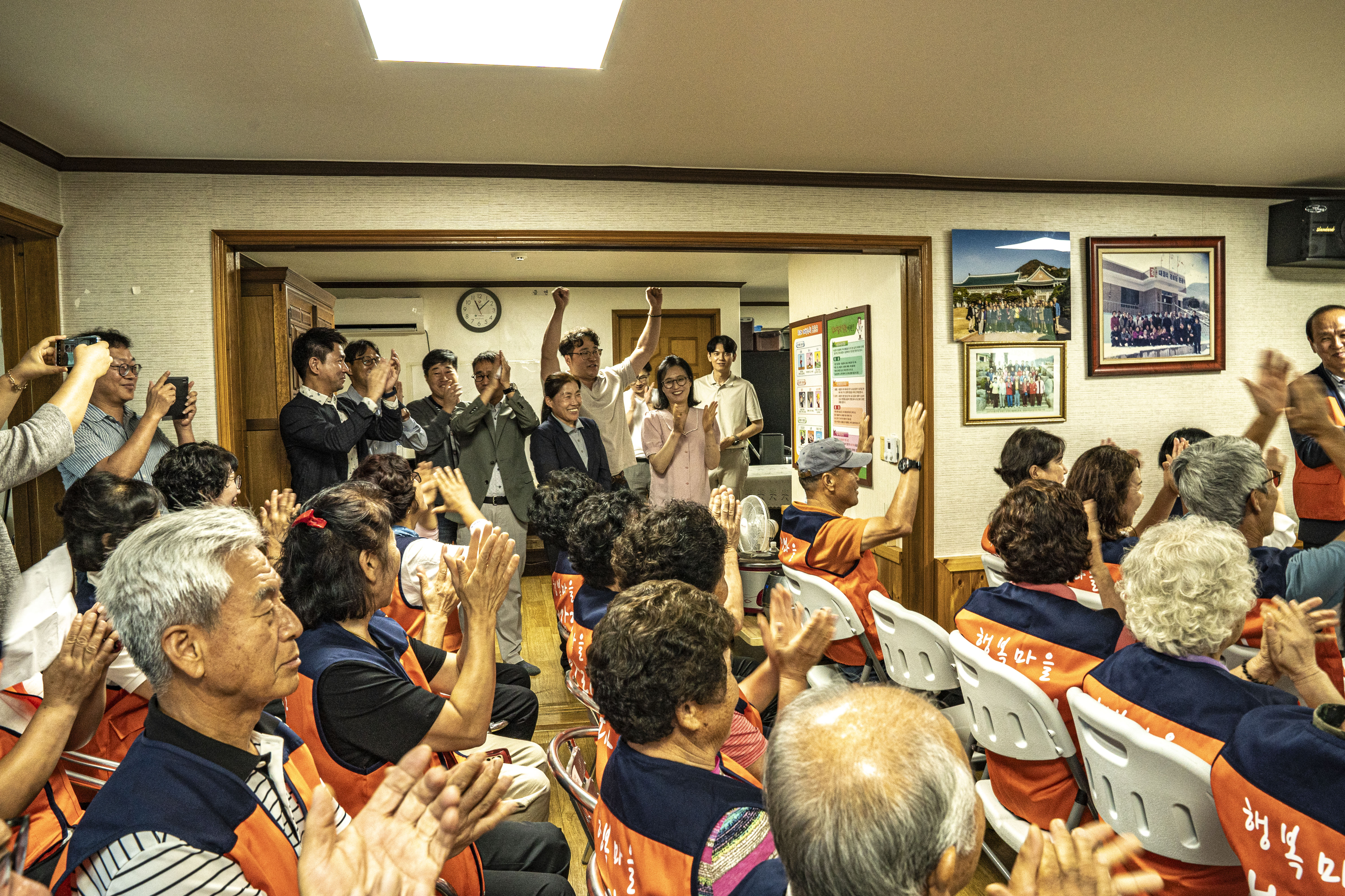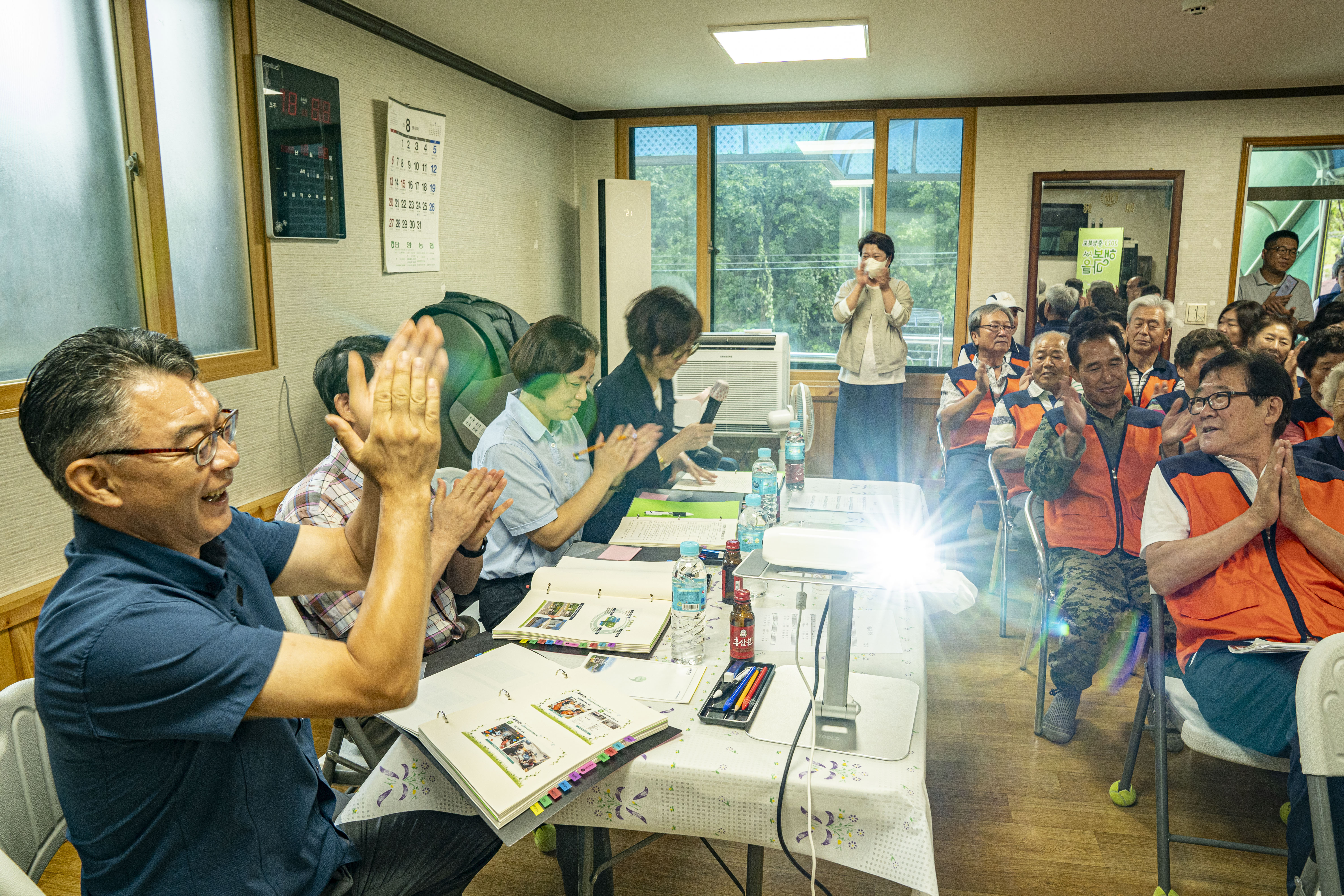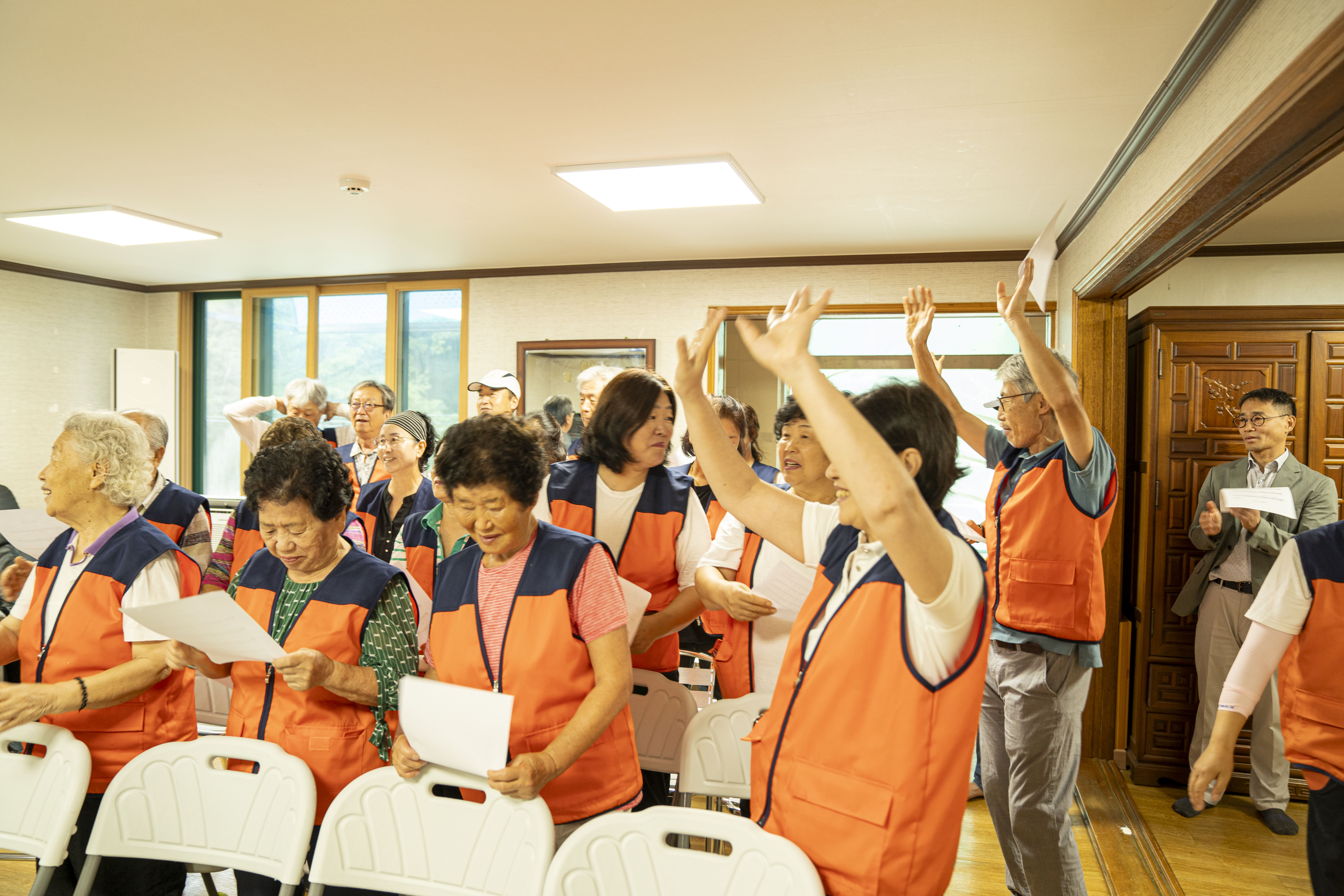 어르신들이 악보를 보고 마을 노래를 부르는 모습이 그야말로 아름다운 모습이다