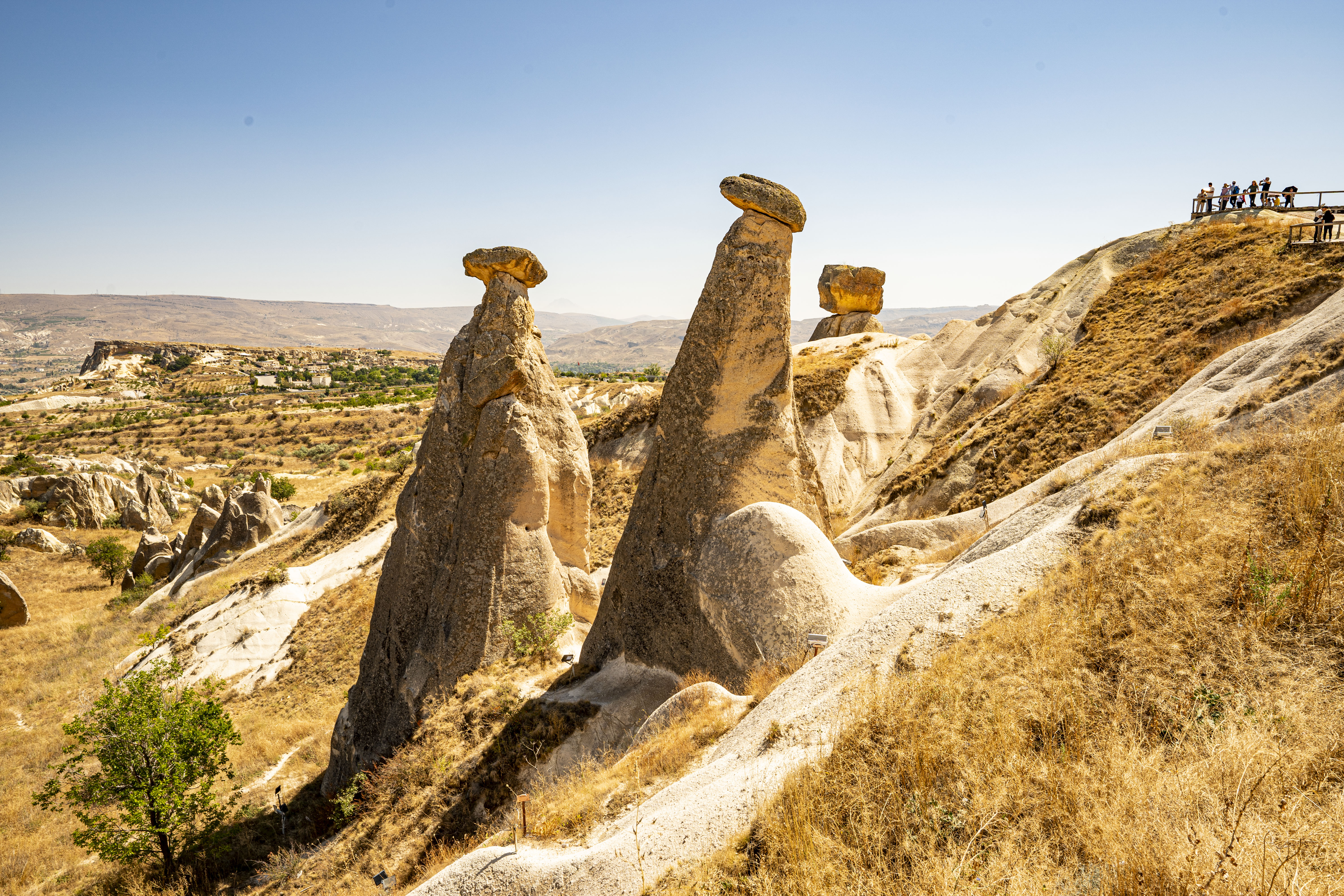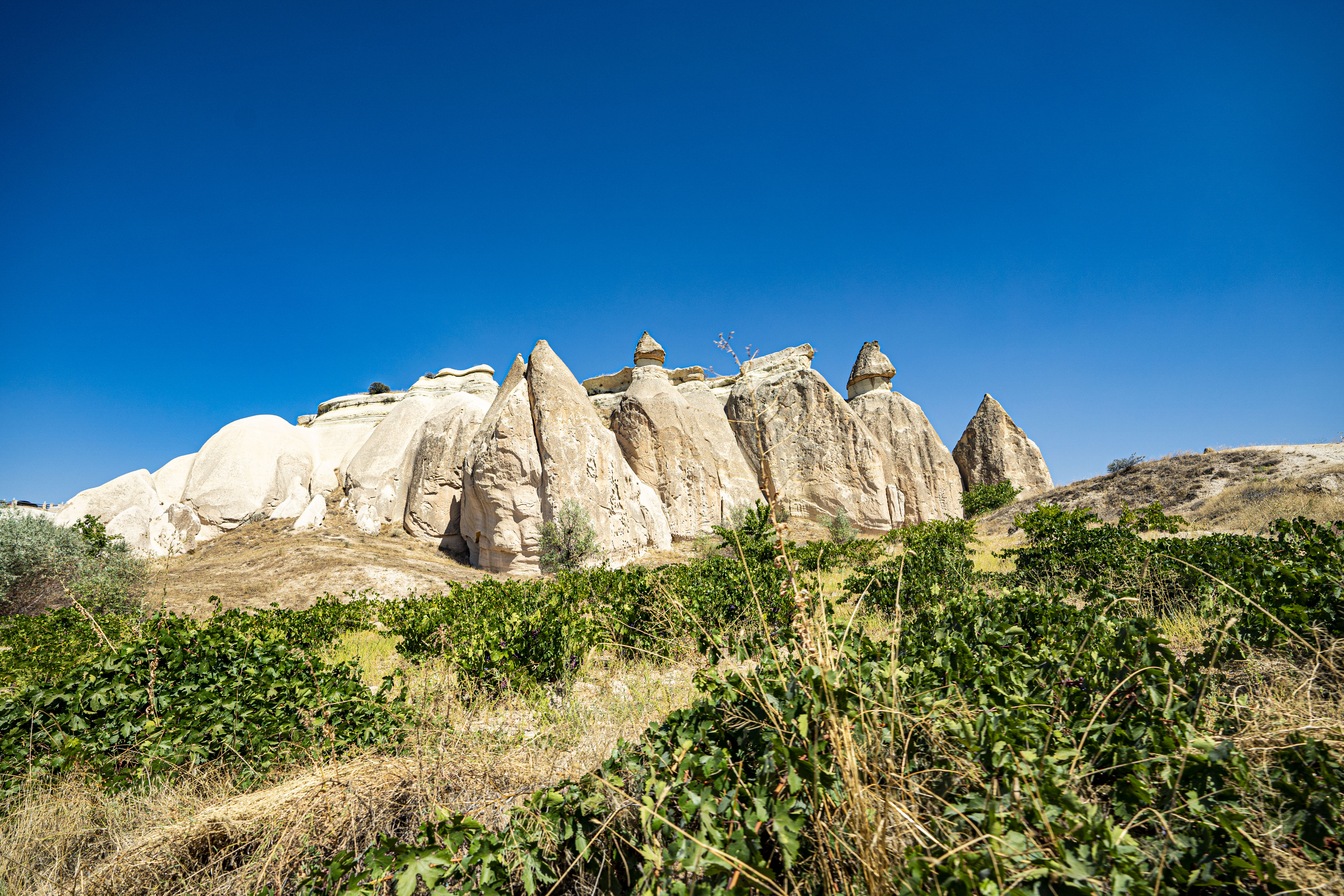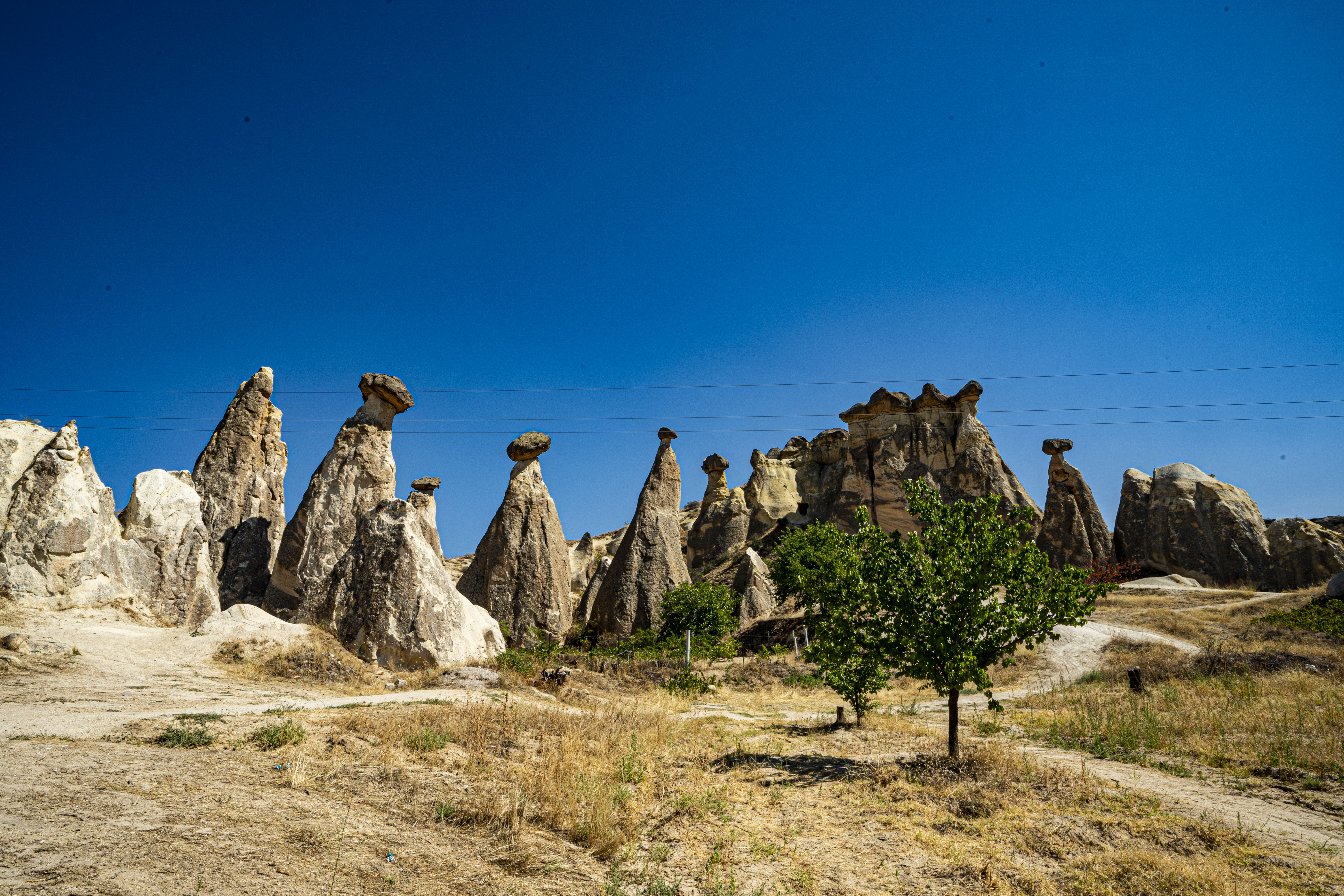 응회암은 하얀 백토같은 약한 지반의 언덕이 파이면서 위에 얻혀진 바위를 바치고 밑은 계속 파이면서 바위를 이고 있는 풍경으로 전체적으로 같은 풍경을 보인다