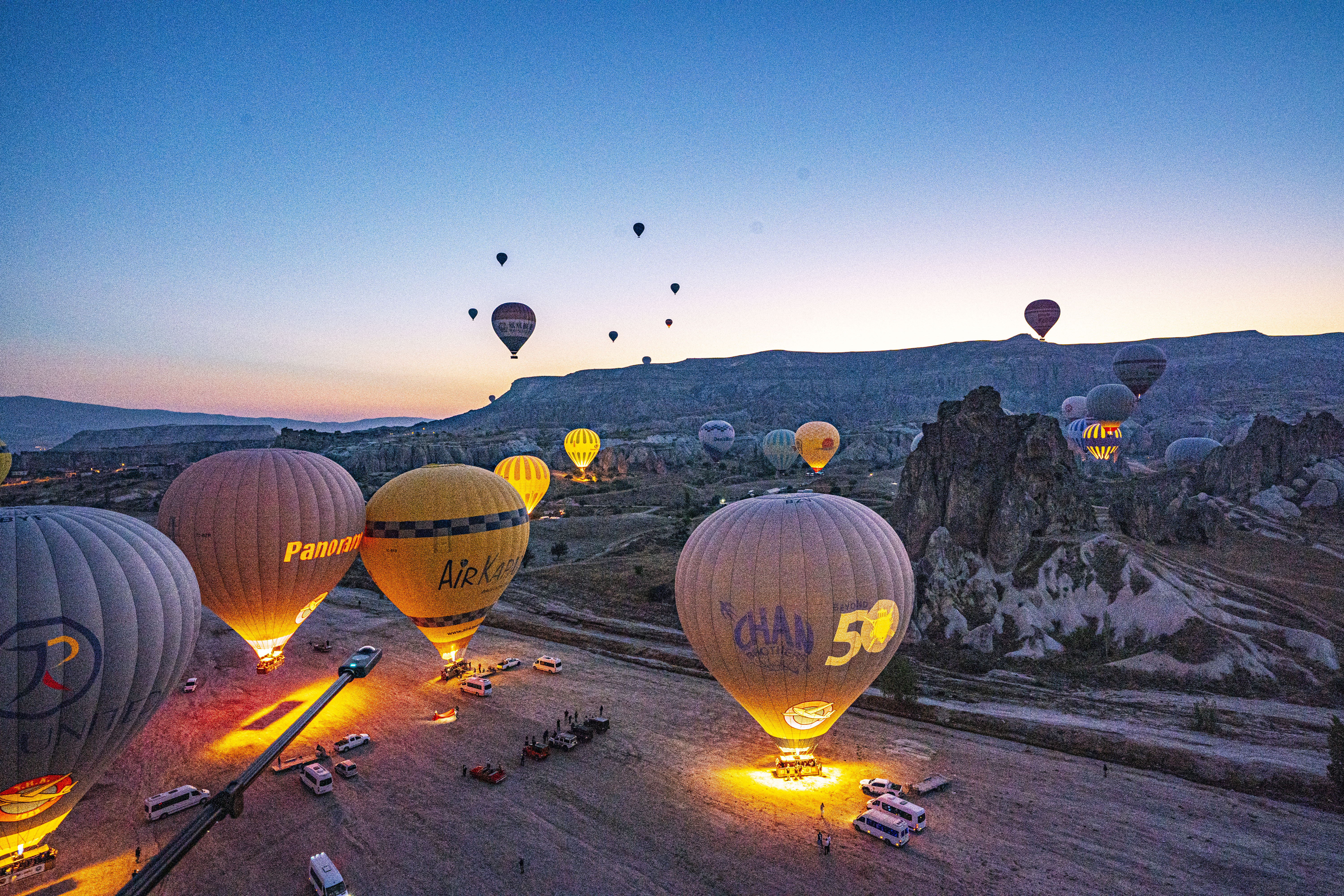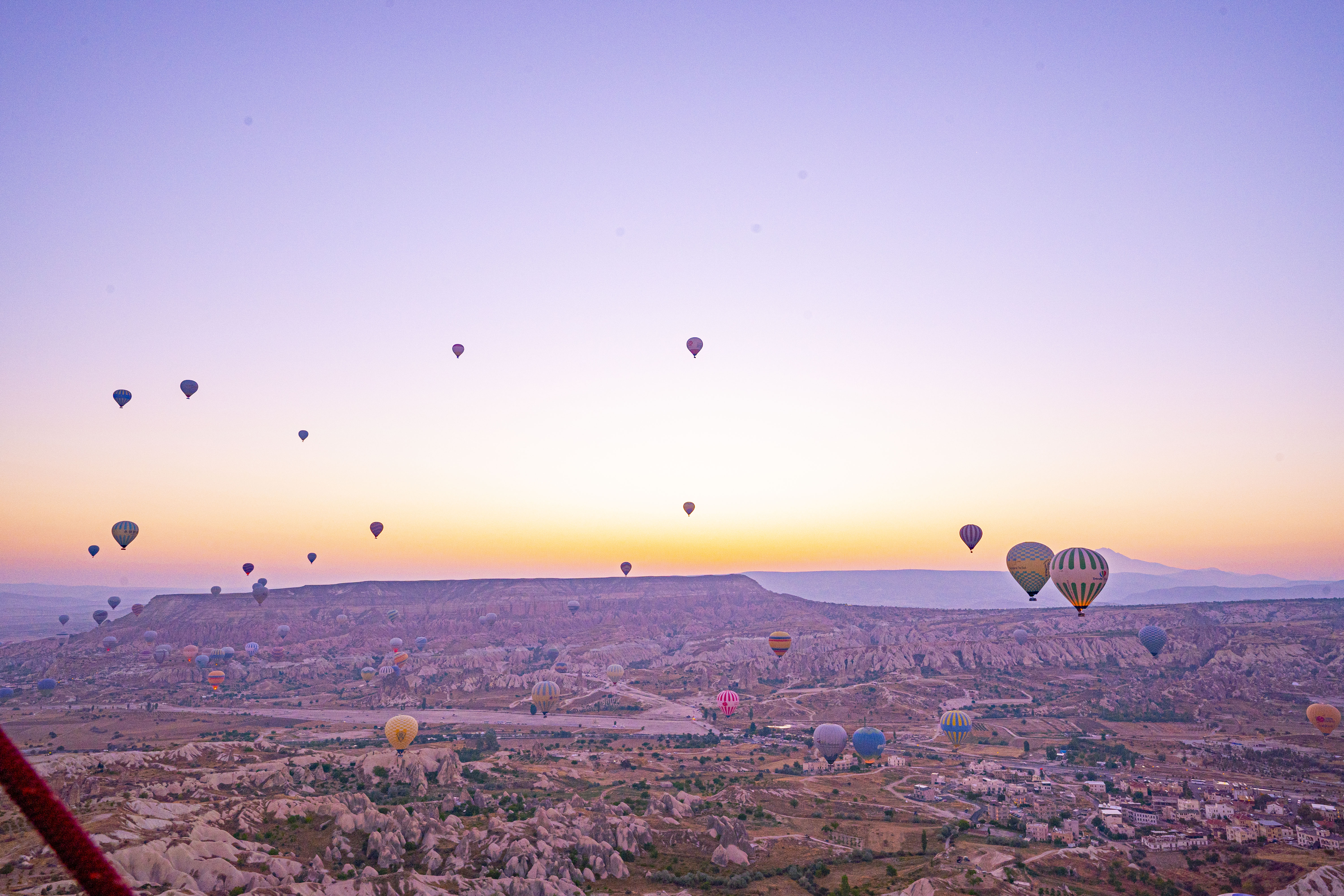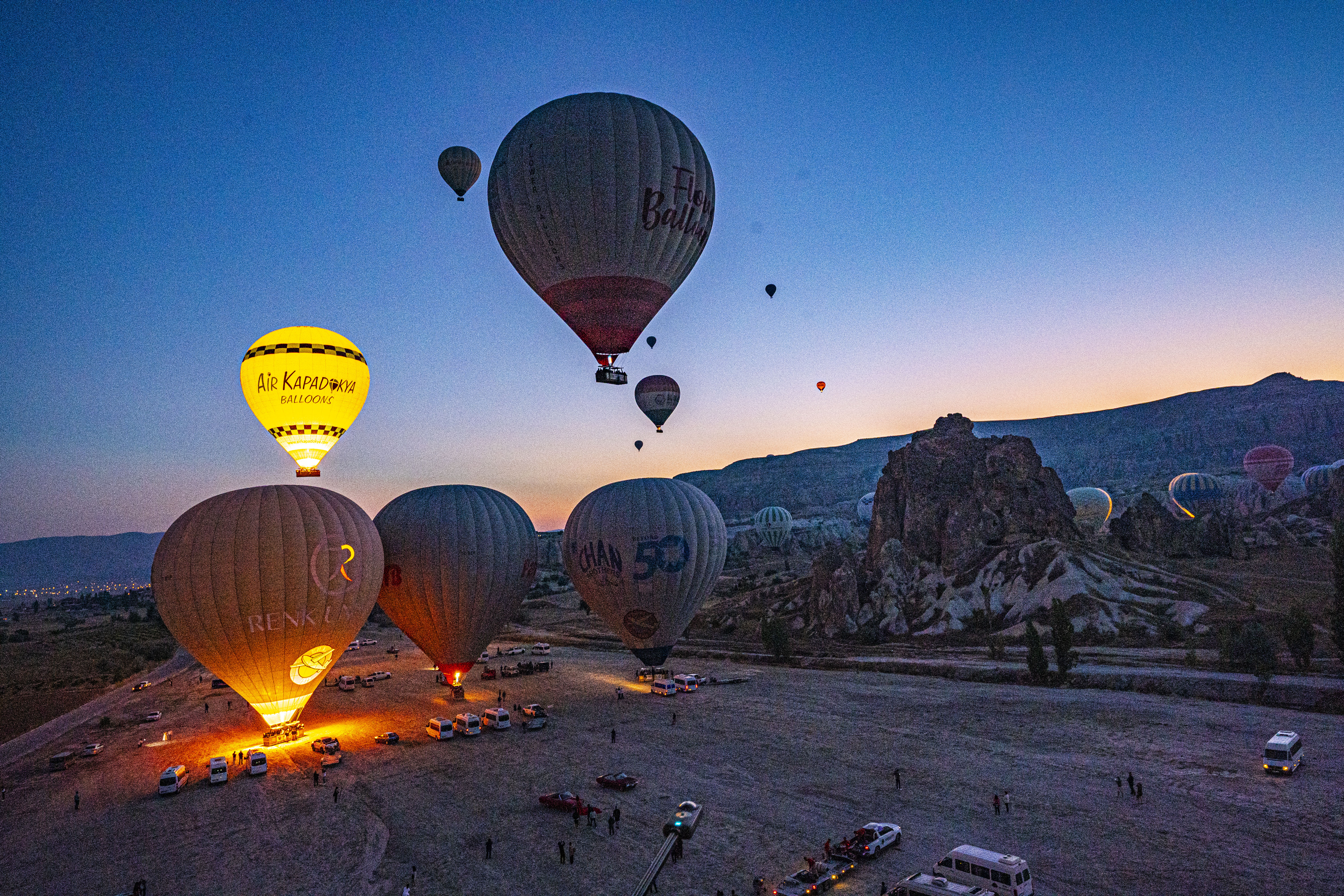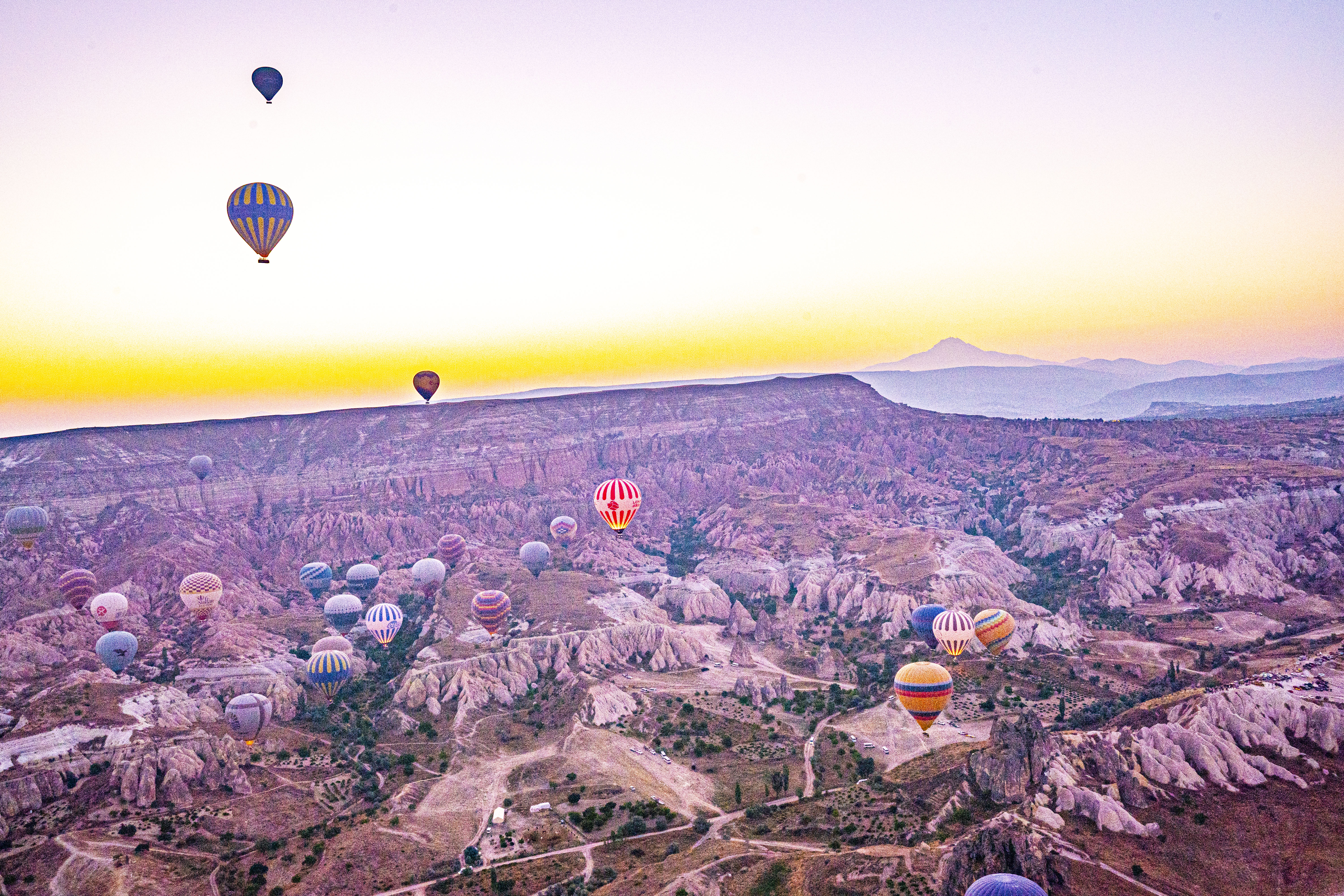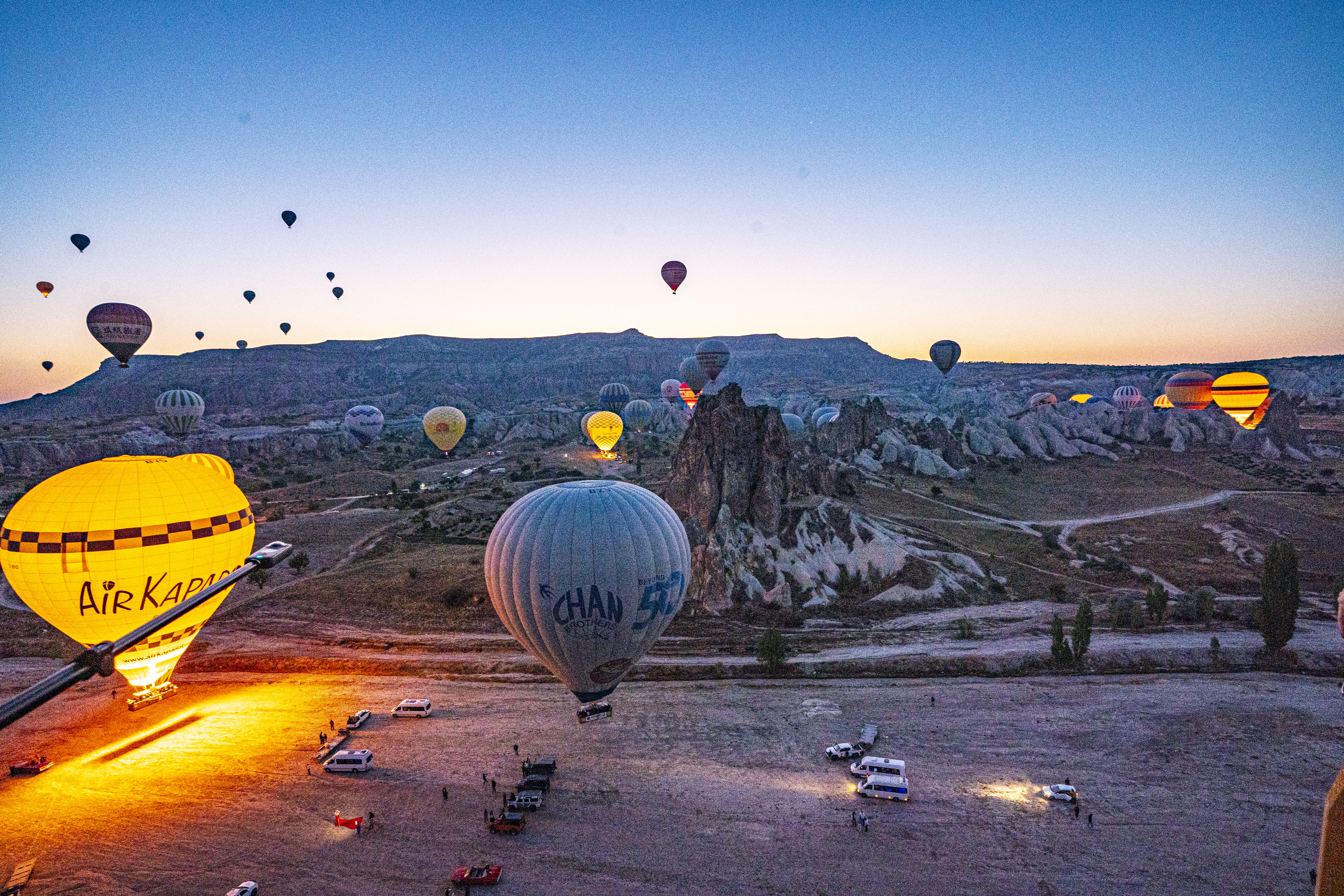 낮게 깔린 응회암 바위 펼쳐진 기기묘묘한 지상에 동쪽으로 여명이 밝아오는 낮은 평원에 수 많은 풍선이 뜬 풍경은 실제로 너무나 아름다운 풍경이다