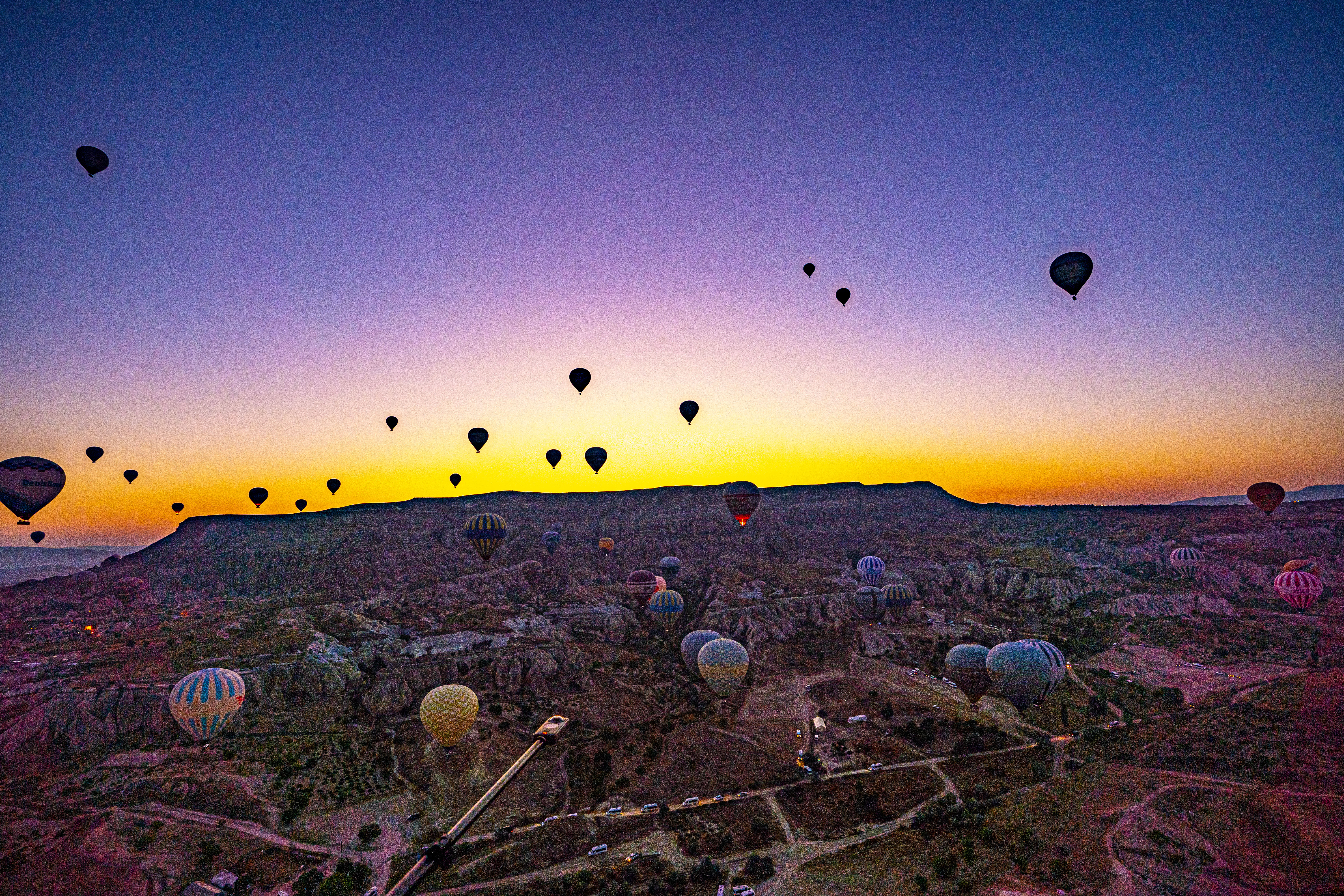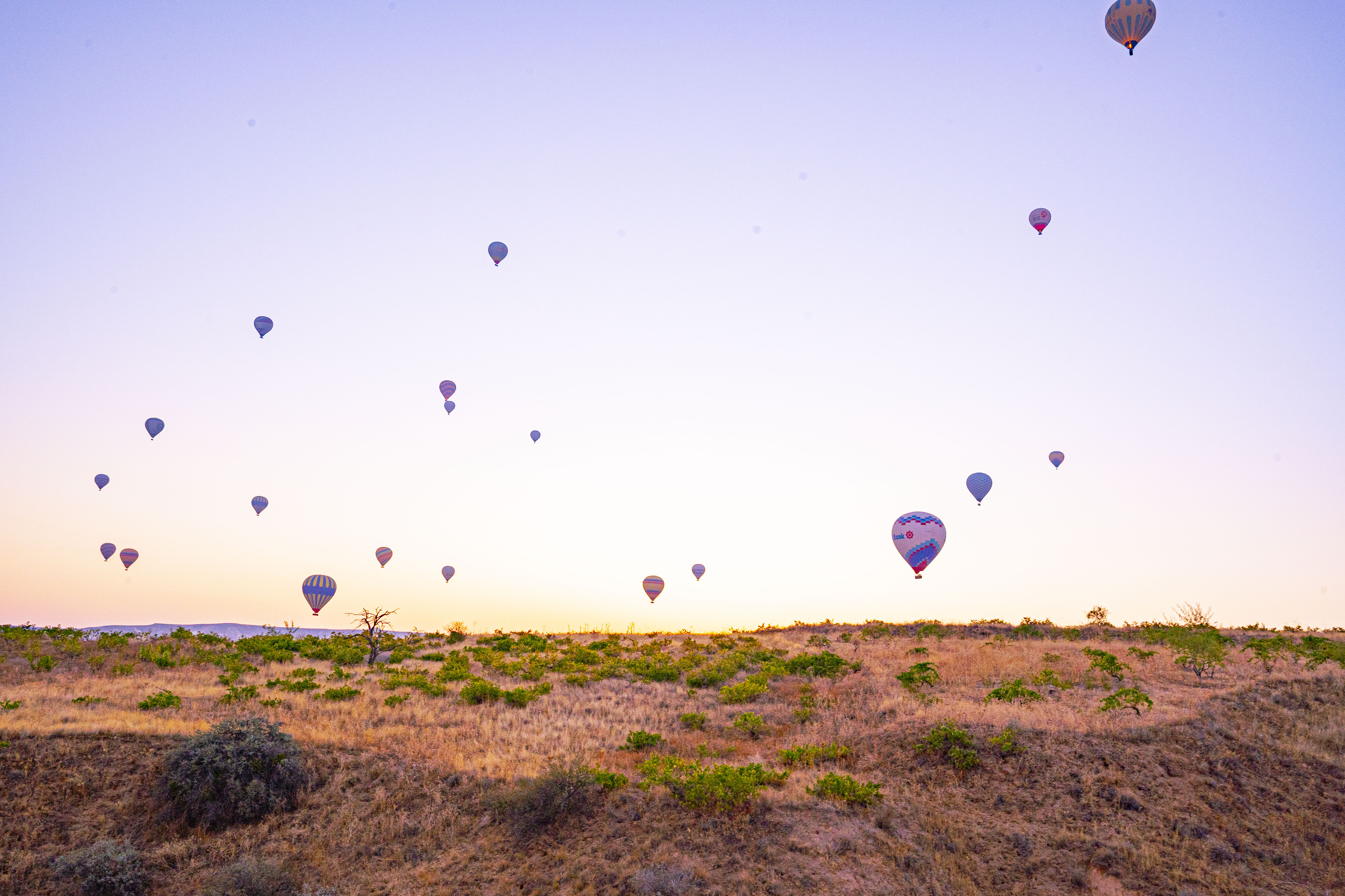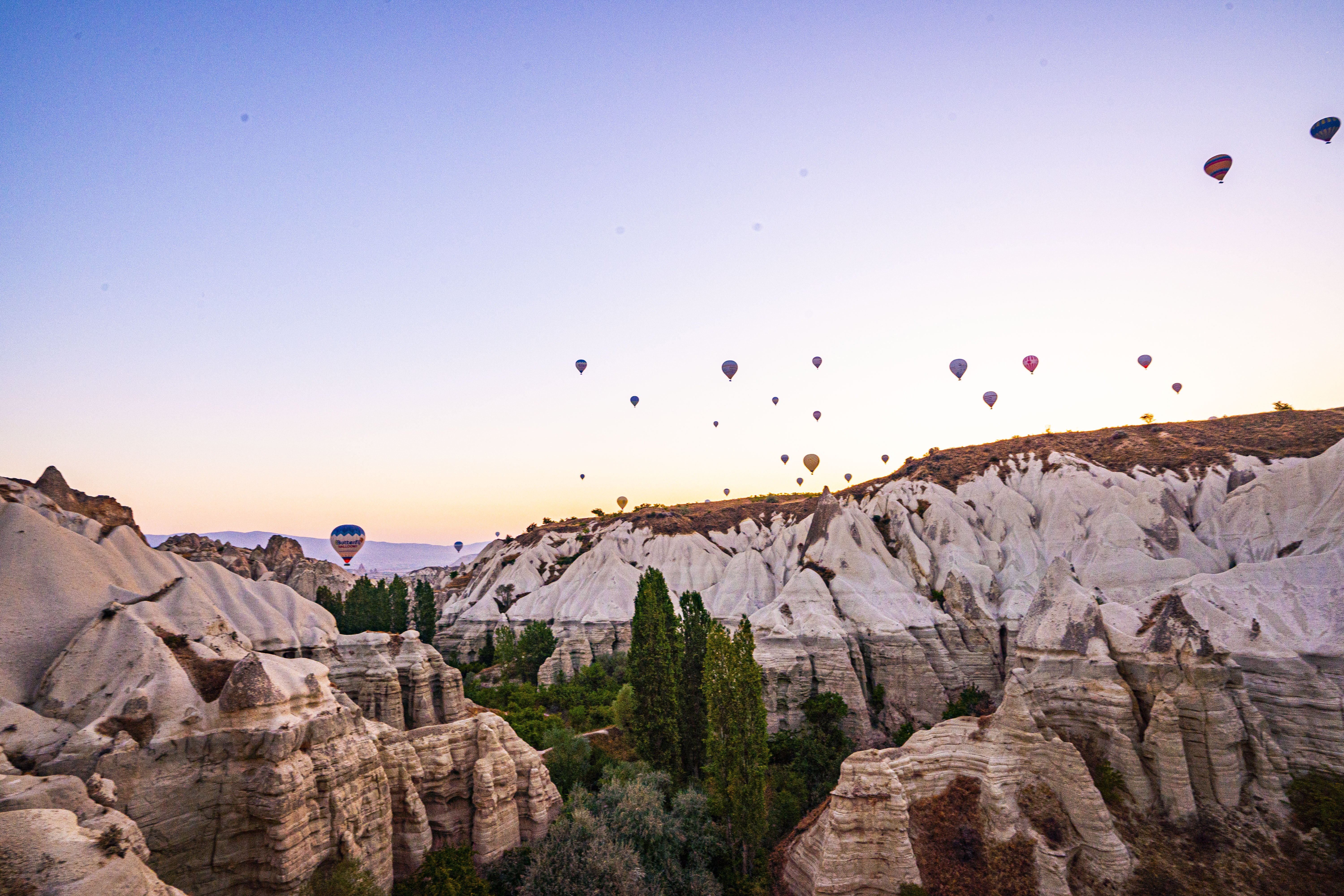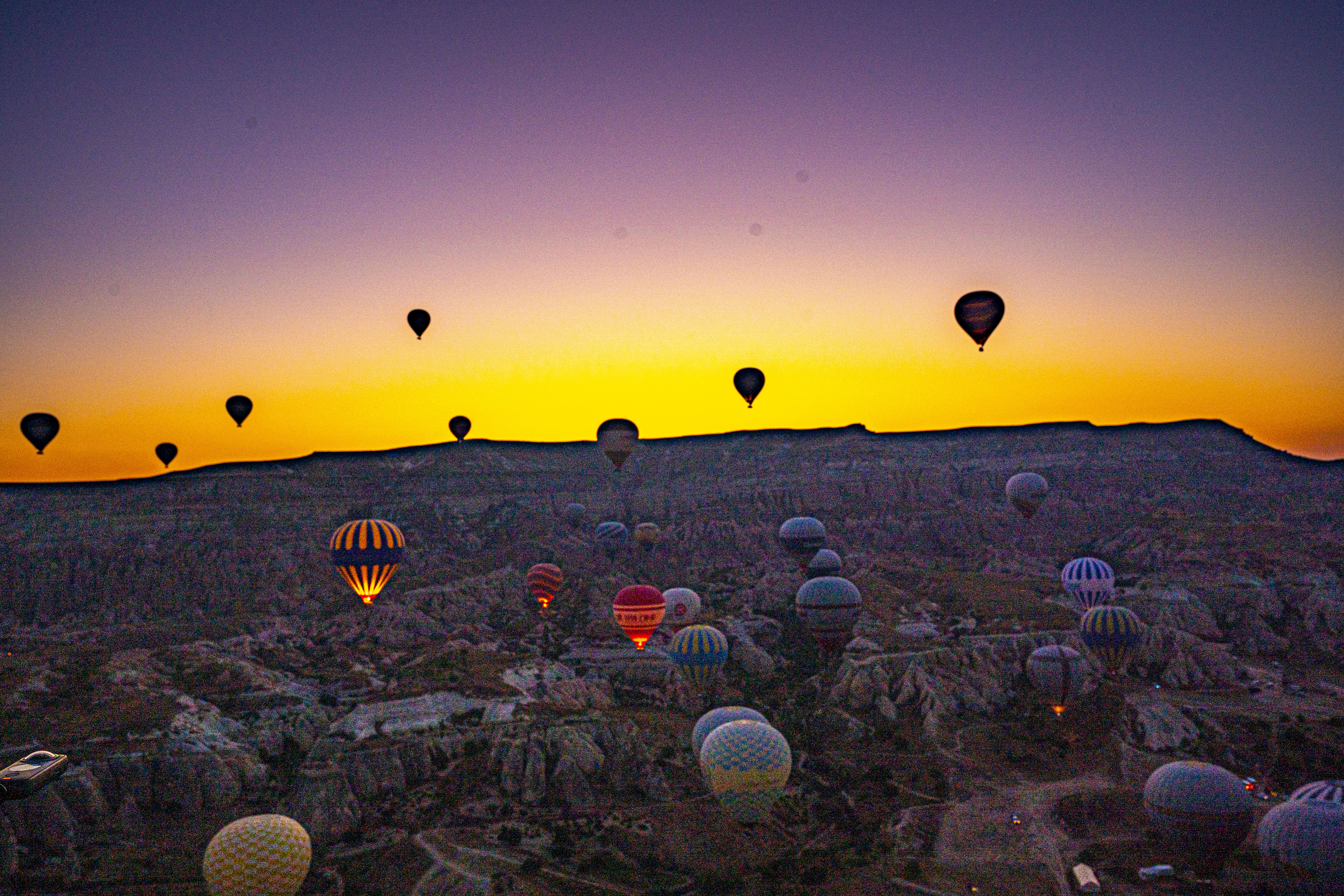 낮게 깔린 응회암 바위 펼쳐진 기기묘묘한 지상에 동쪽으로 여명이 밝아오는 낮은 평원에 수 많은 풍선이 뜬 풍경은 실제로 너무나 아름다운 풍경이다