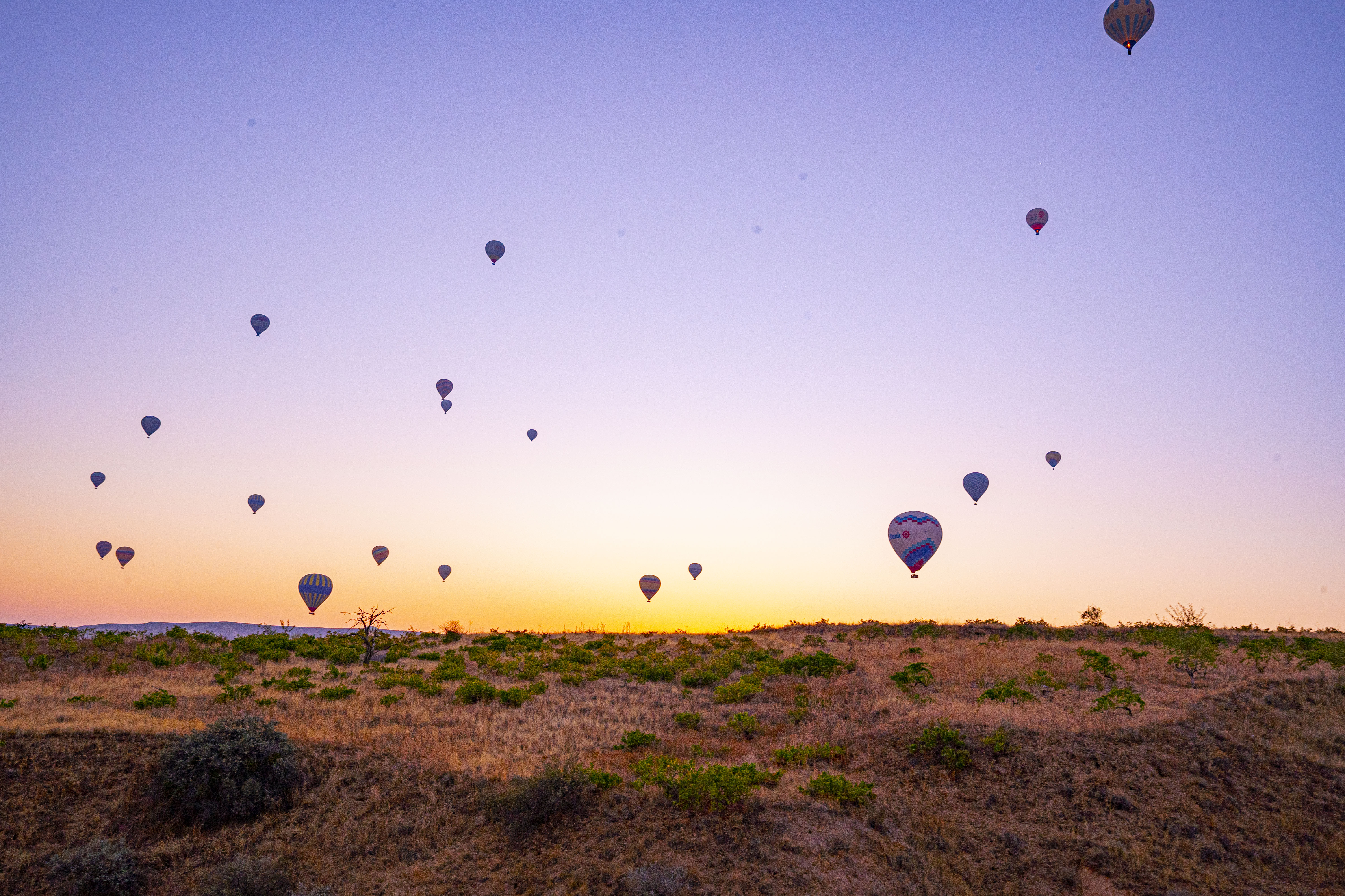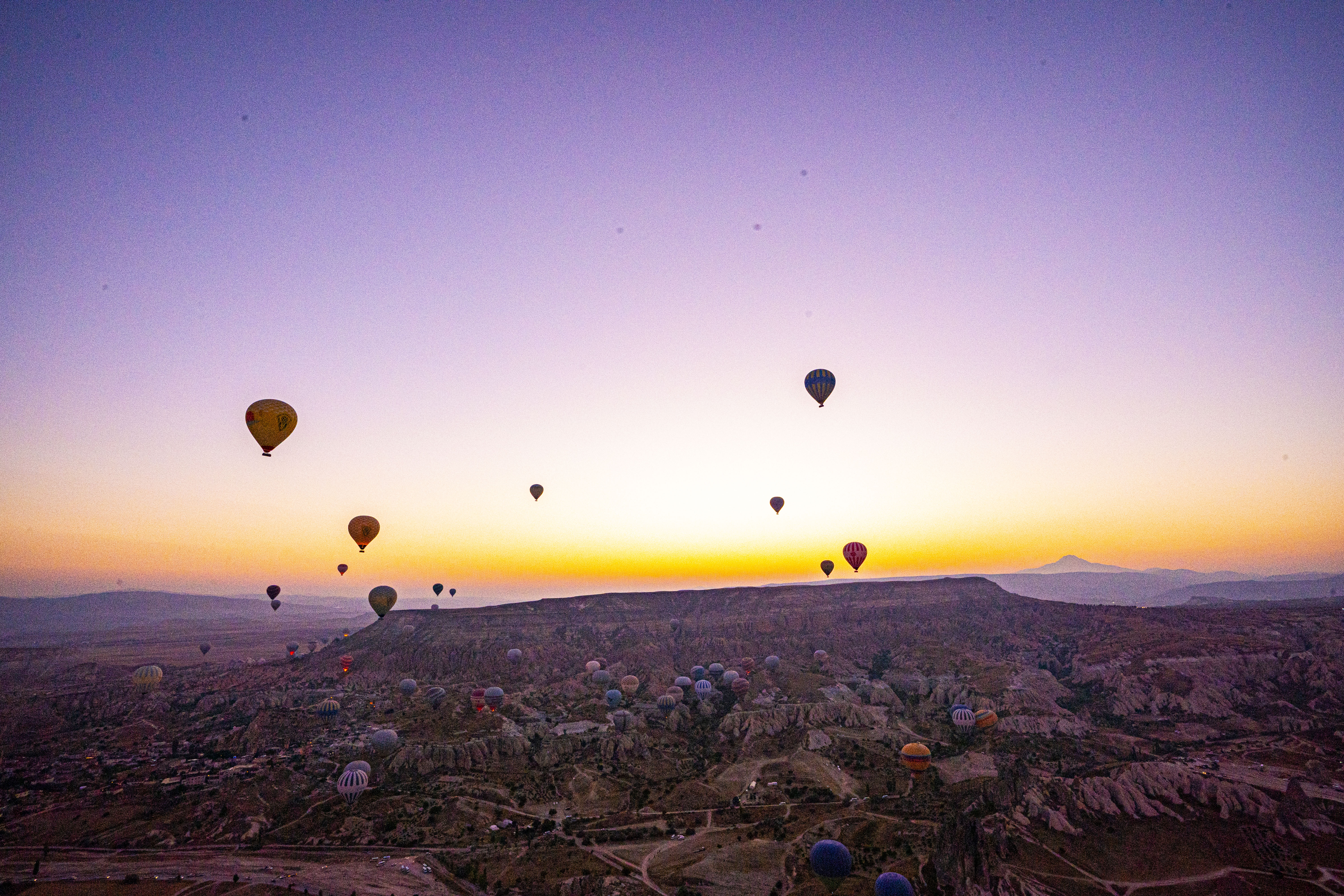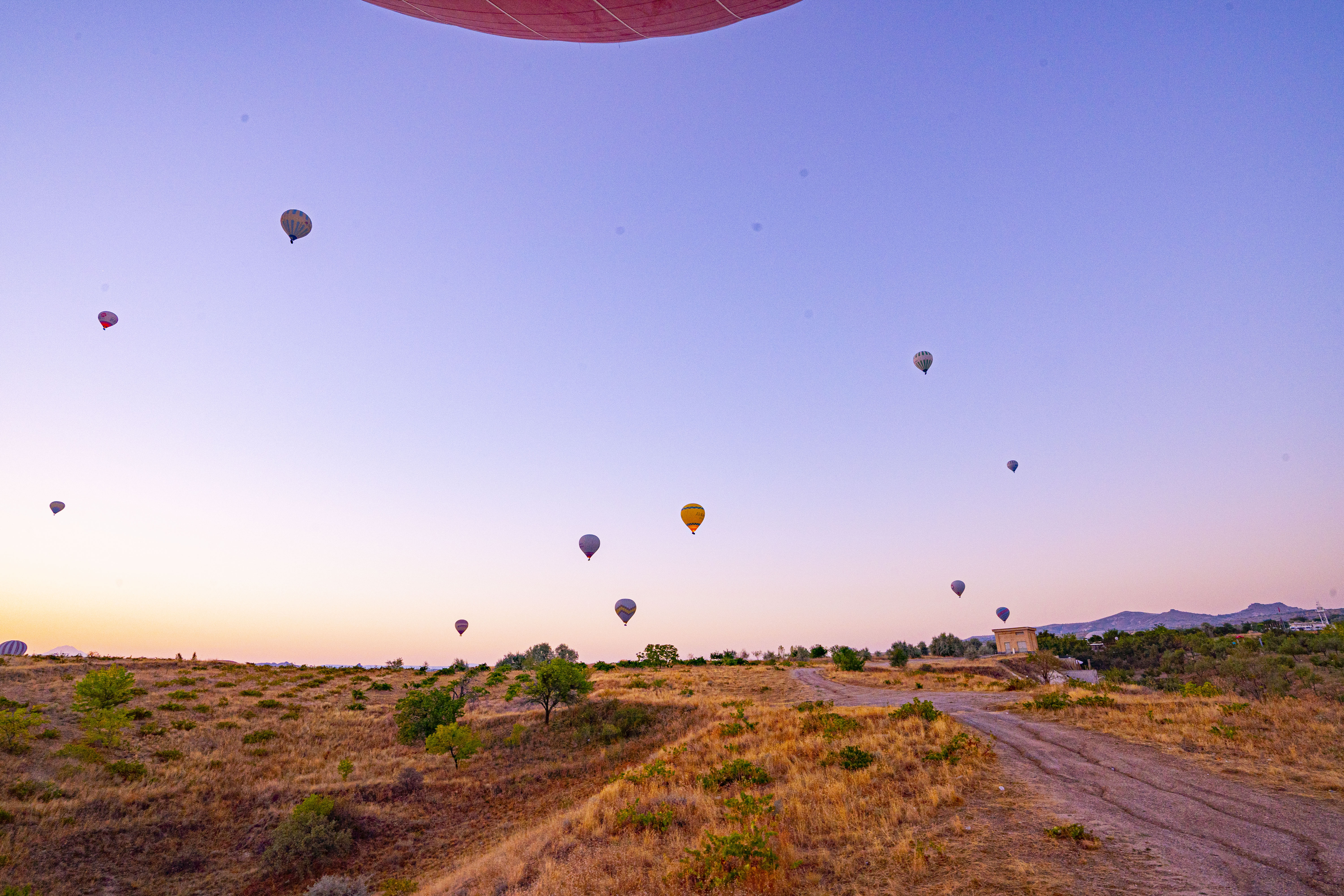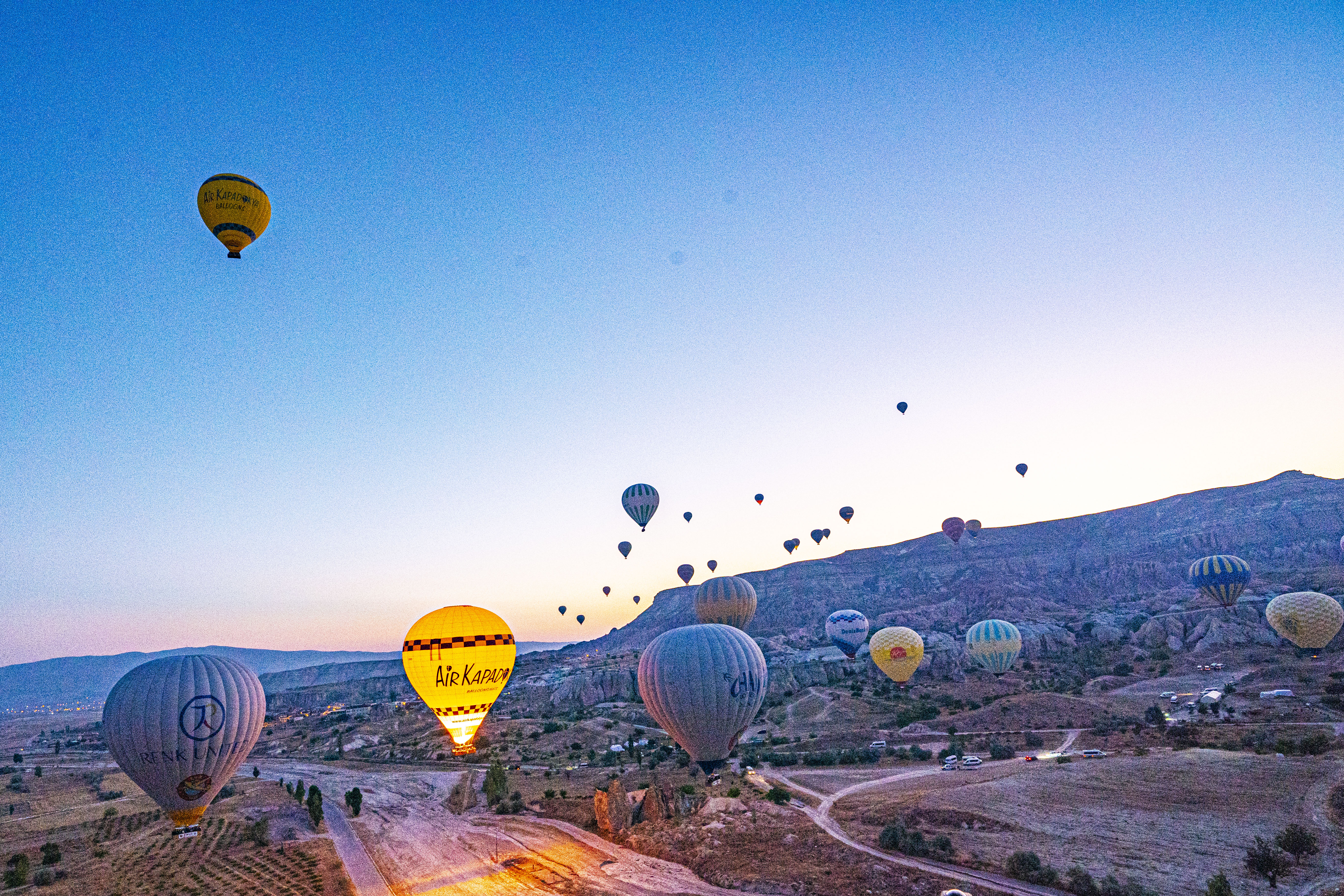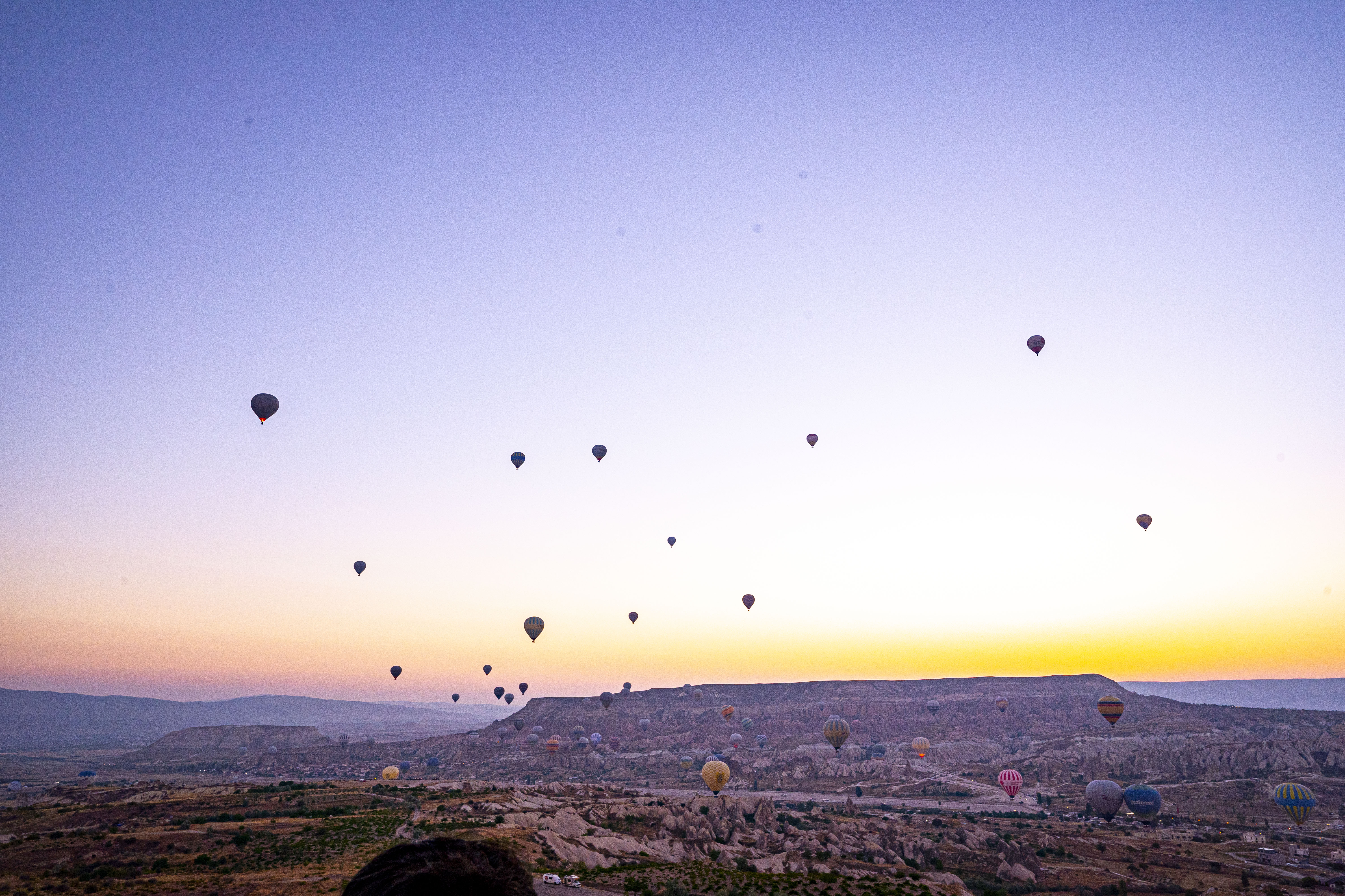 낮게 깔린 응회암 바위 펼쳐진 기기묘묘한 지상에 동쪽으로 여명이 밝아오는 낮은 평원에 수 많은 풍선이 뜬 풍경은 실제로 너무나 아름다운 풍경이다