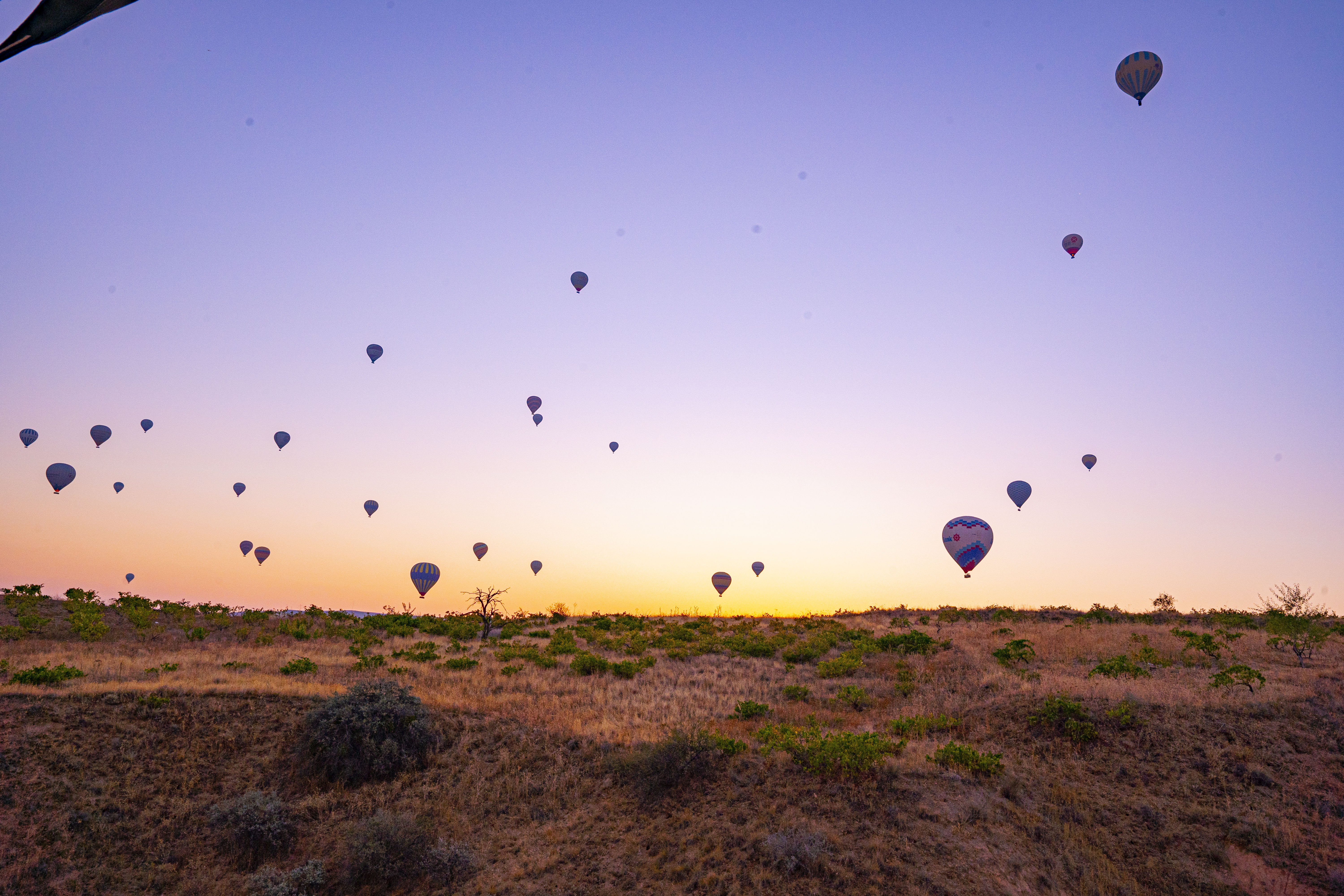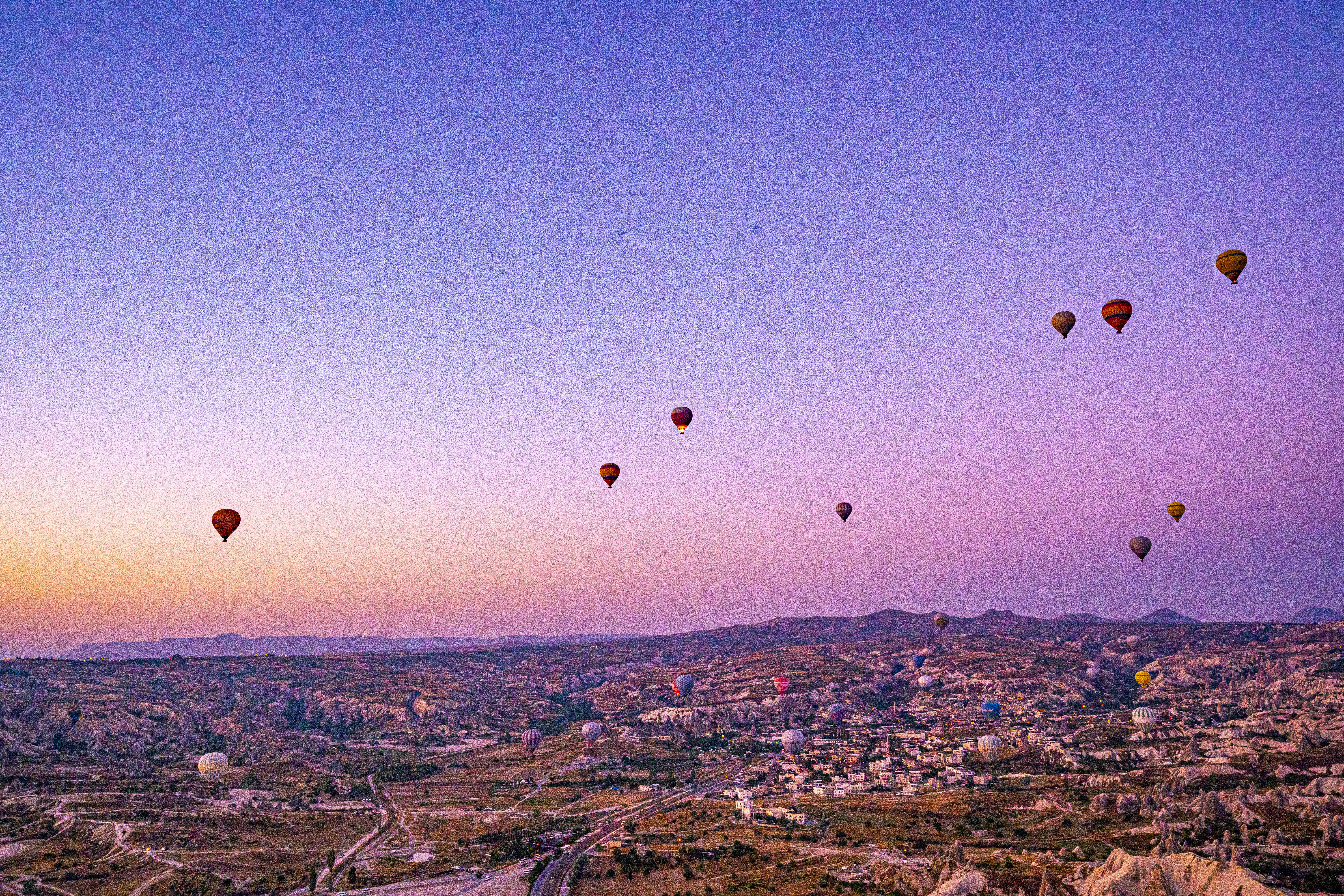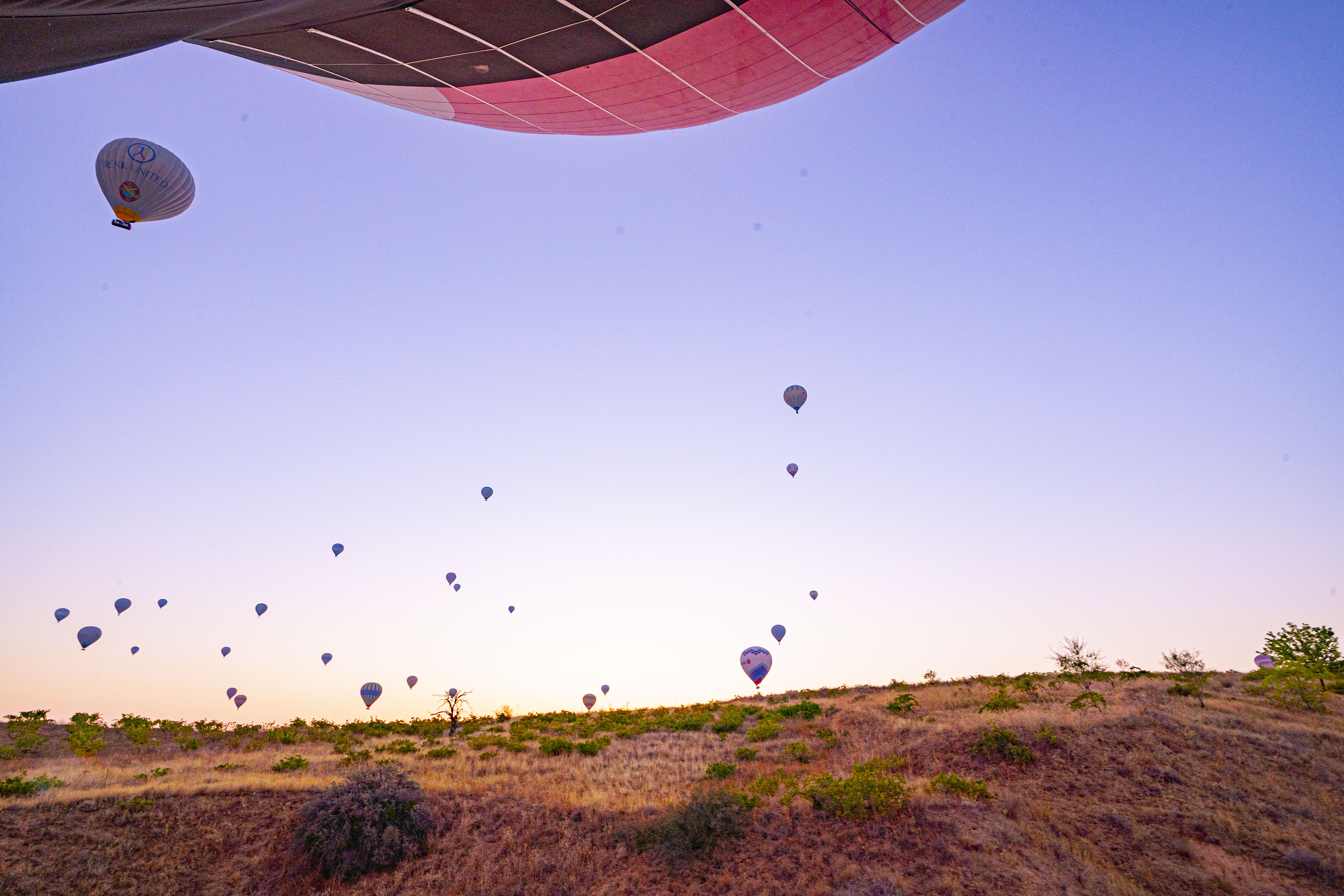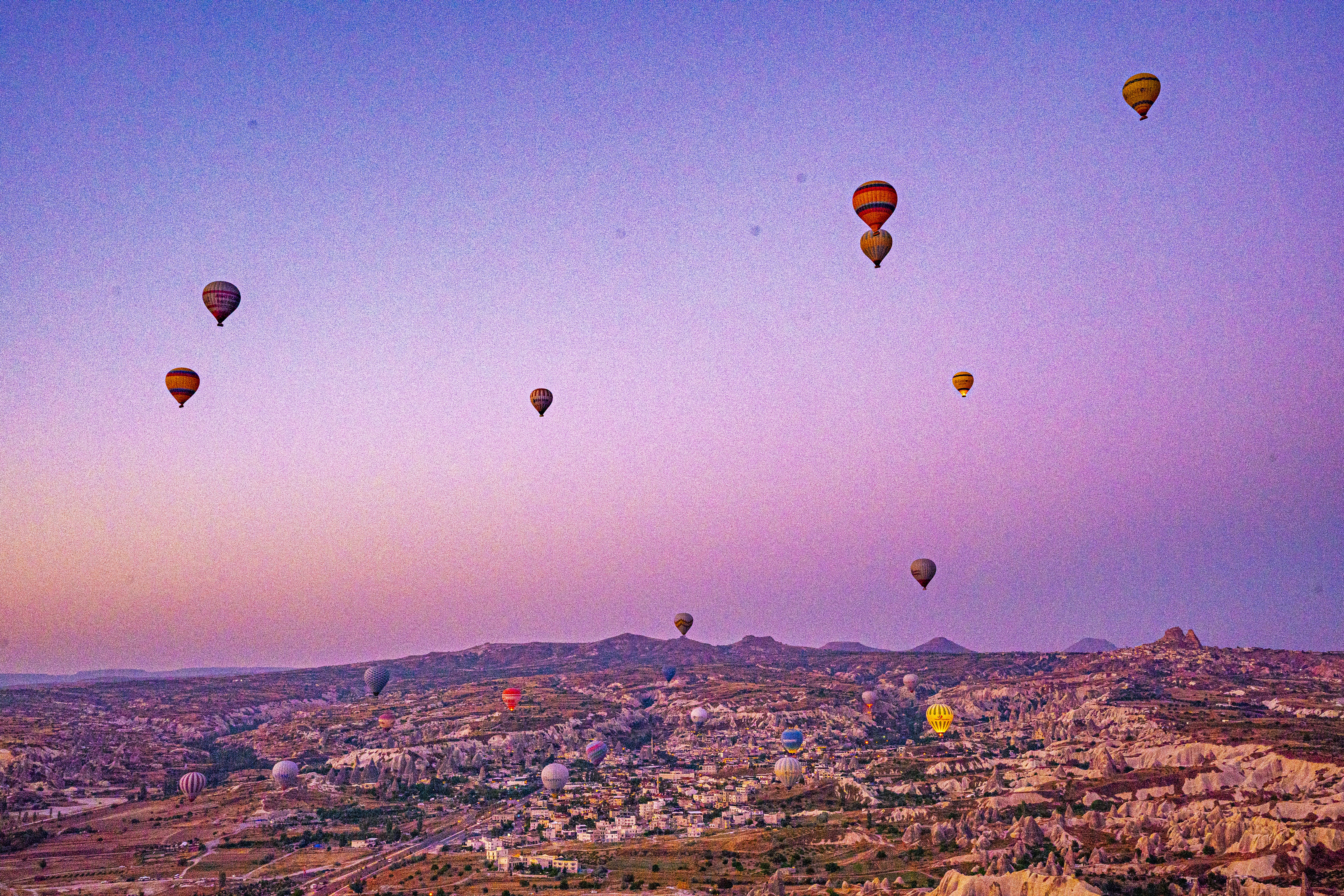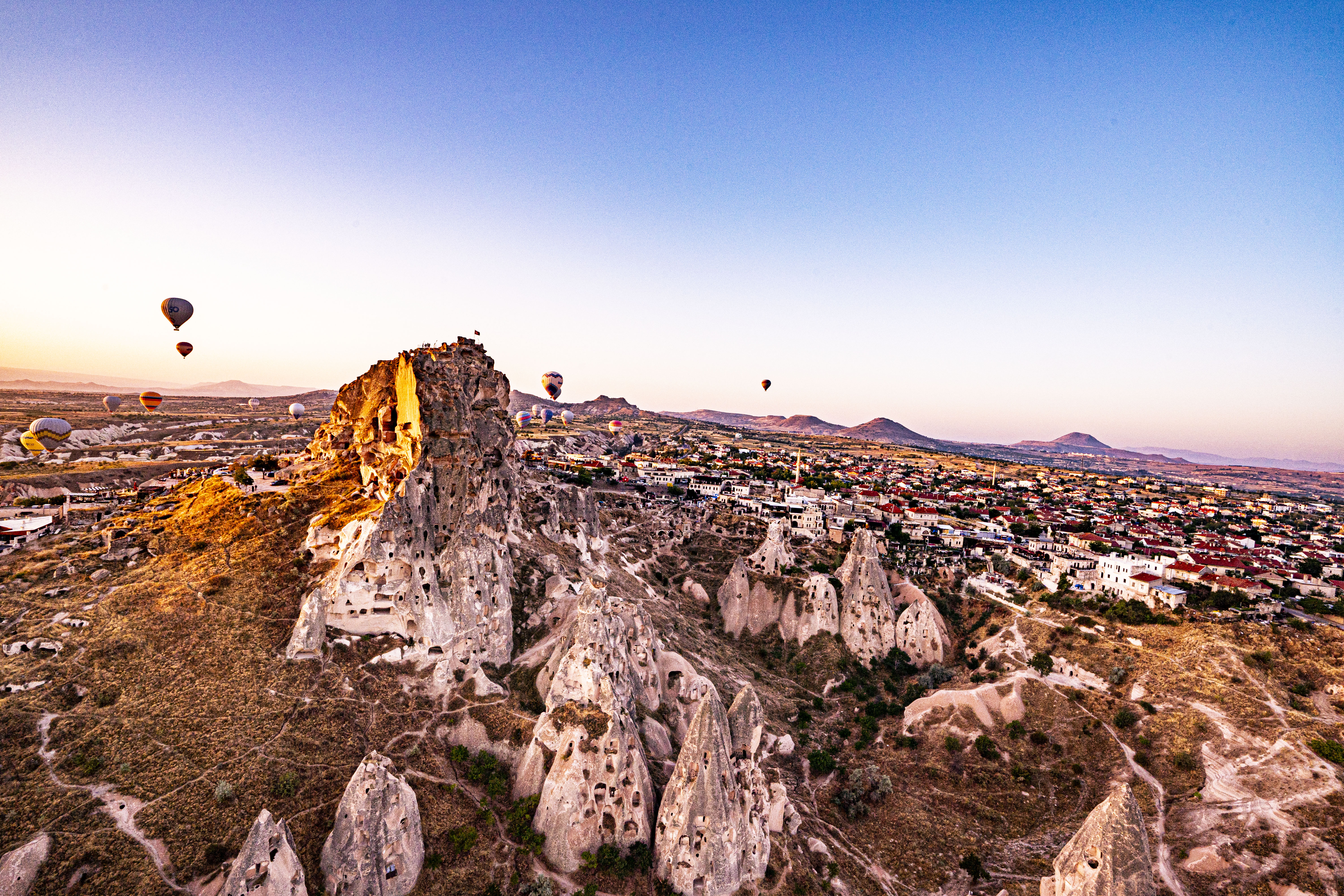 낮게 깔린 응회암 바위 펼쳐진 기기묘묘한 지상에 동쪽으로 여명이 밝아오는 낮은 평원에 수 많은 풍선이 뜬 풍경은 실제로 너무나 아름다운 풍경이다