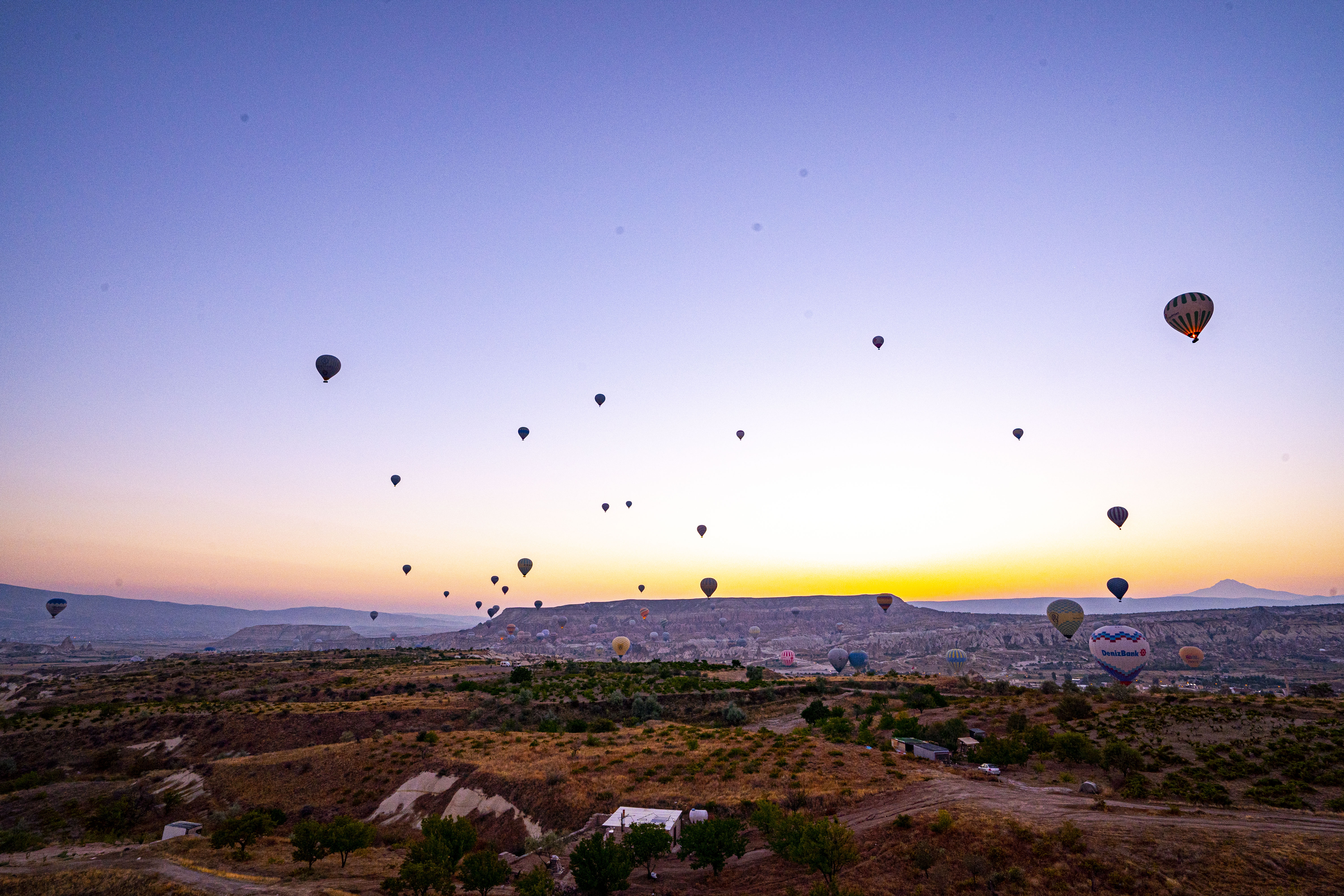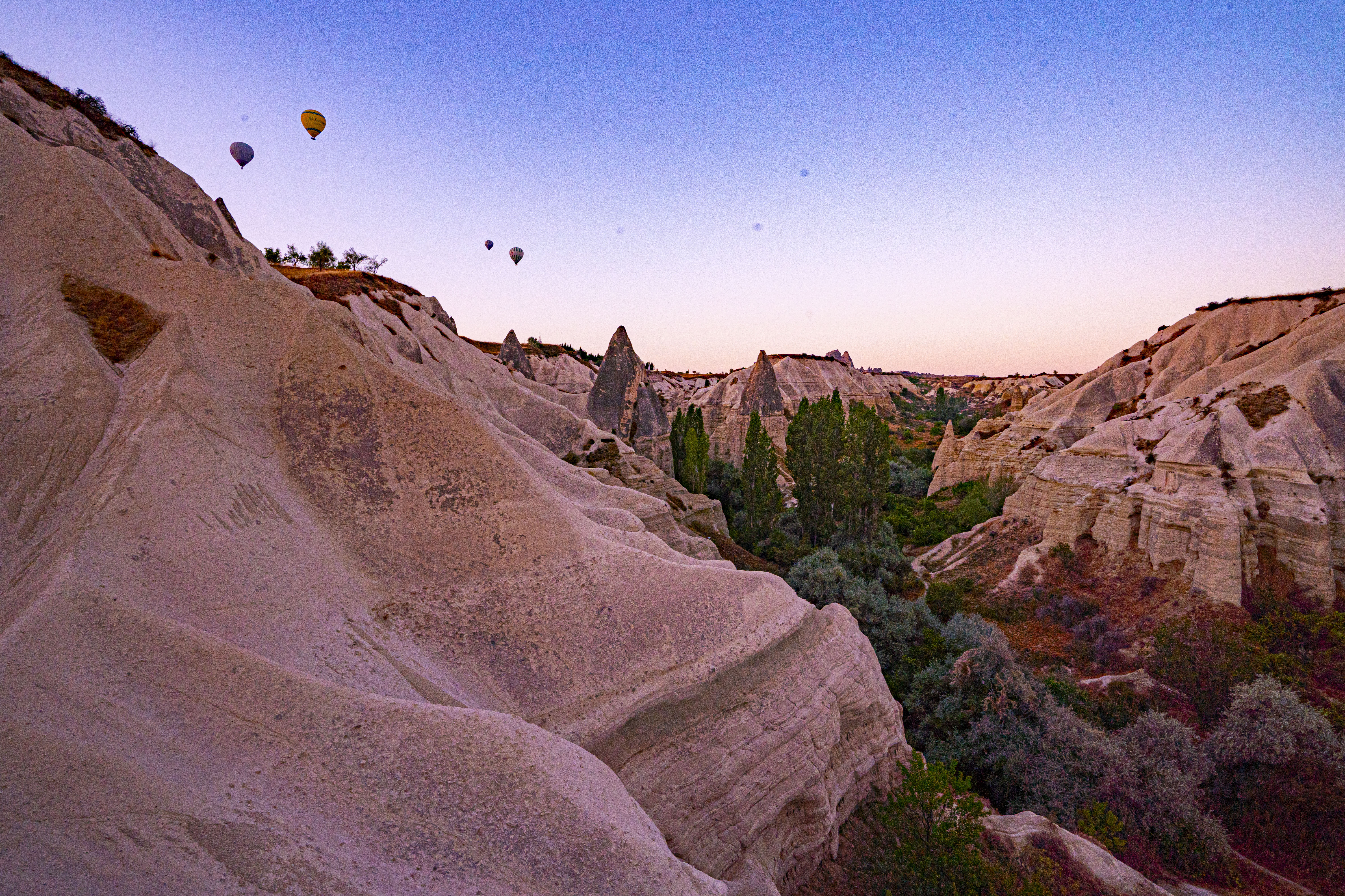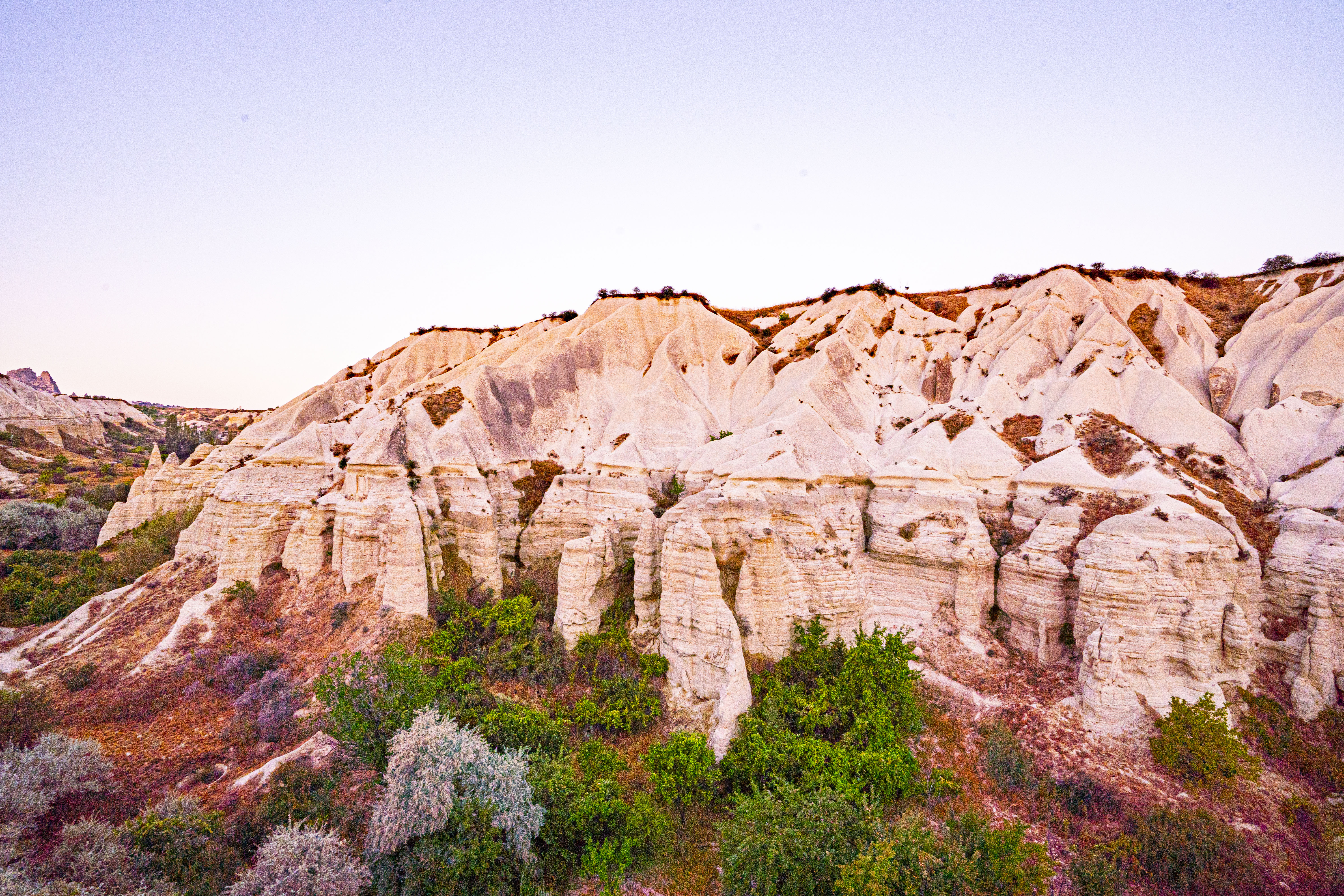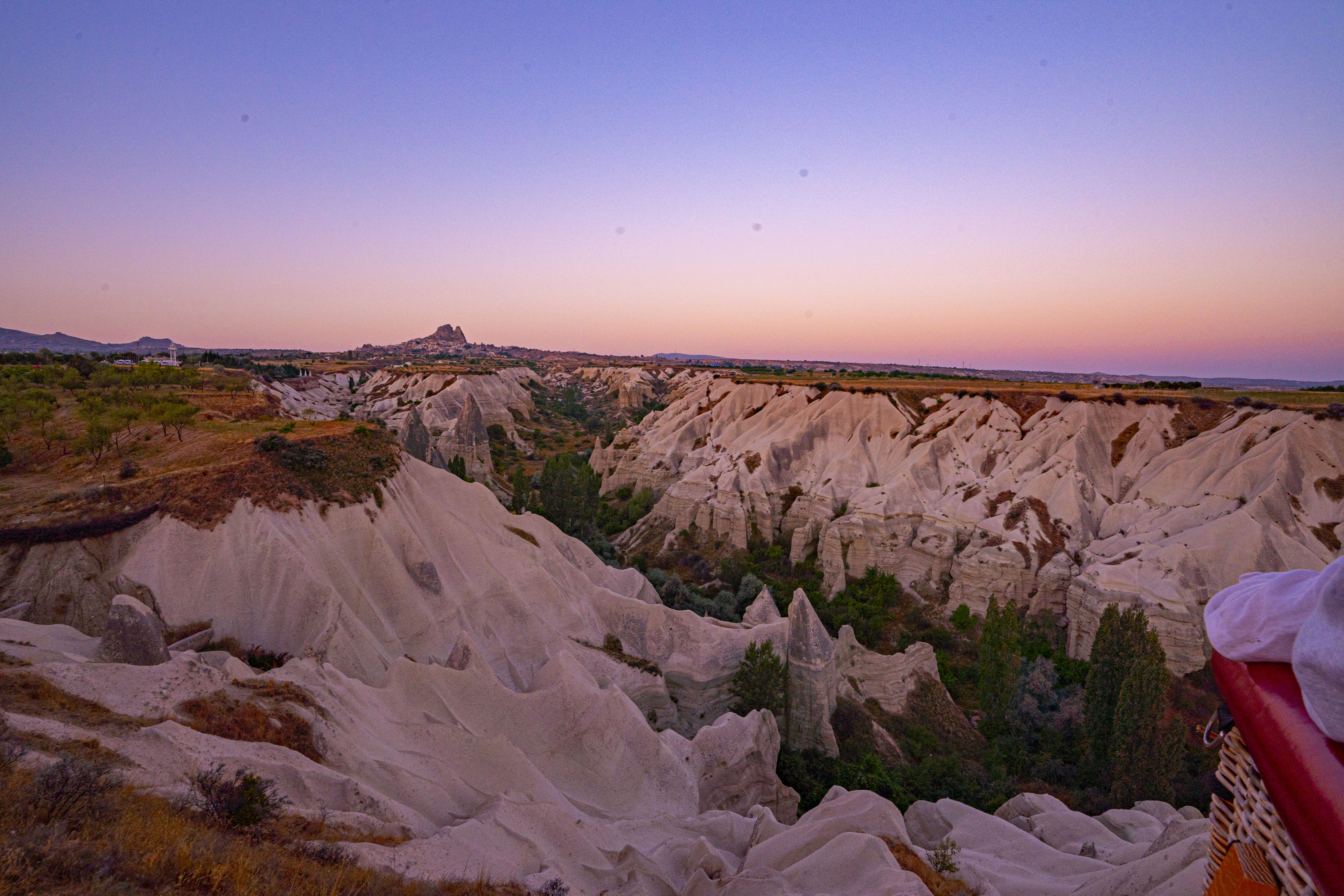 낮게 깔린 응회암 바위 펼쳐진 기기묘묘한 지상에 동쪽으로 여명이 밝아오는 낮은 평원에 수 많은 풍선이 뜬 풍경은 실제로 너무나 아름다운 풍경이다