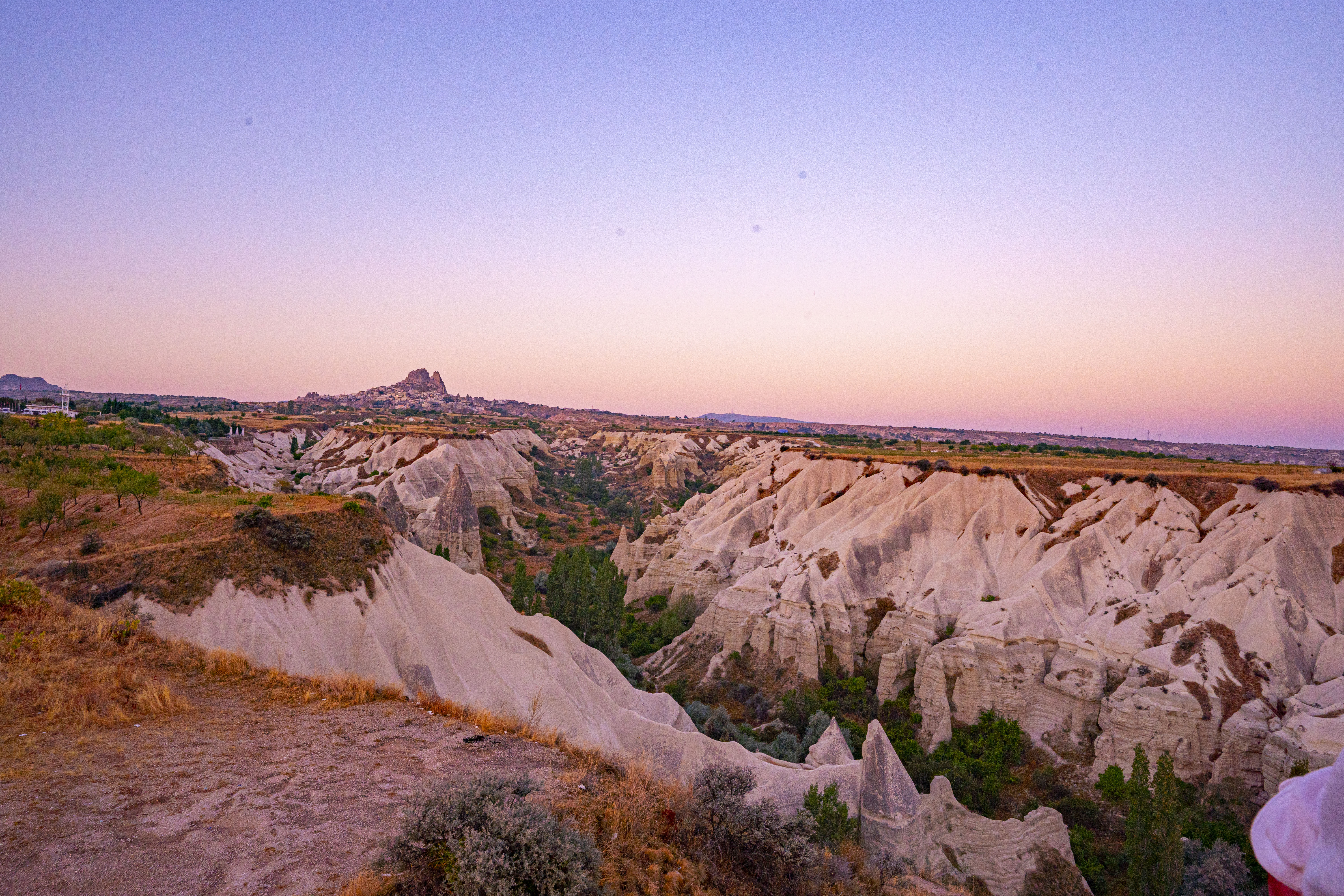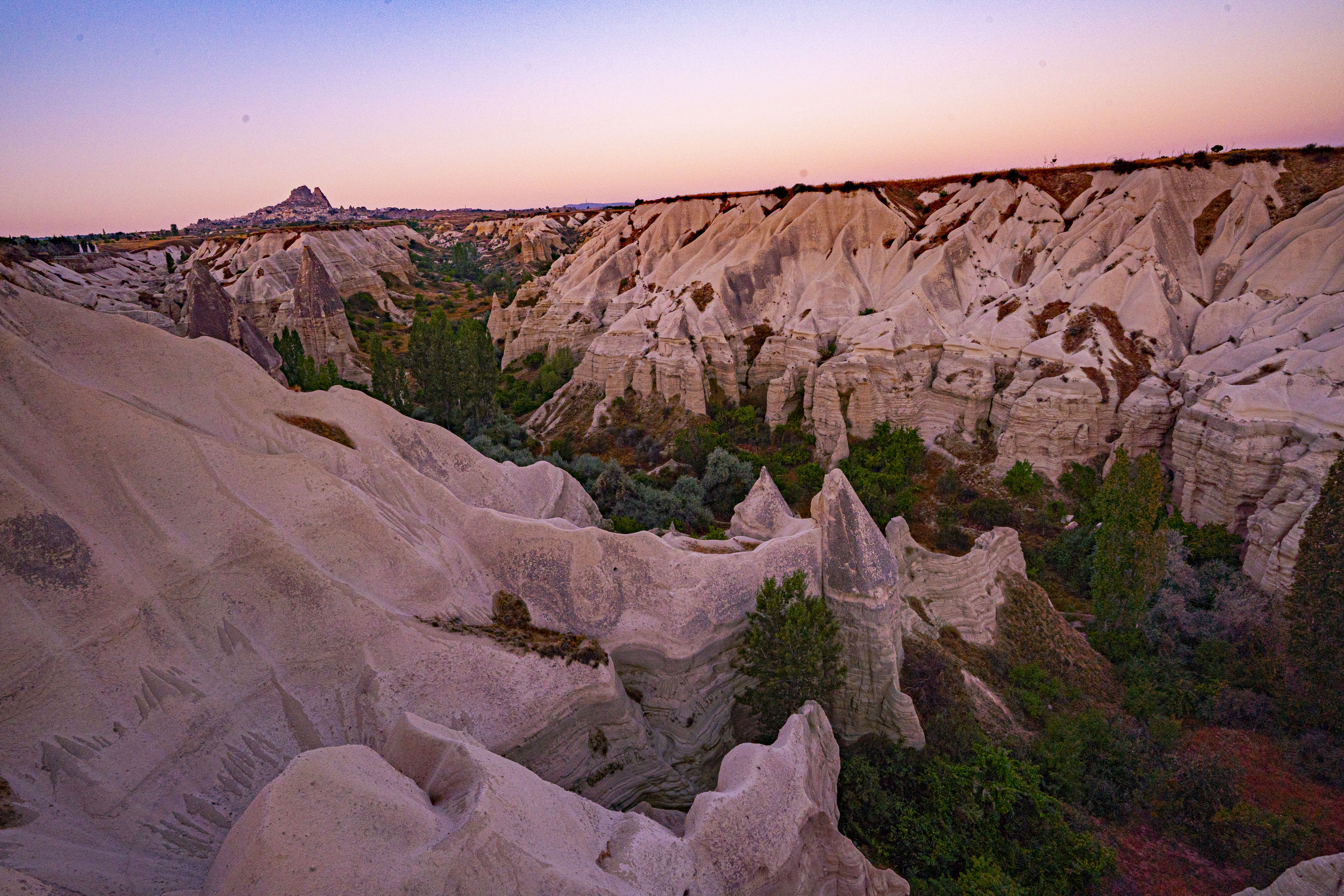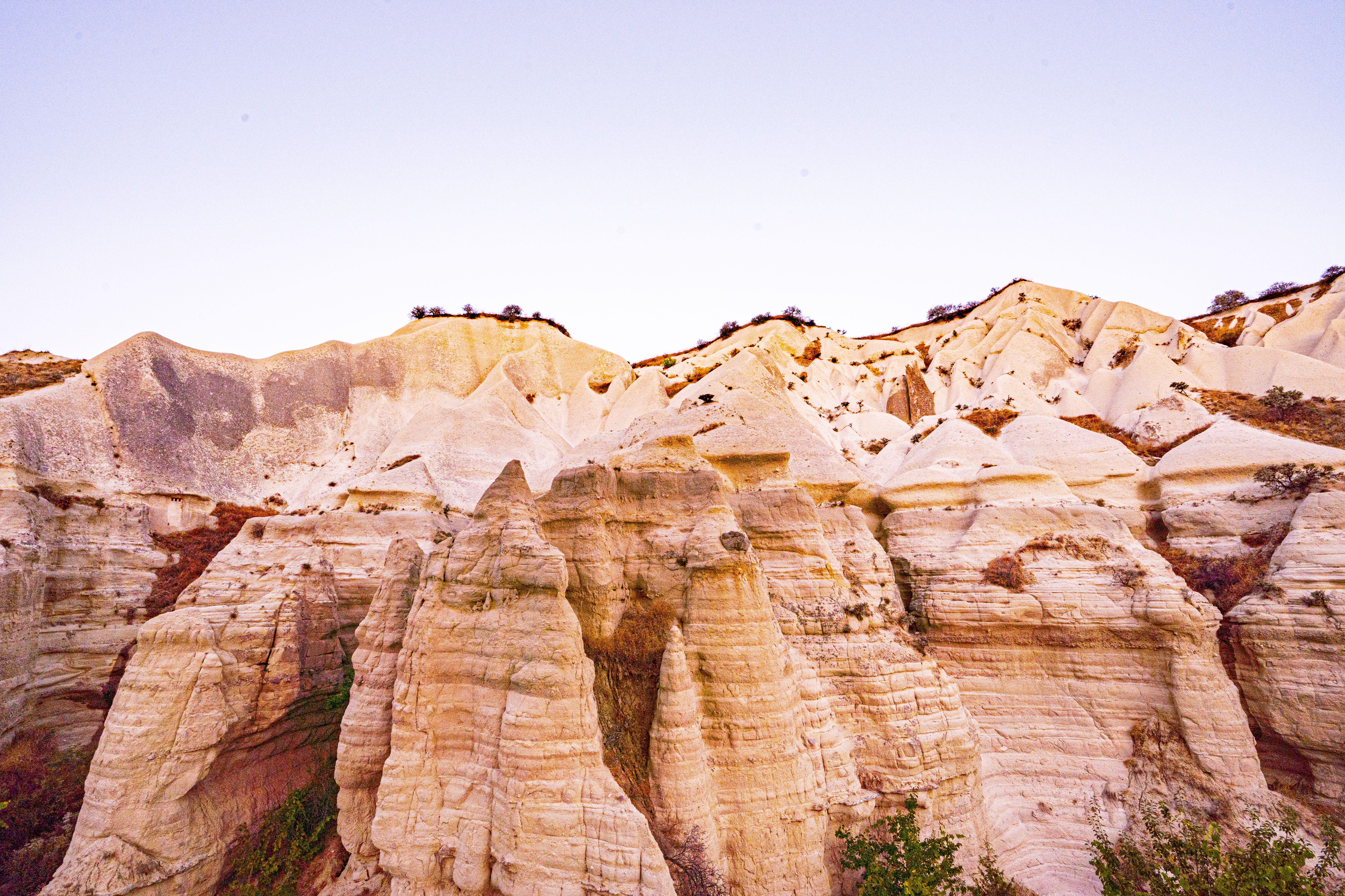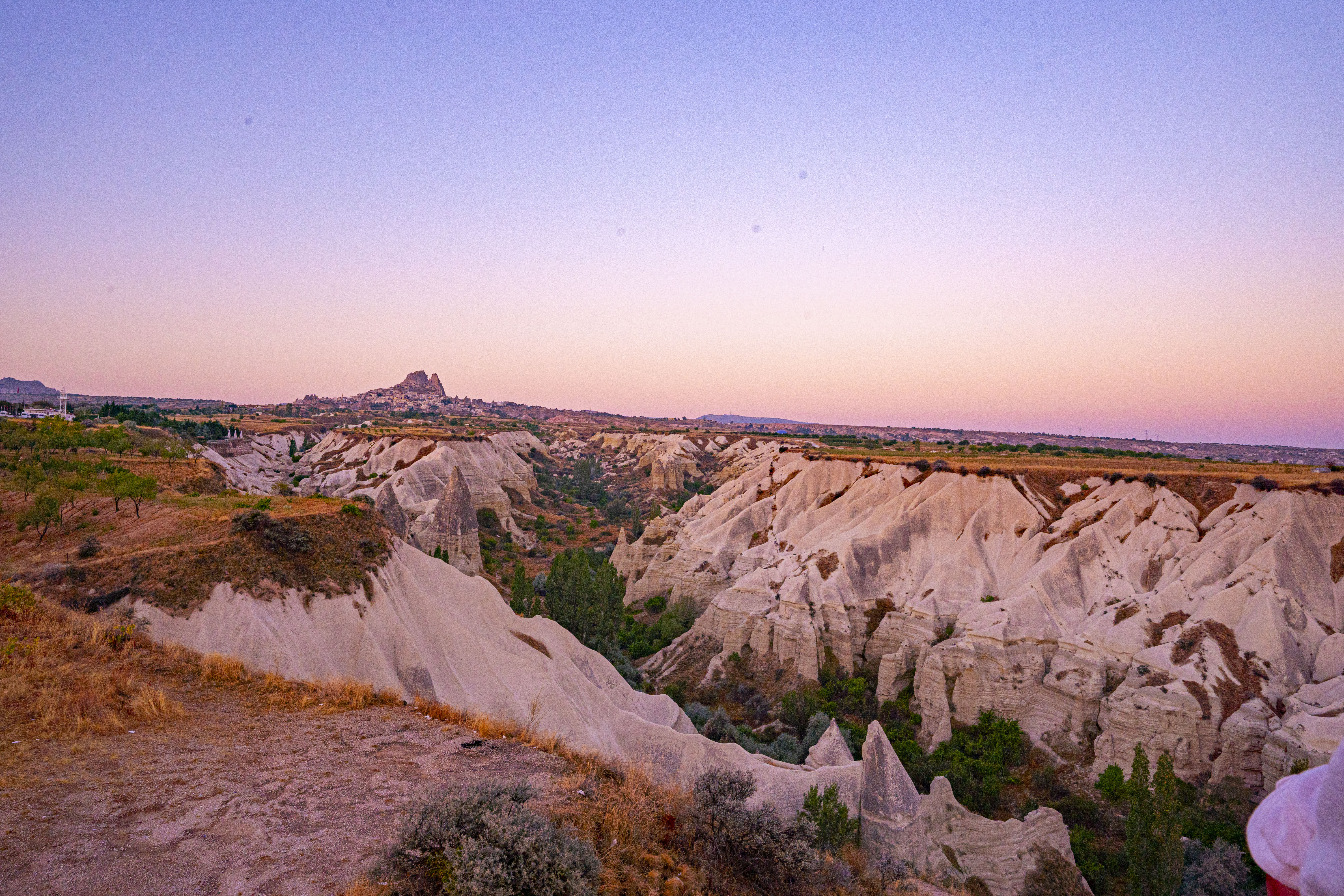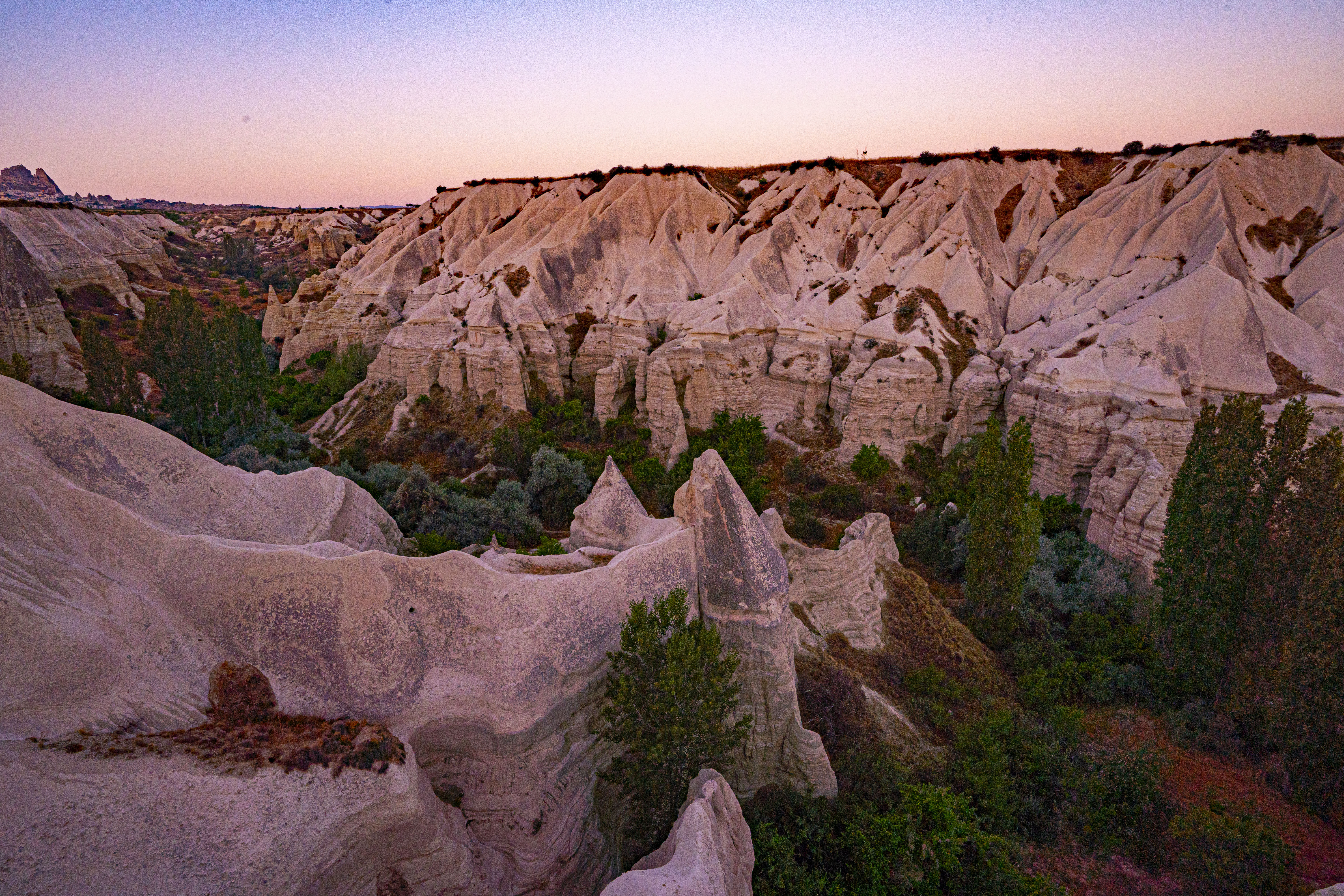 낮게 깔린 응회암 바위 펼쳐진 기기묘묘한 지상에 동쪽으로 여명이 밝아오는 낮은 평원에 수 많은 풍선이 뜬 풍경은 실제로 너무나 아름다운 풍경이다