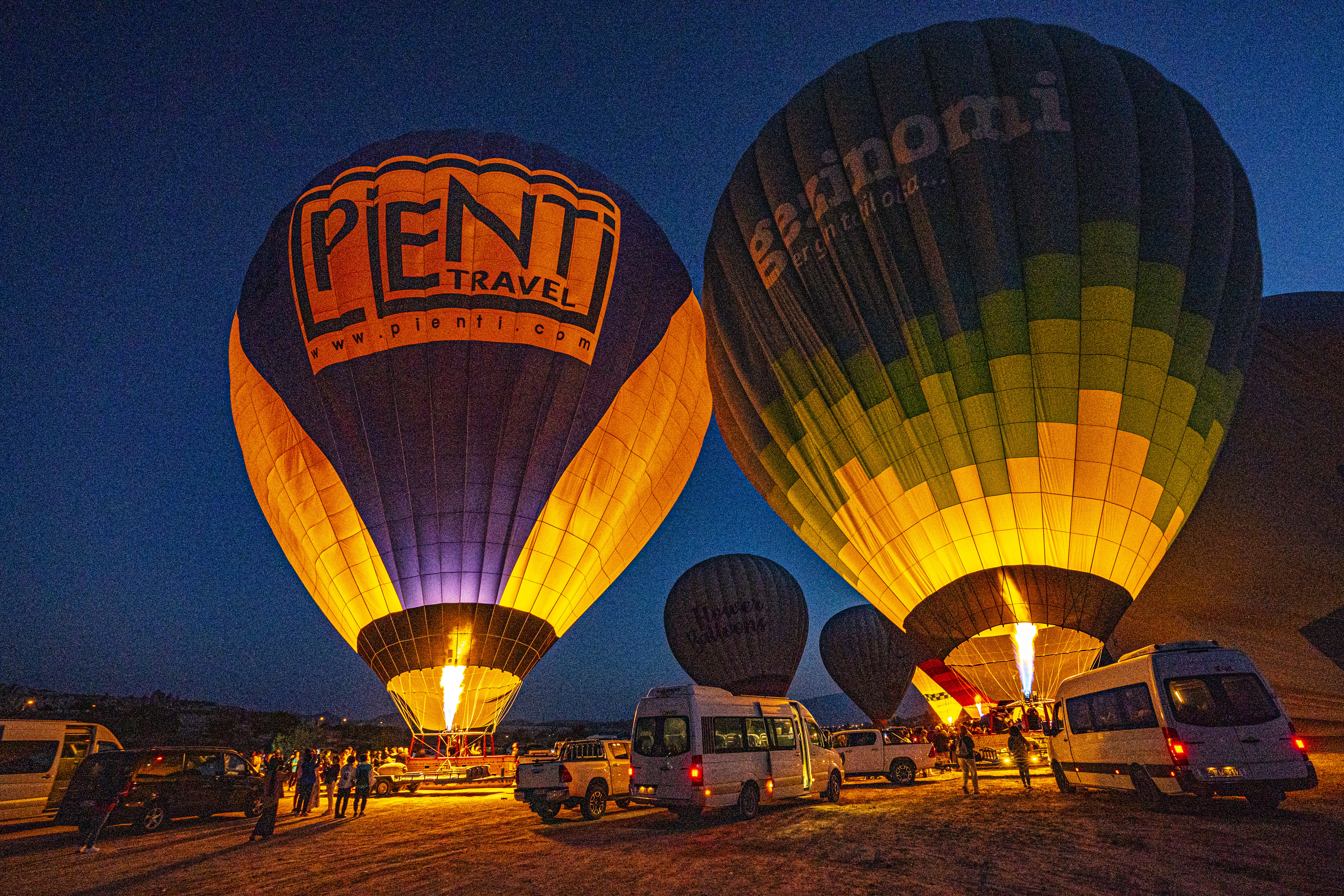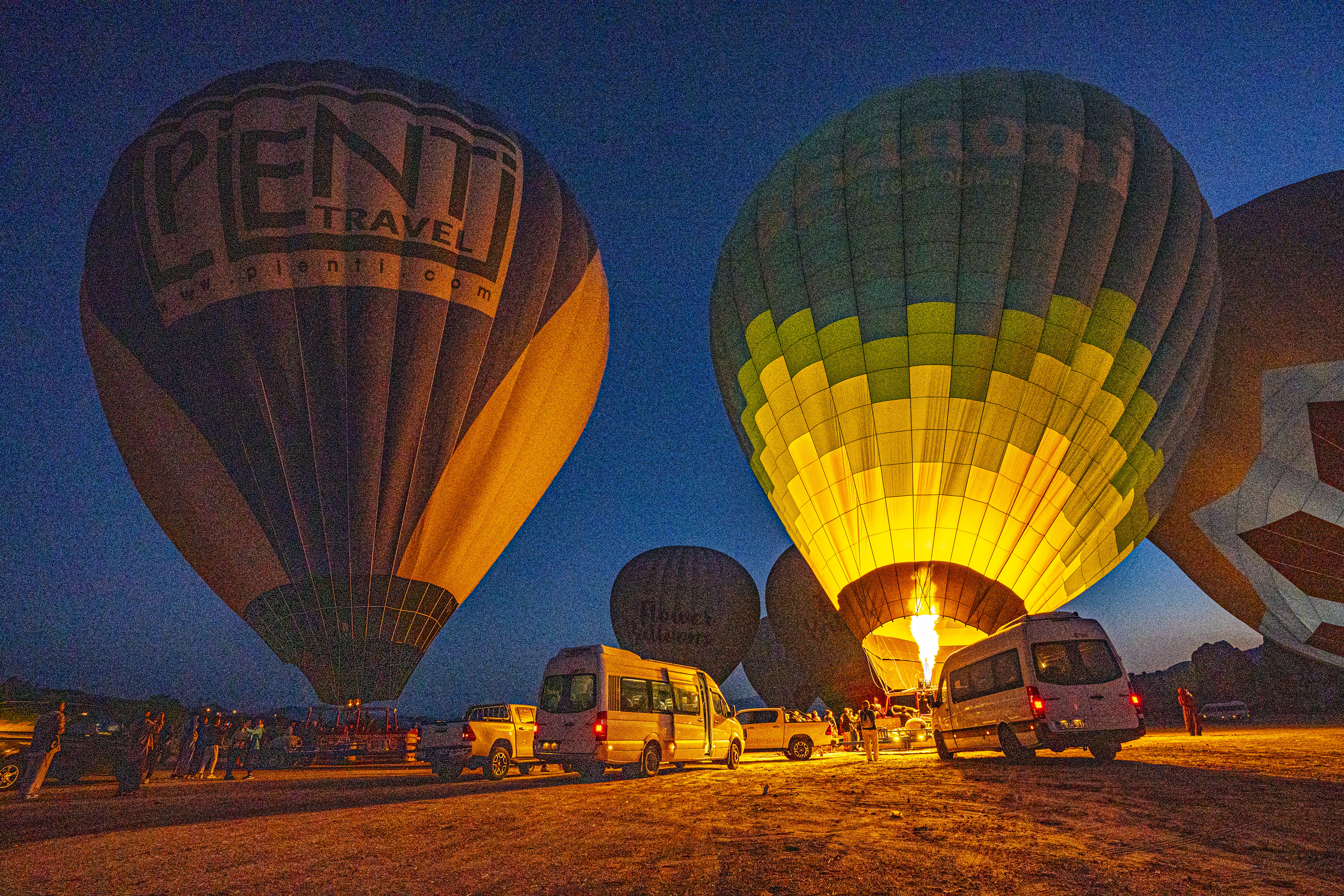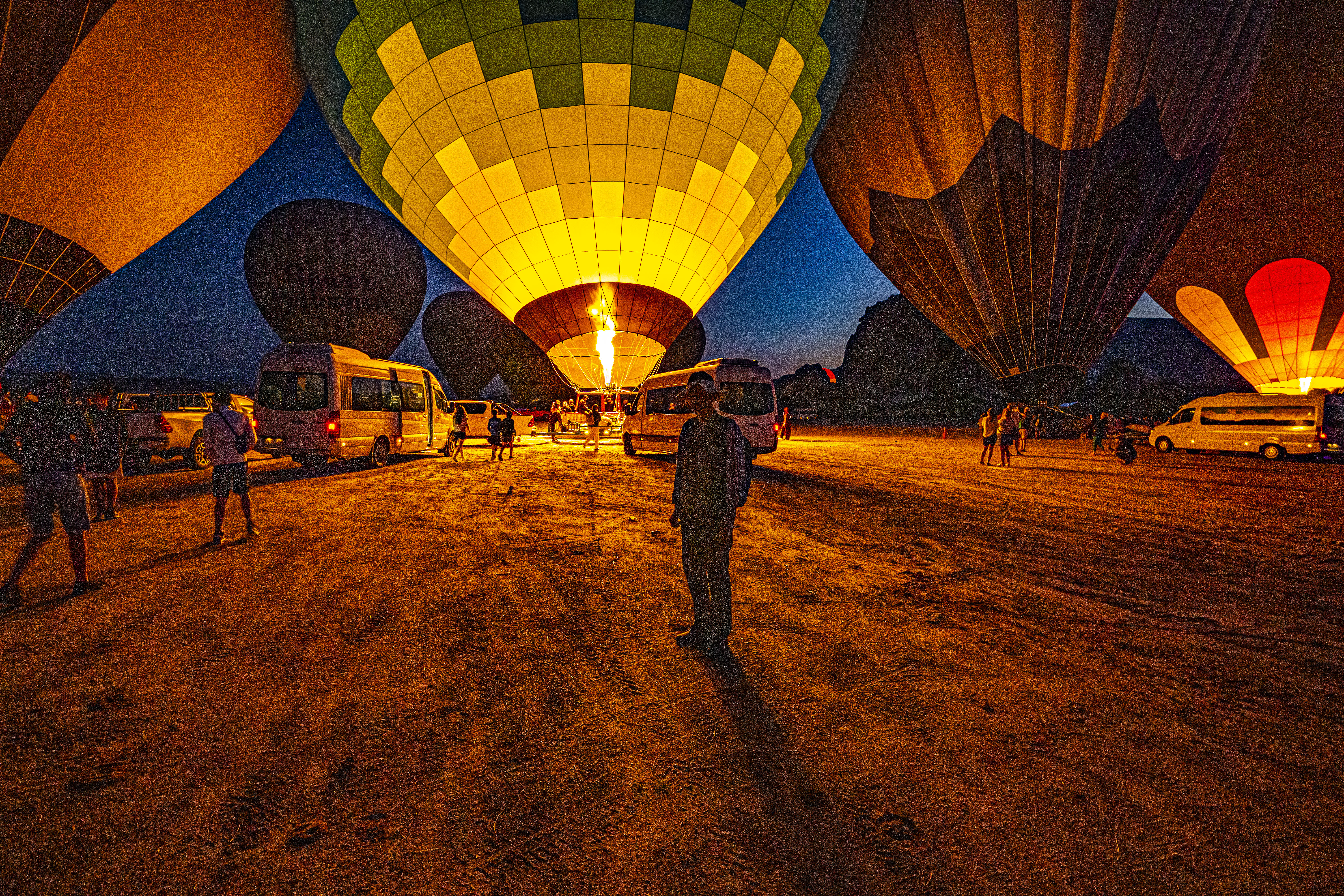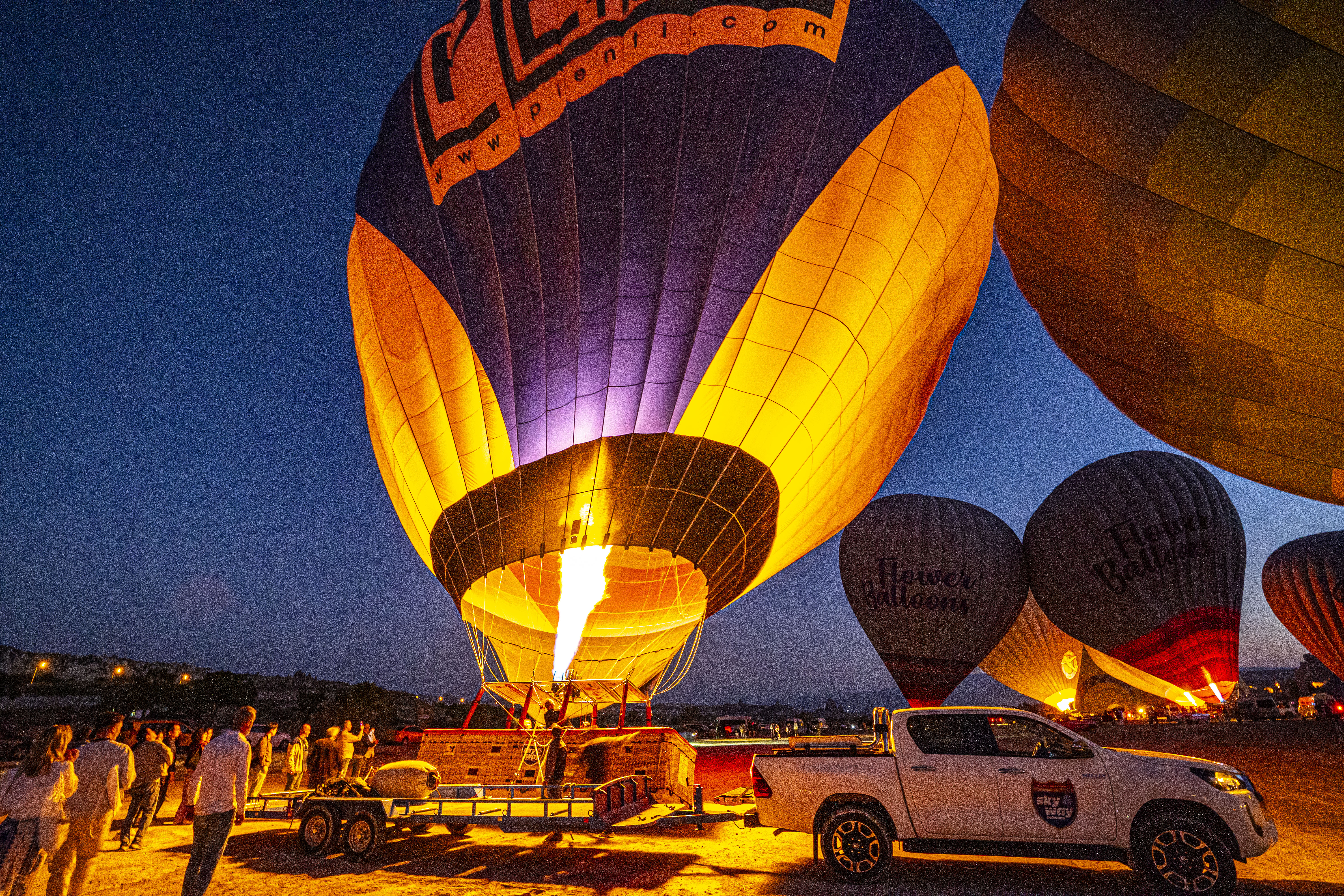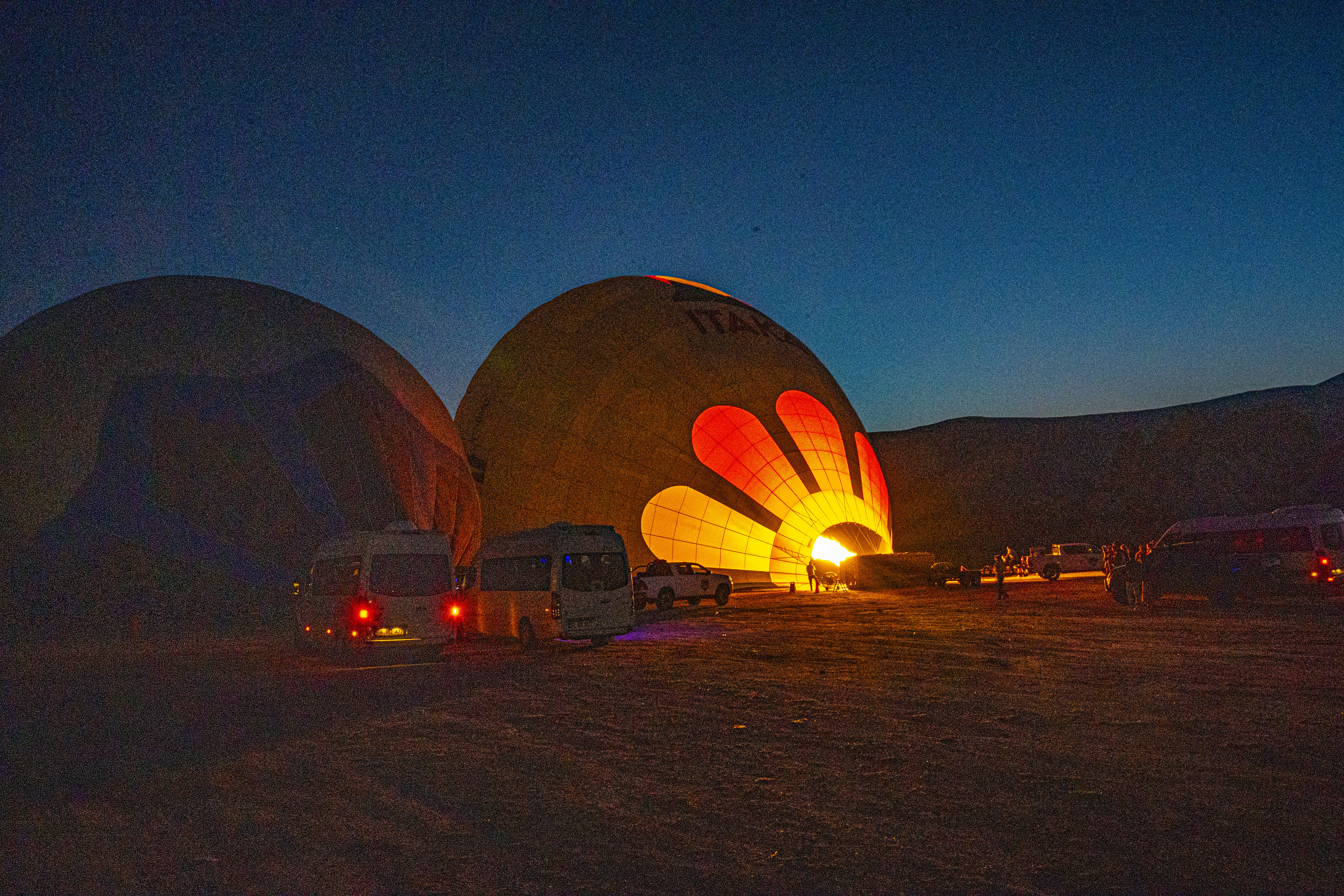 둥글게 부푼 열기구에 가스불이 켜져 색을 드러낼 때가 가장 아름다운 모습이다