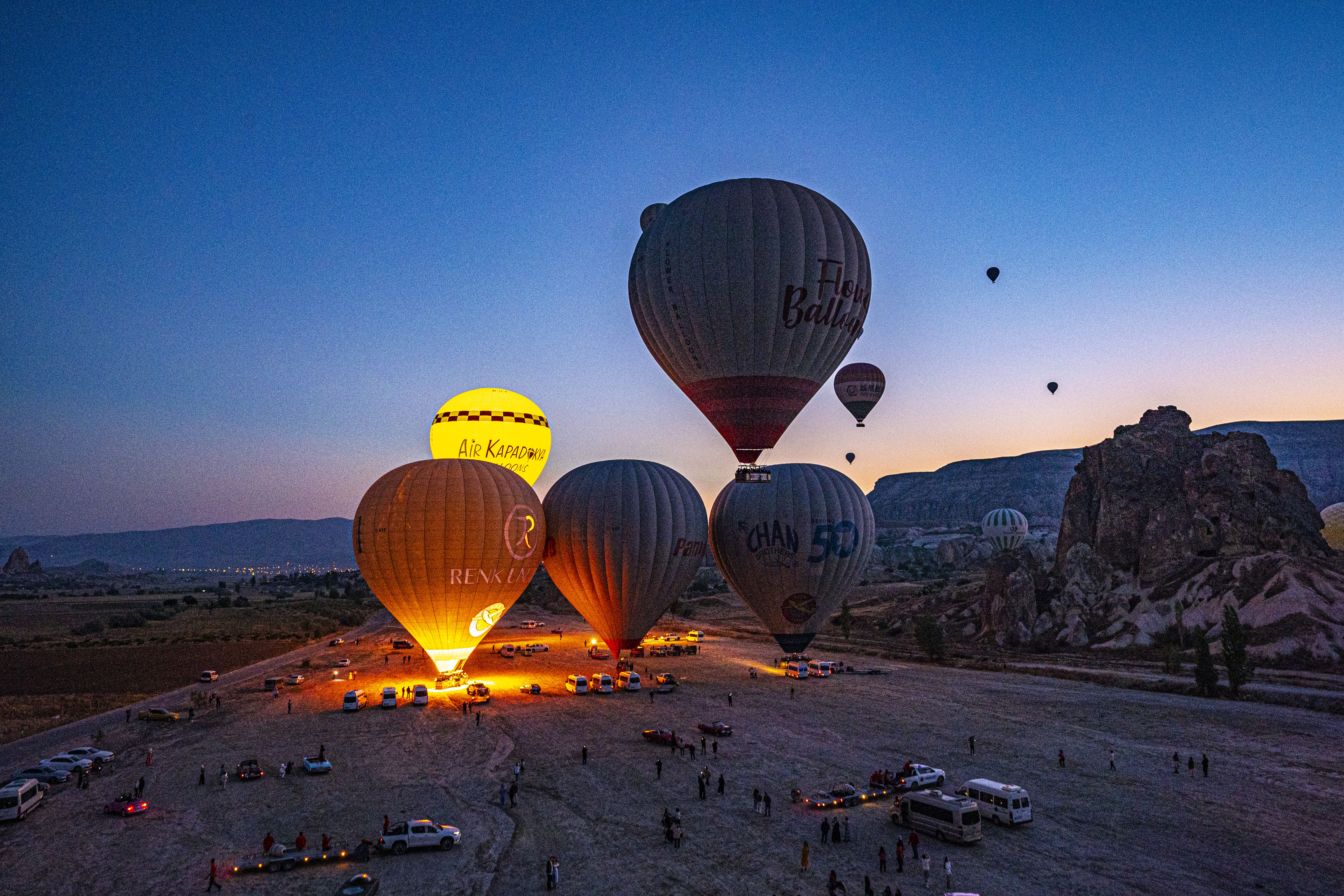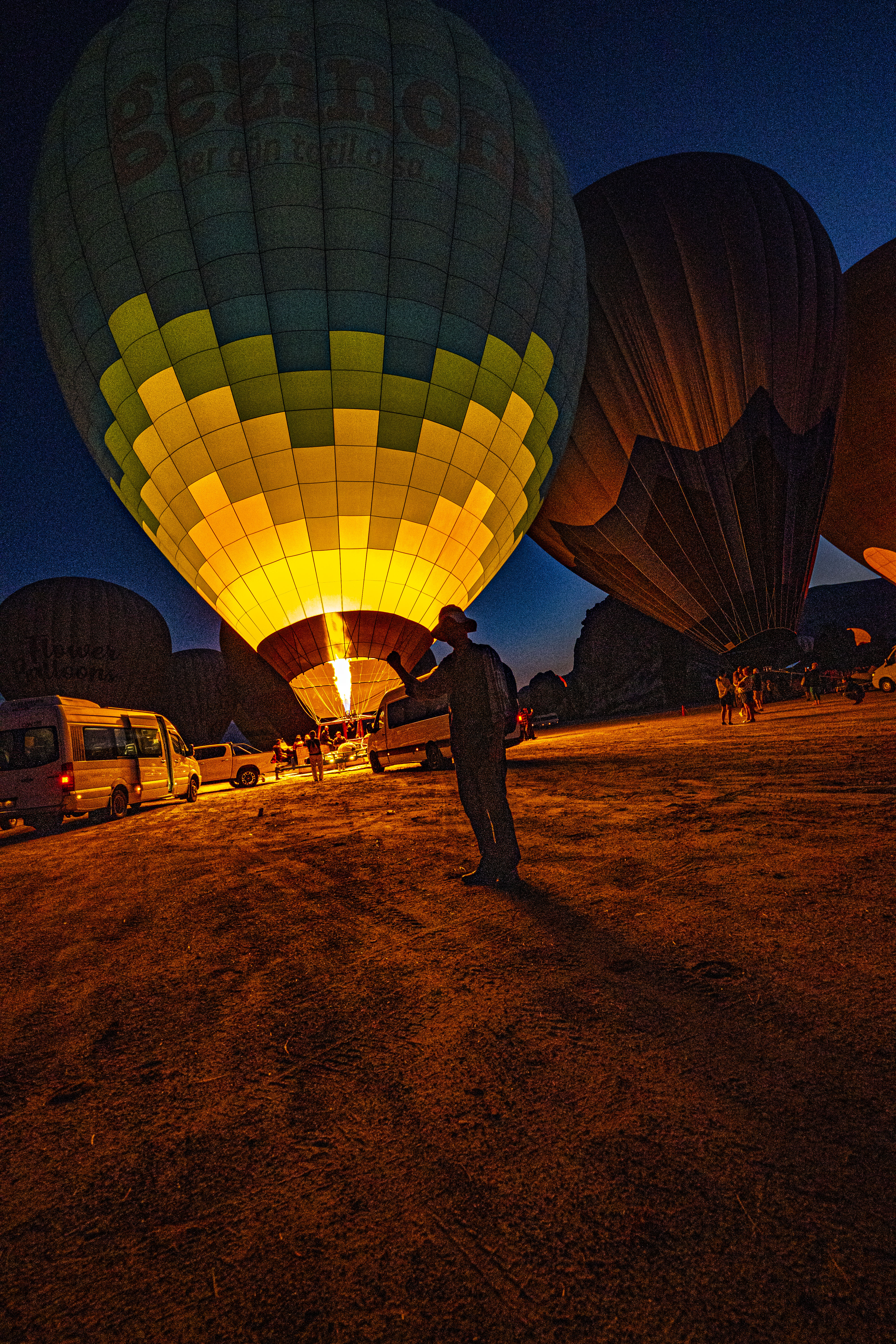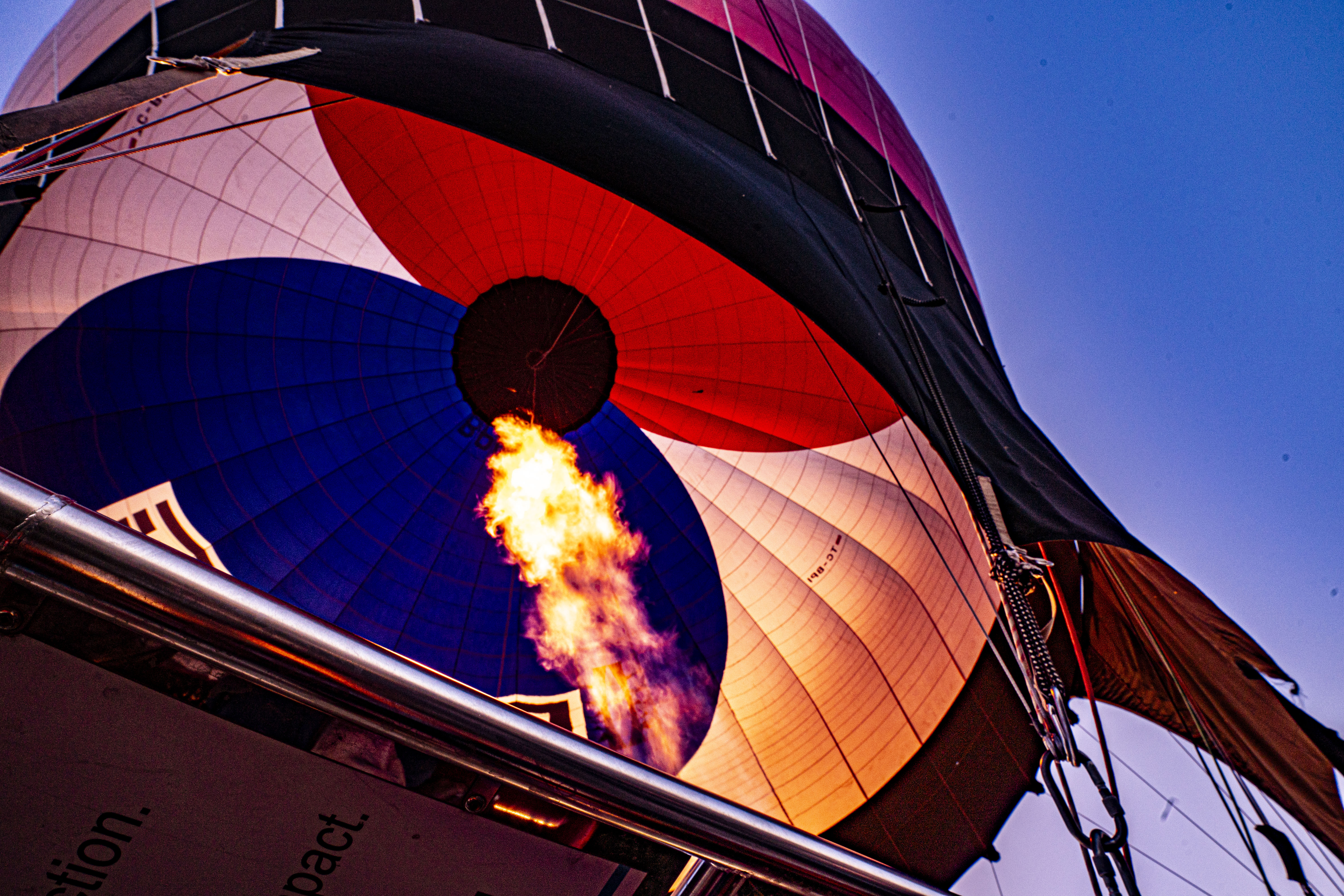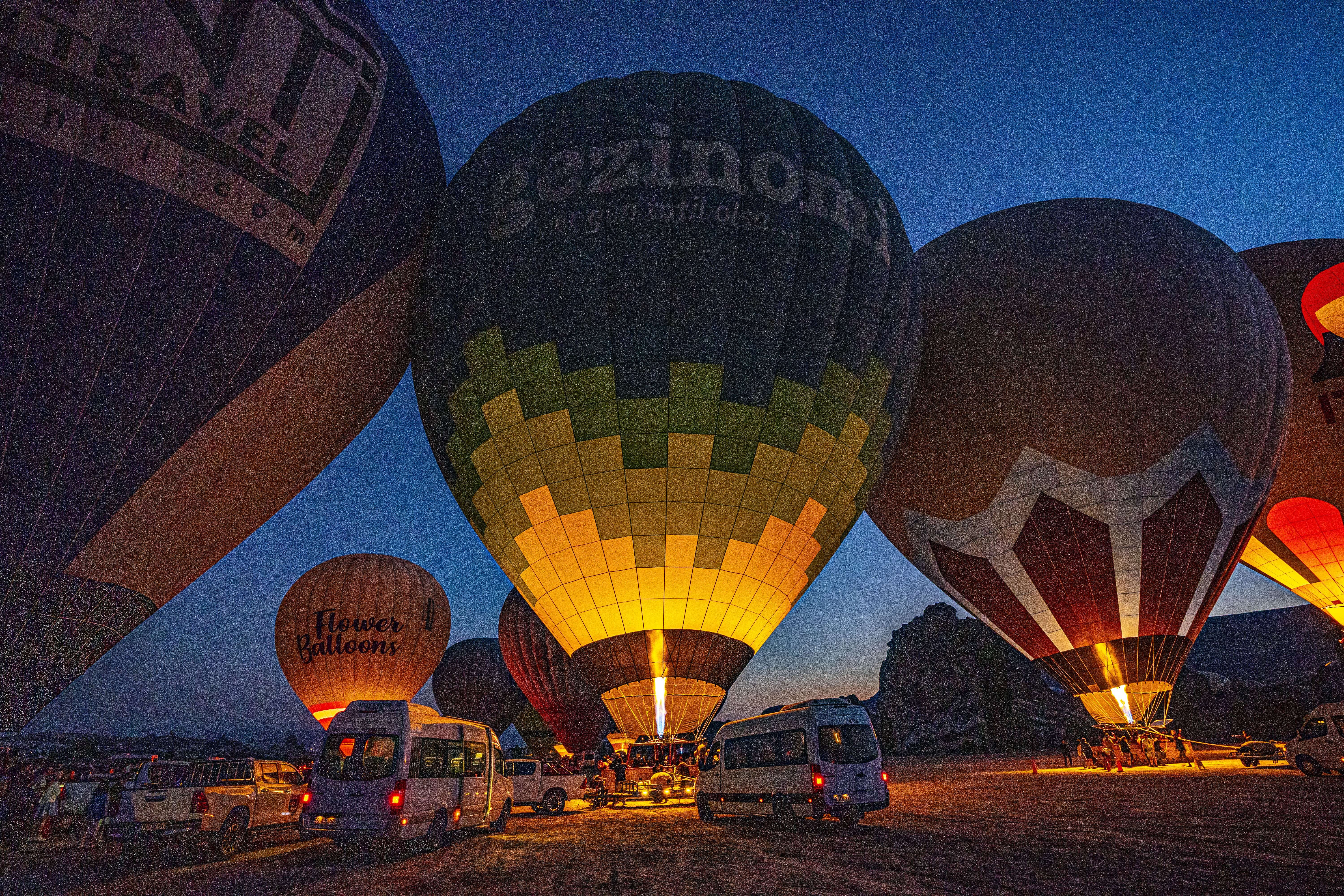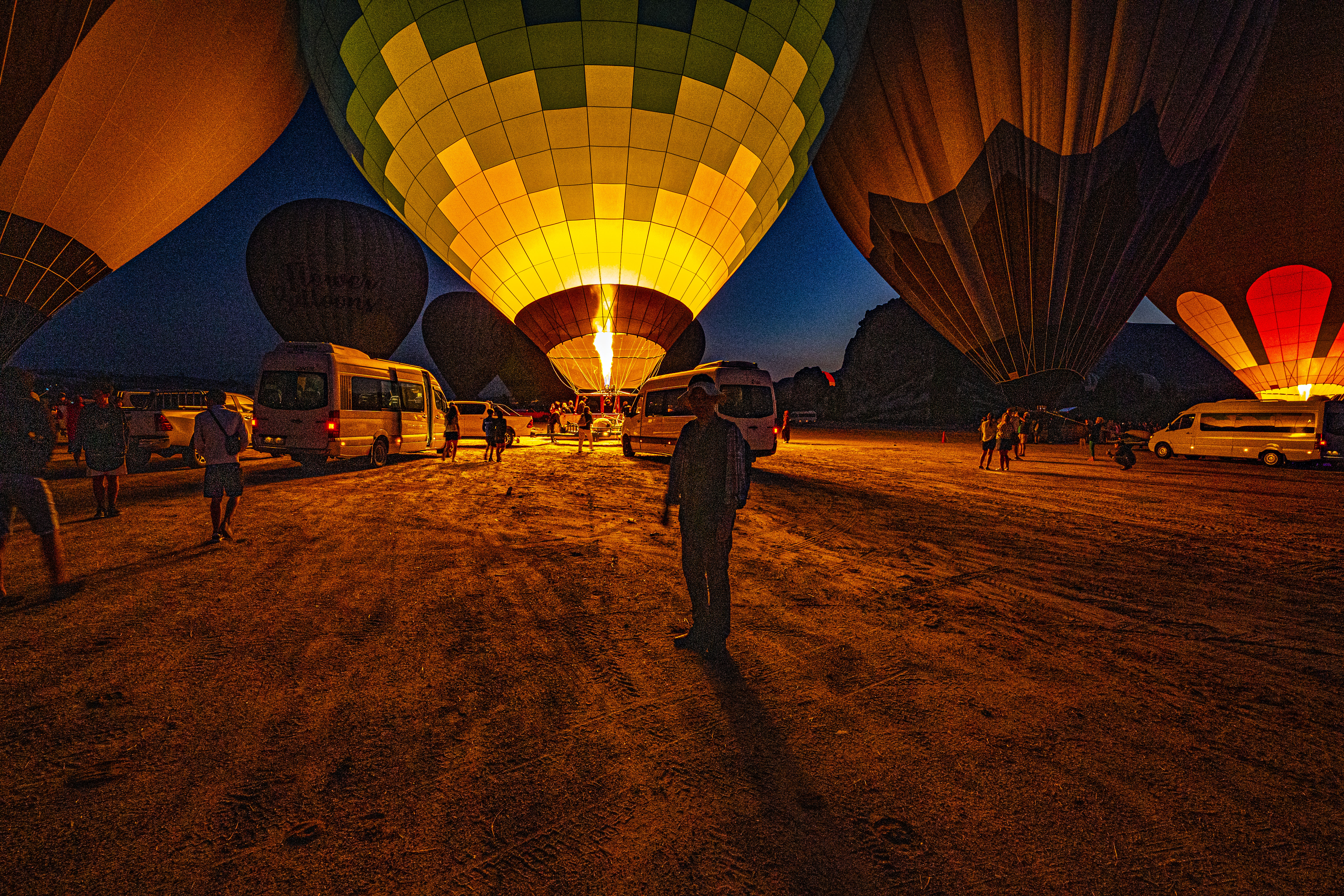 둥글게 부푼 열기구에 가스불이 켜져 색을 드러낼 때가 가장 아름다운 모습이다