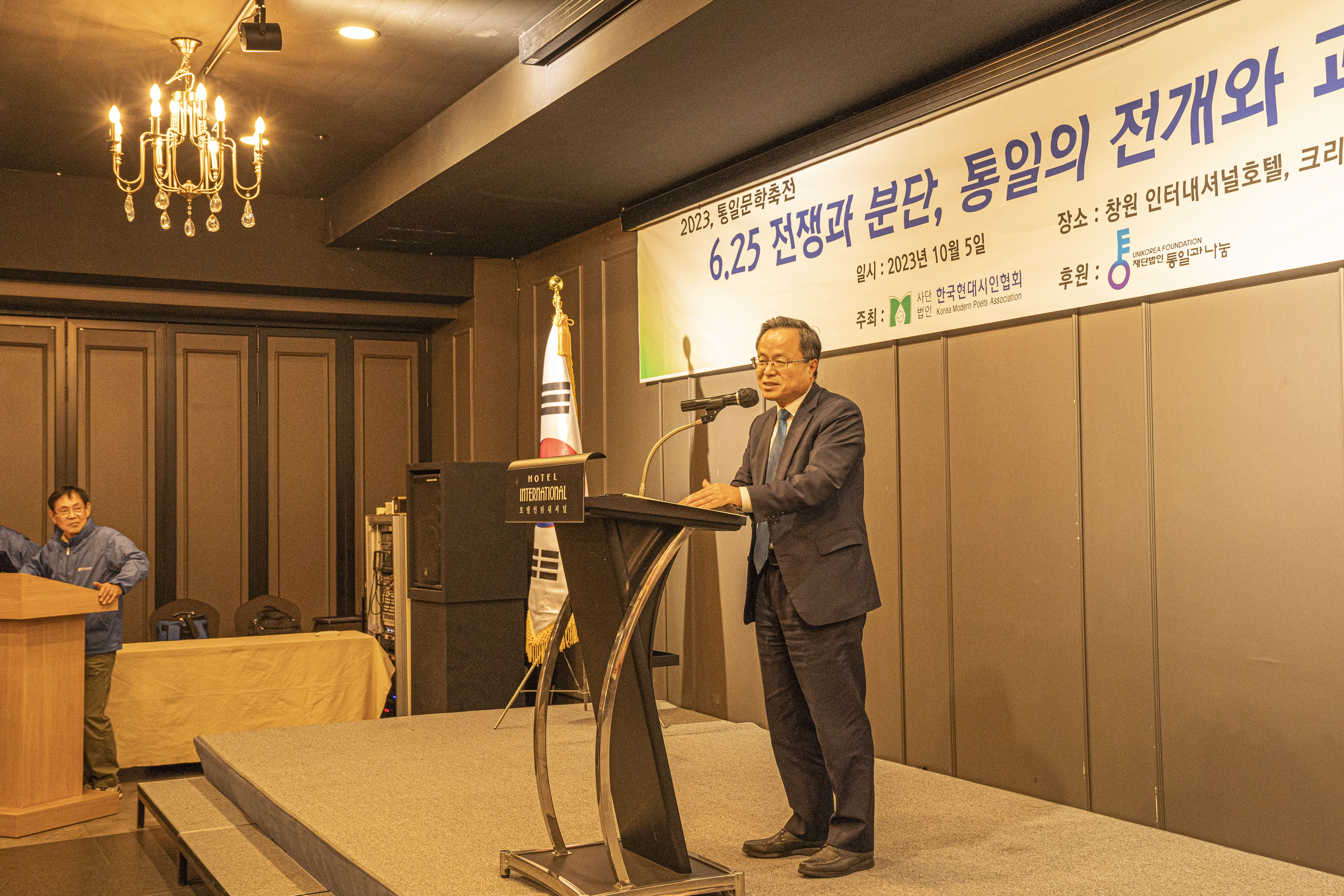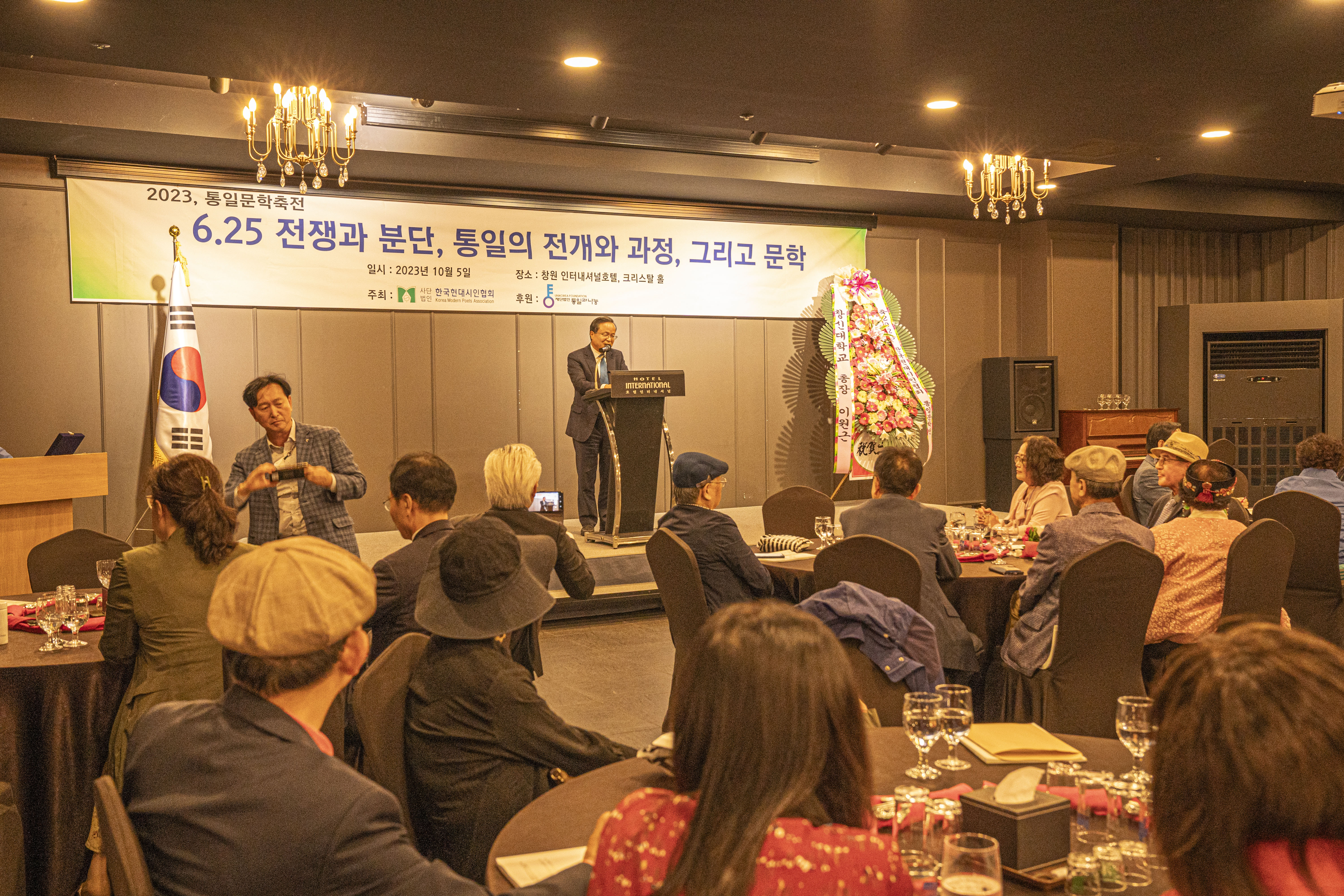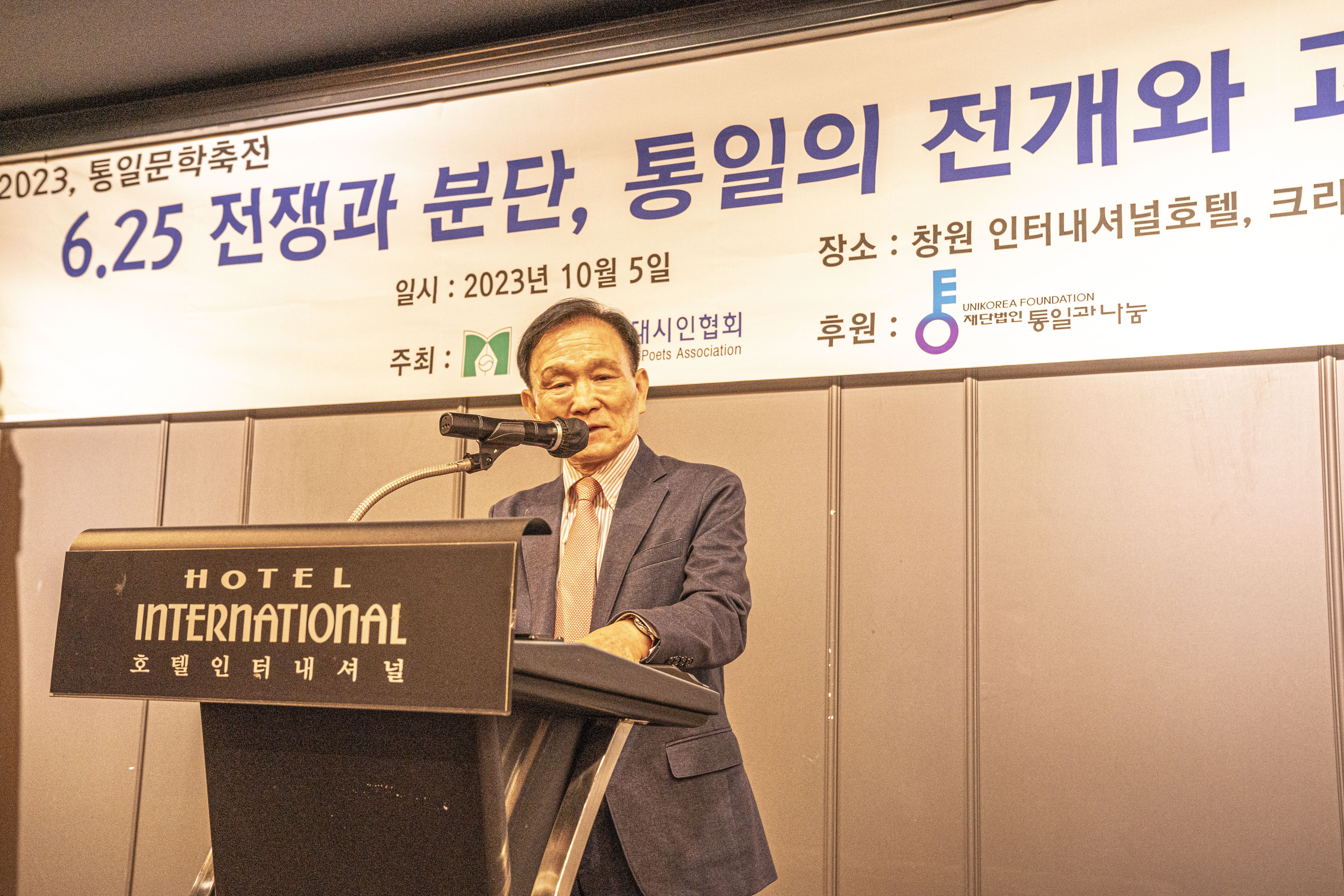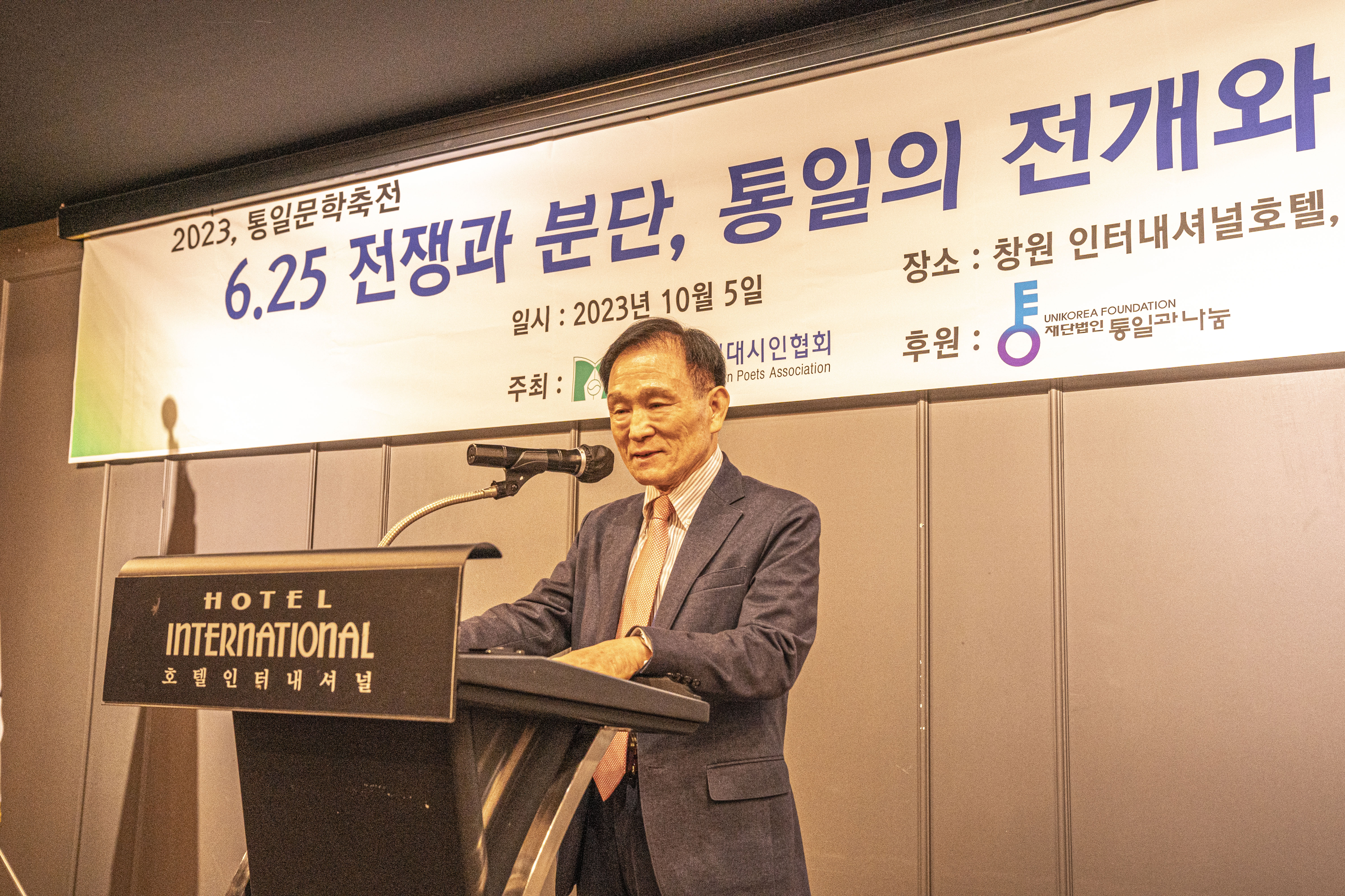2023. 10. 5 ~ 6 (1박2일) 경남 창원 인터내셔널 호텔과 창신대학교 문덕수 문학관에서 한국현대시인협회(이사장 양왕용)가 주최하고 재단법인 통일과 나눔이 후원하는 시, 통일을 빚다 2023 통일문학 심포지엄에 200여명의 시인들이 모여 '6.25 전쟁과 분단, 통일의 전개와 과정 그리고 문학'이라는 타이틀로 주제 발표와 통일 담론을 펼쳤다