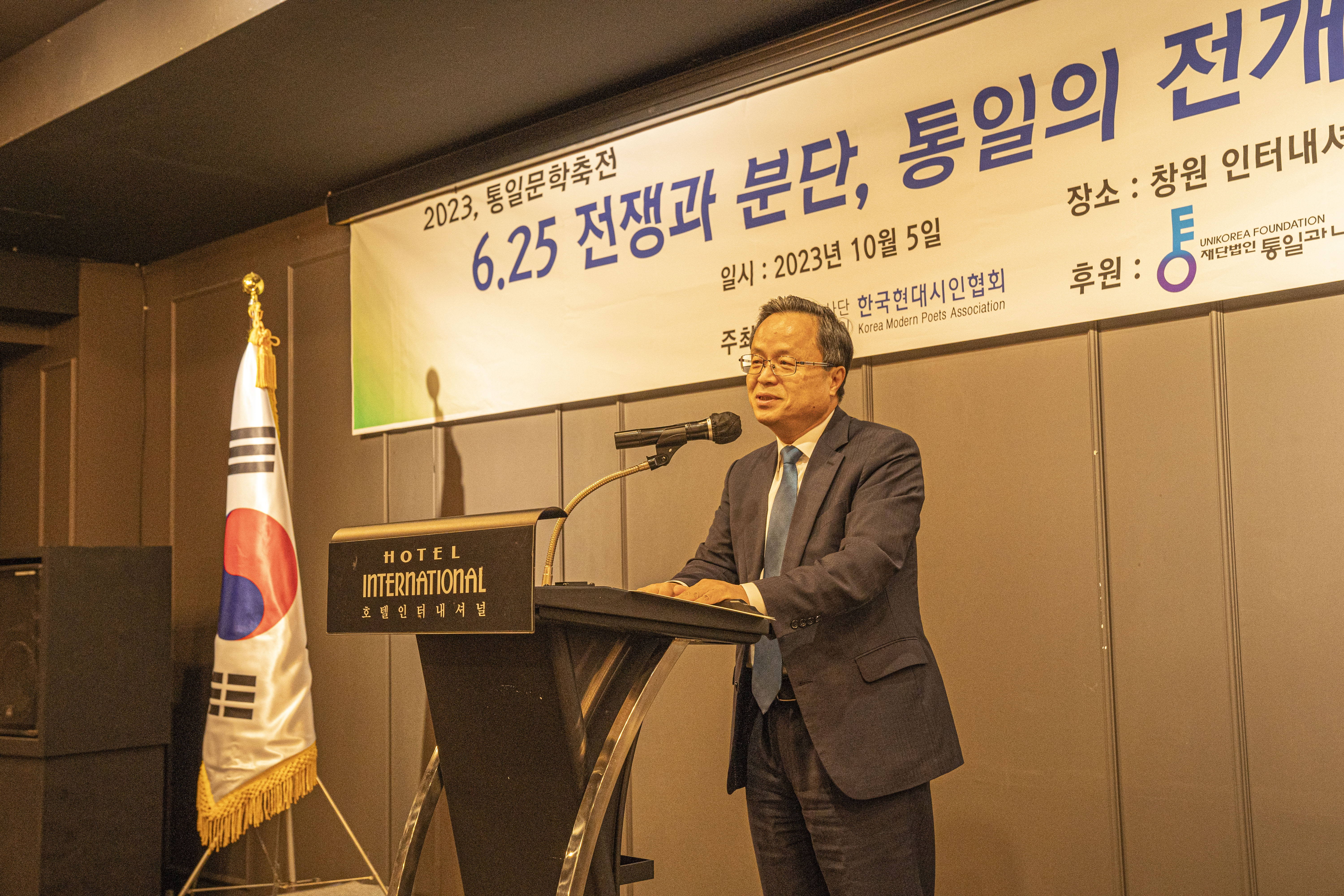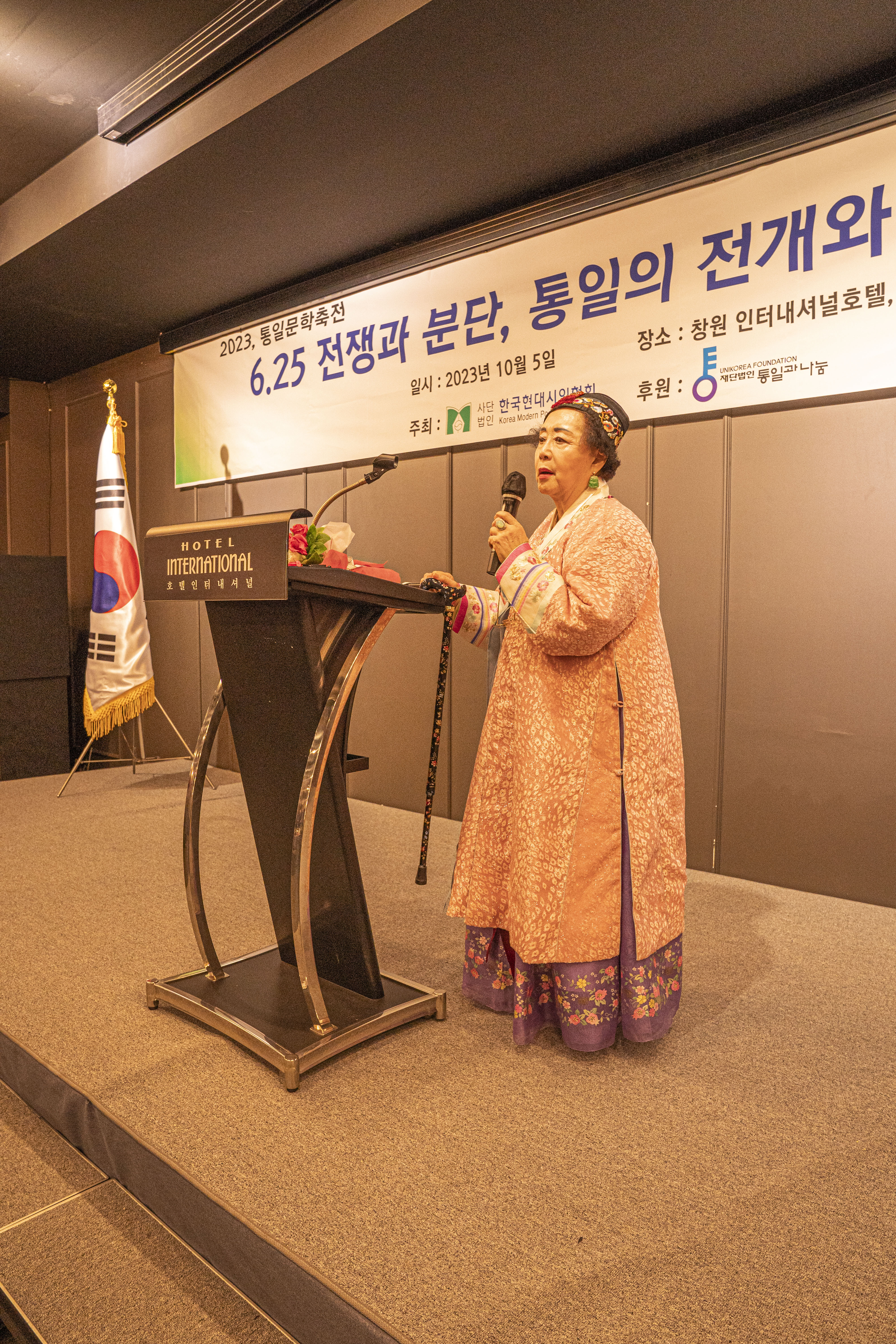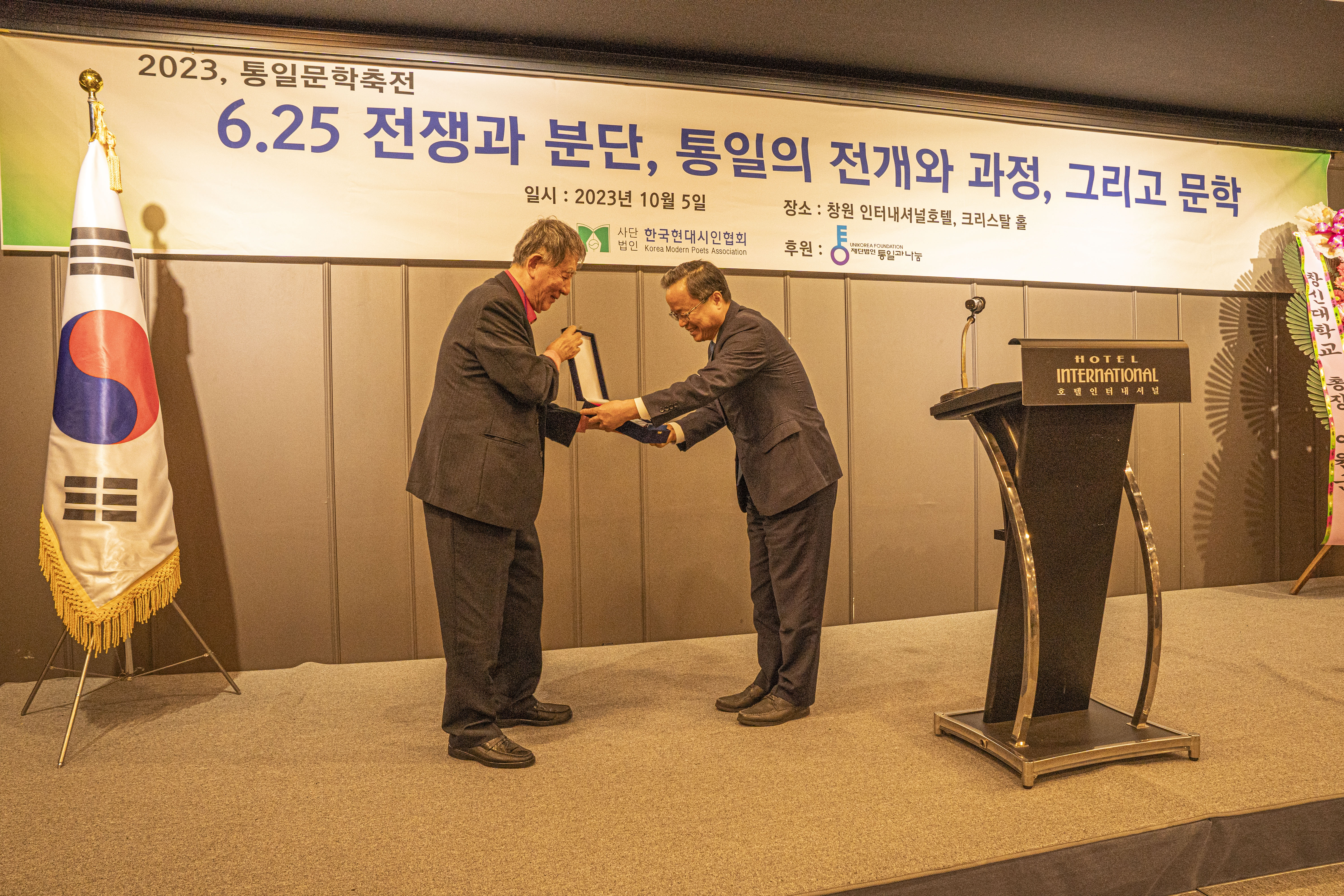2023. 10. 5 ~ 6 (1박2일) 경남 창원 인터내셔널 호텔과 창신대학교 문덕수 문학관에서 한국현대시인협회(이사장 양왕용)가 주최하고 재단법인 통일과 나눔이 후원하는 시, 통일을 빚다 2023 통일문학 심포지엄에 200여명의 시인들이 모여 '6.25 전쟁과 분단, 통일의 전개와 과정 그리고 문학'이라는 타이틀로 주제 발표와 통일 담론을 펼쳤다