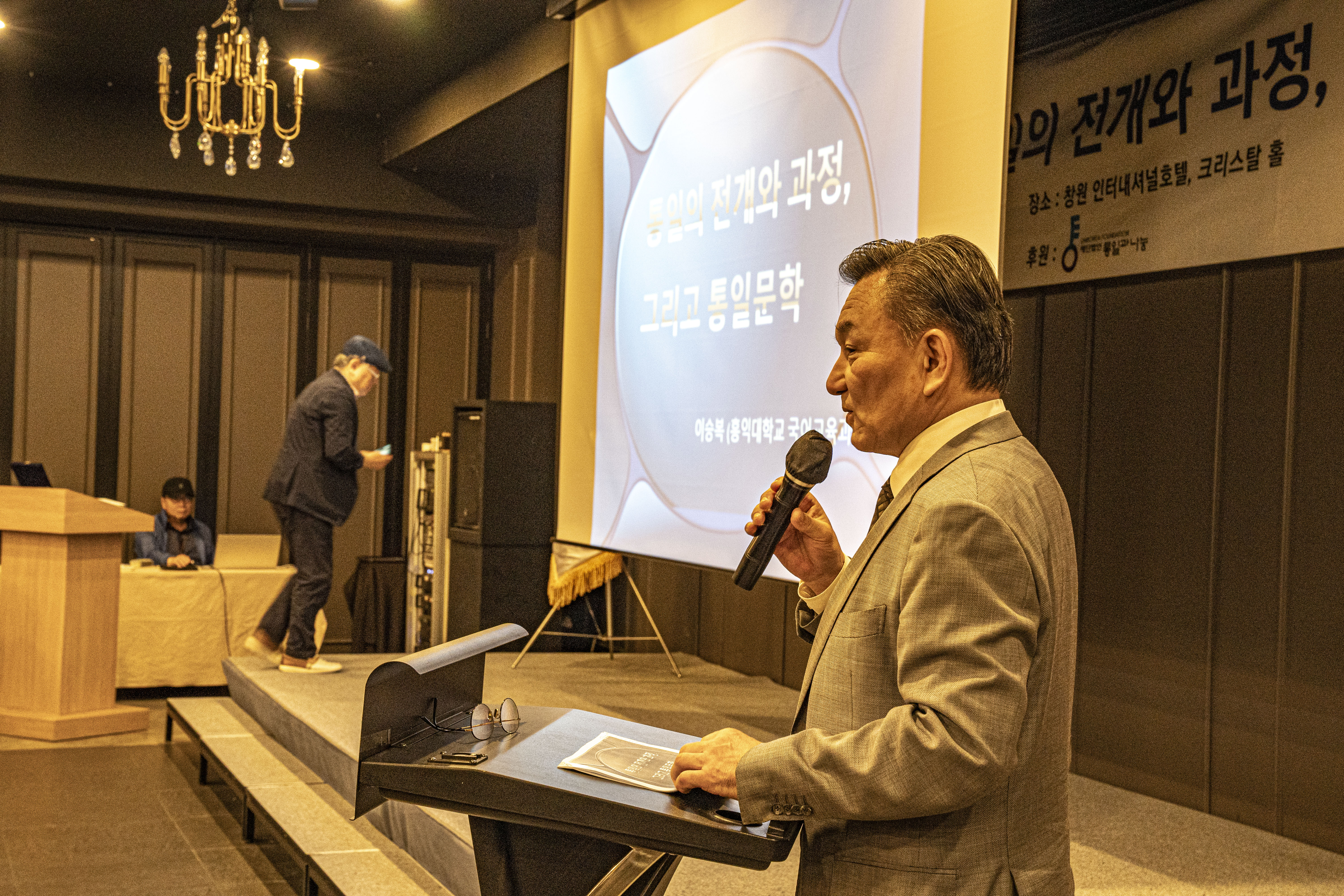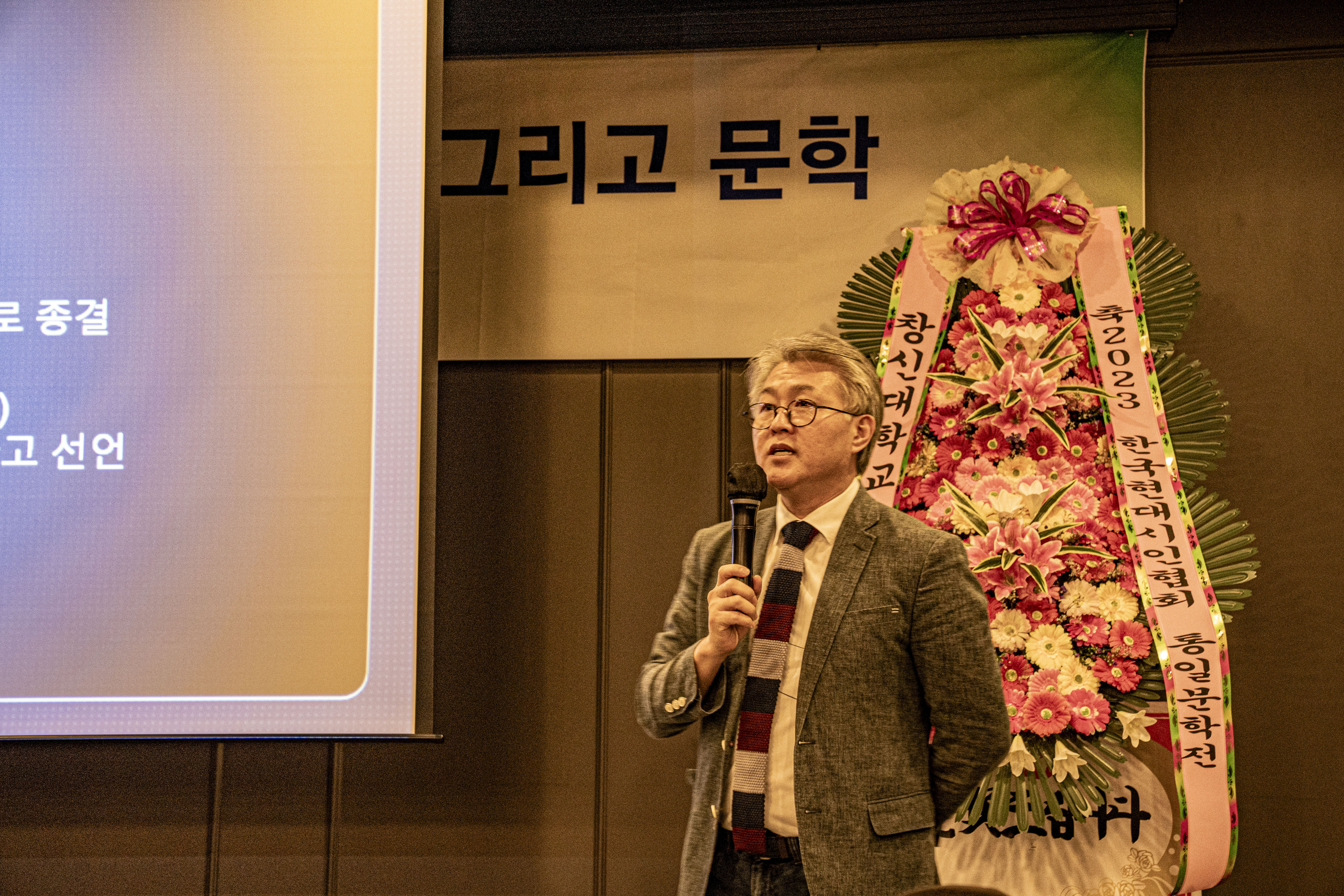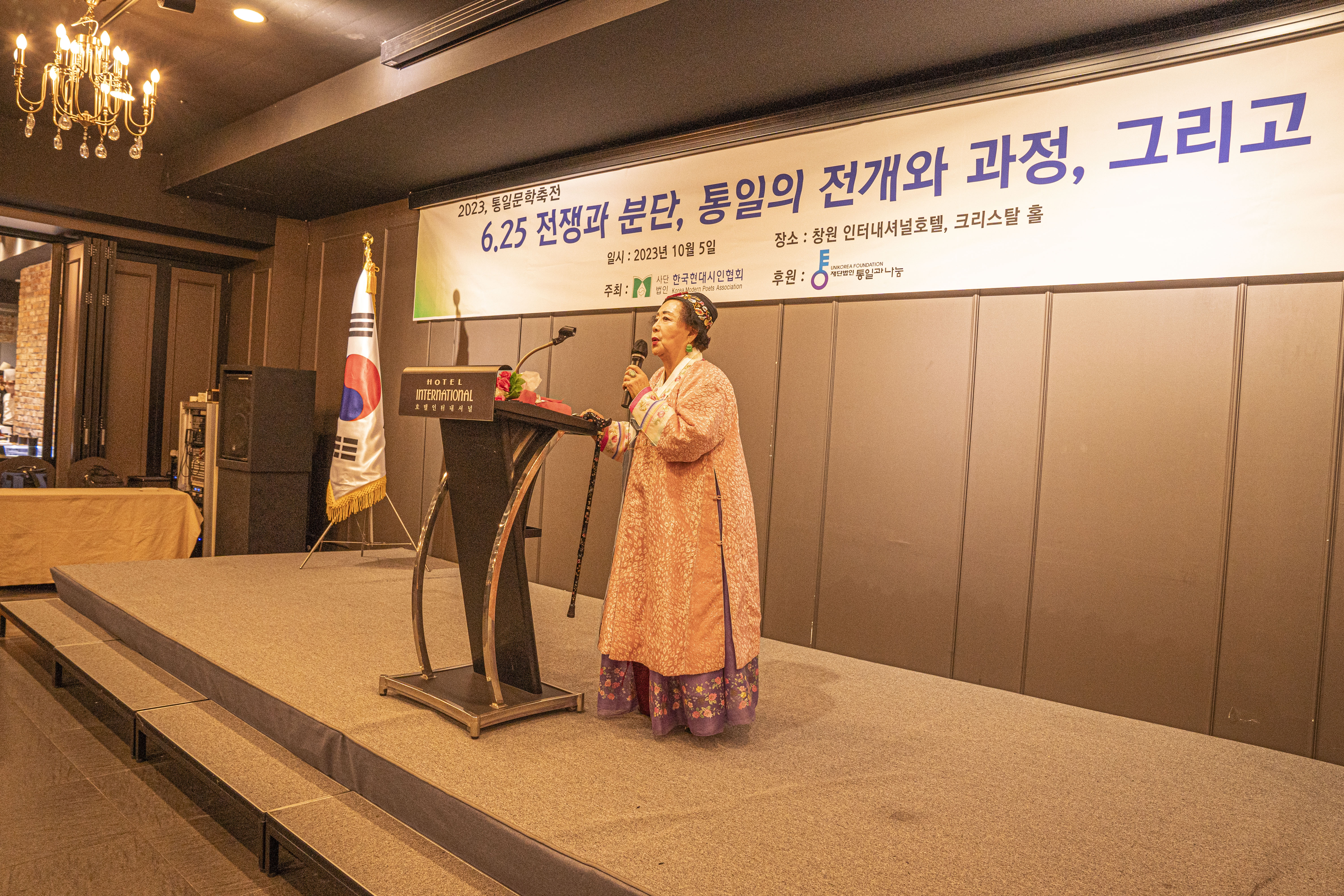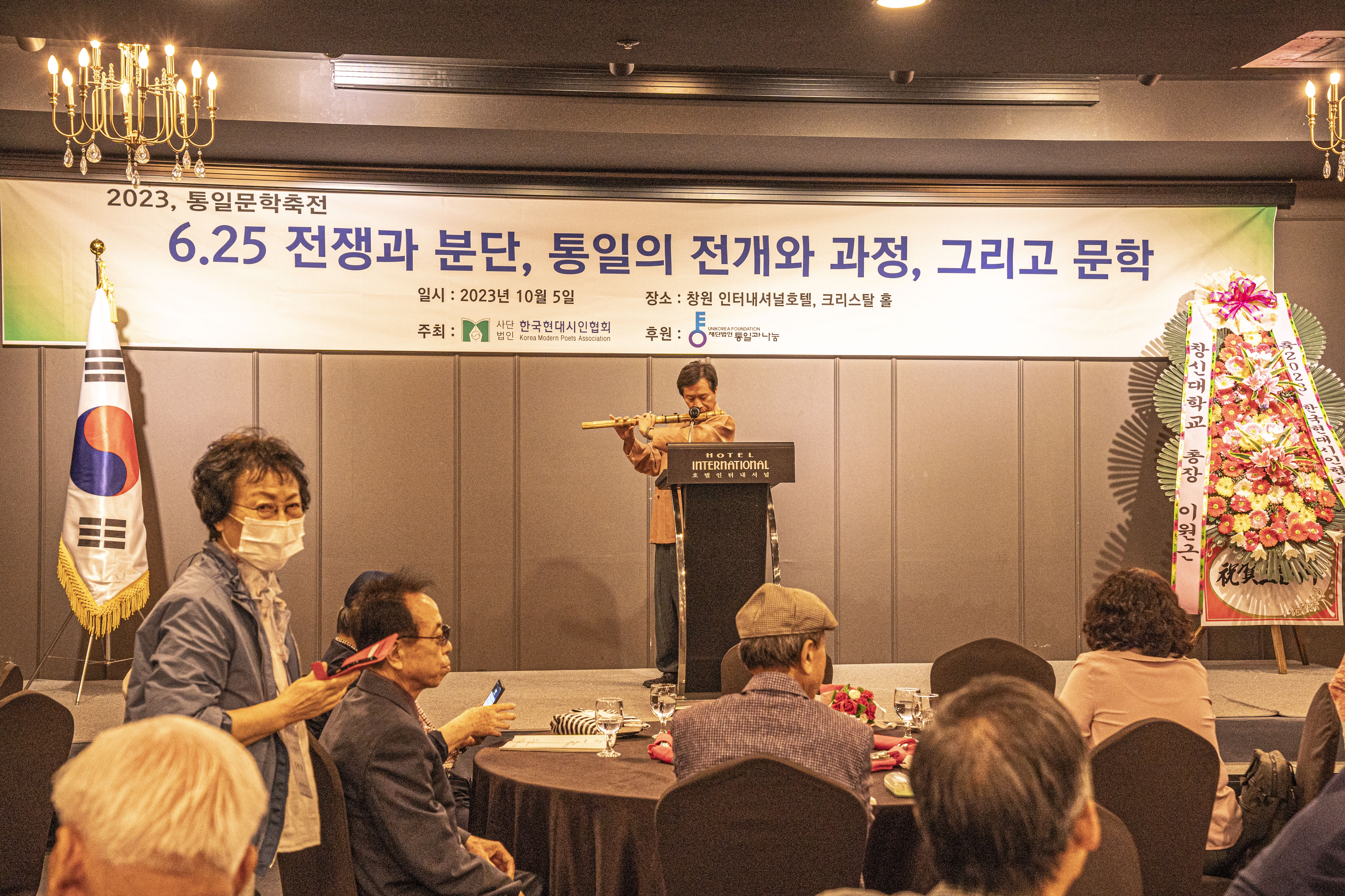 2023. 10. 5 ~ 6 (1박2일) 경남 창원 인터내셔널 호텔과 창신대학교 문덕수 문학관에서 한국현대시인협회(이사장 양왕용)가 주최하고 재단법인 통일과 나눔이 후원하는 시, 통일을 빚다 2023 통일문학 심포지엄에 200여명의 시인들이 모여 '6.25 전쟁과 분단, 통일의 전개와 과정 그리고 문학'이라는 타이틀로 주제 발표와 통일 담론을 펼쳤다