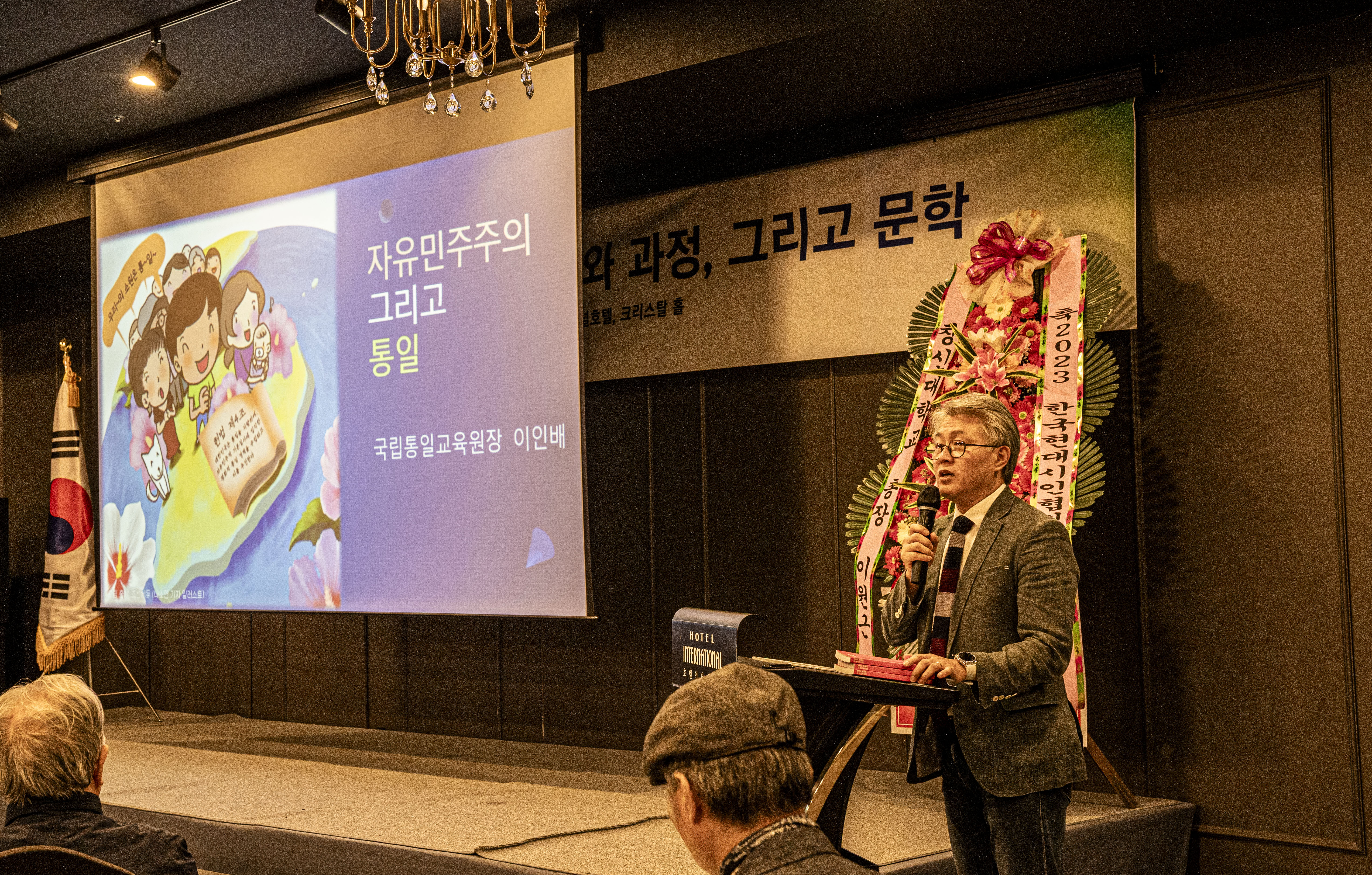 먼저 통일부 국립통일교육원 이인배 원장의 '자유민주주의 그리고 통일'이란 발제에서 공존의 완결된 형태로서의 통일 담론을 제시하여 자유민주주의의 통일이어야 하는 당위를 인간의 본성인 이기심을 창조적 에너지로 흡수 발전시킬 수 있는 근원적 인간 본성을 들춰내는 시대적 통일 거대 담론을 전개하여 문화예술이 특히 문학이 선도적으로 수용 확산해 줄 것을 한국현대시인들이 앞장 서 줄 것을 요청하였다
