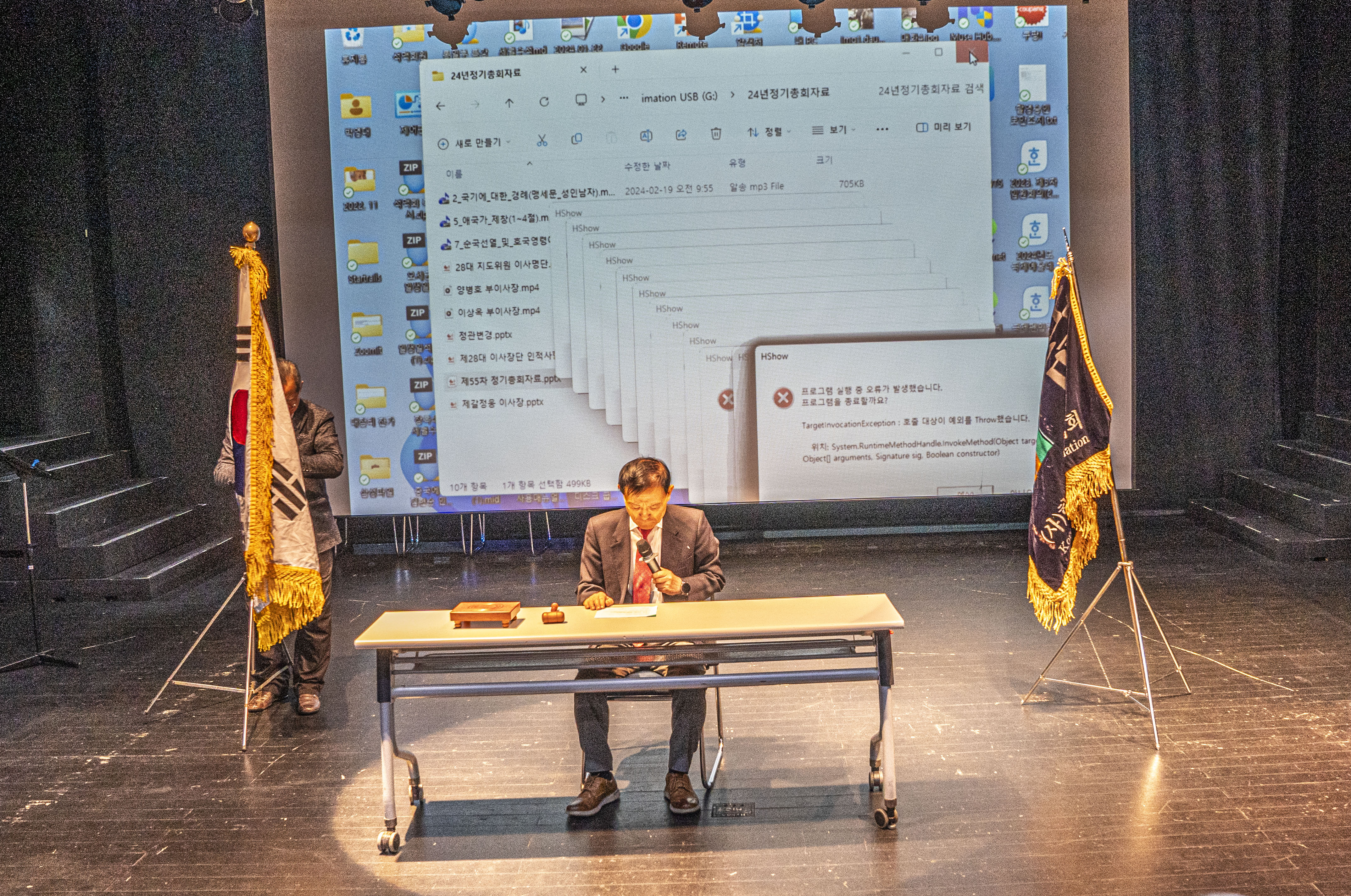 정기총회가 열린 이날 다리소극장에서는 제27대 양왕용 이사장과 제28대 제갈정웅 이사장이 화기애애함 속에서 협회기를 인수인계하고 힘차게 휘날렸다