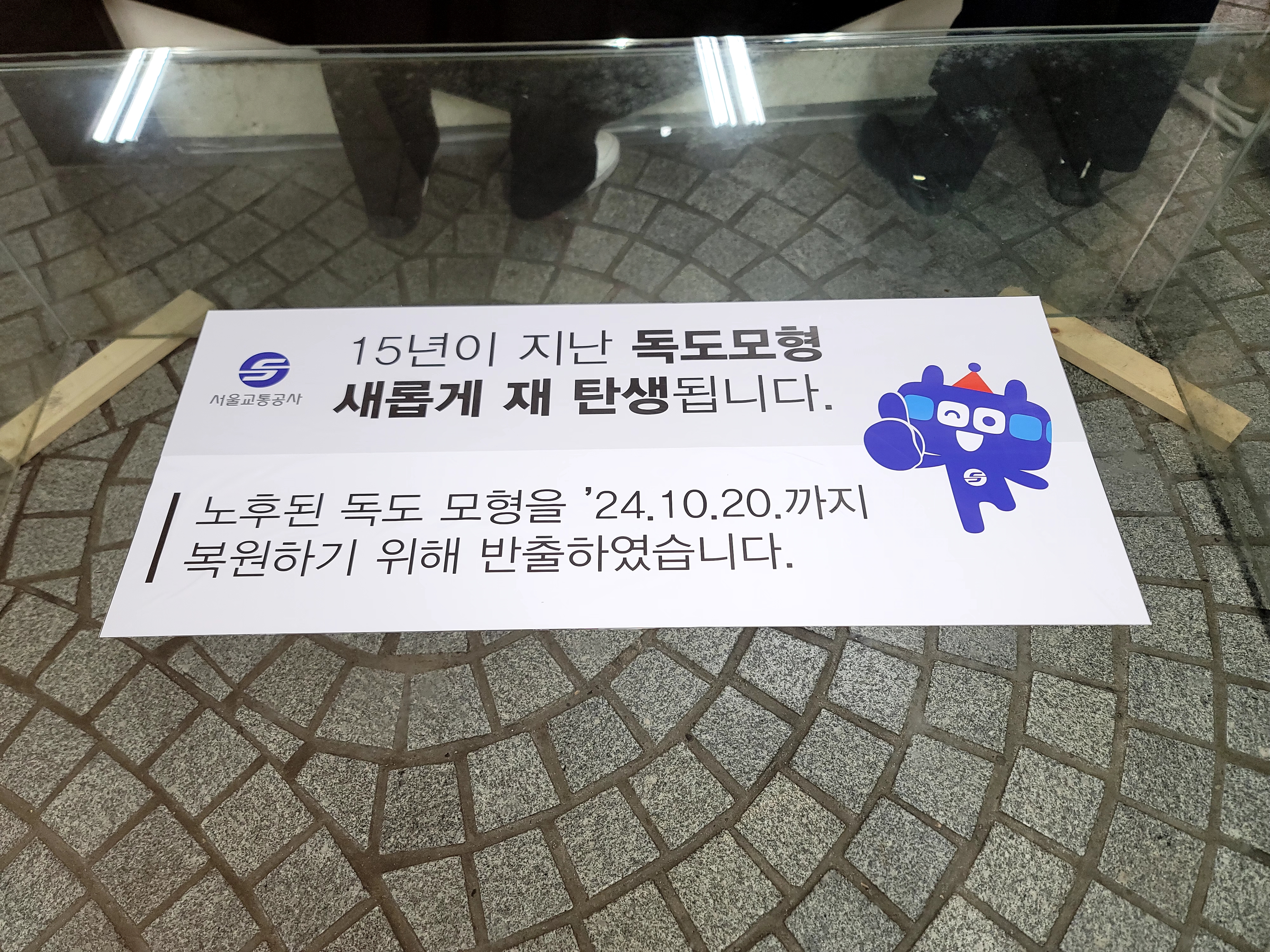 노후된 독도 모형은 새롭게 복원하여 2024. 10. 20까지 복원하기 위하여 반출한다는 안내문이 보인다