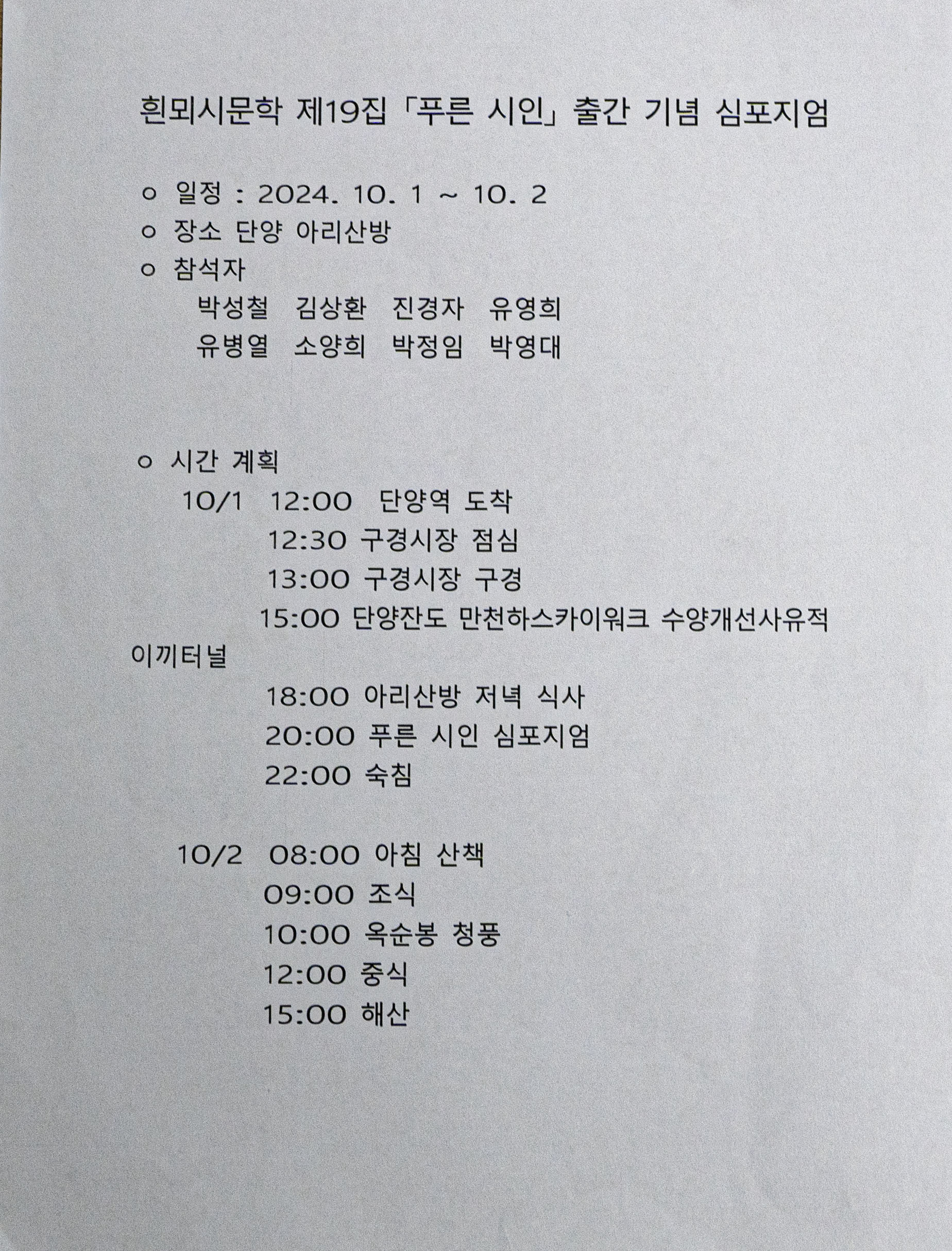 흰뫼시문학 제19집 푸른 시인 시집 출간 기념 세미나가 2024년 10월 1일부터 10월 2일까지 아리산방에서 열리다