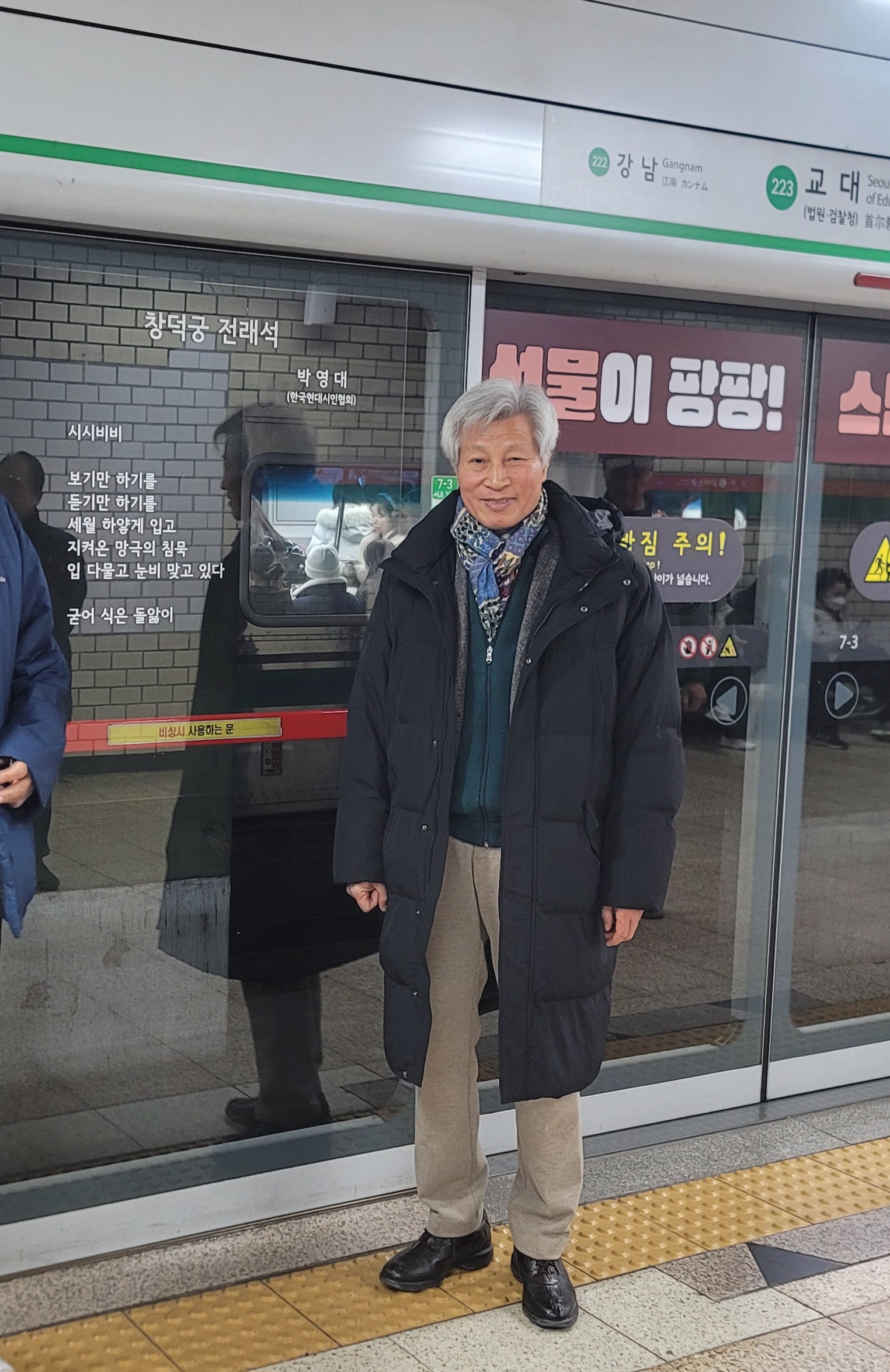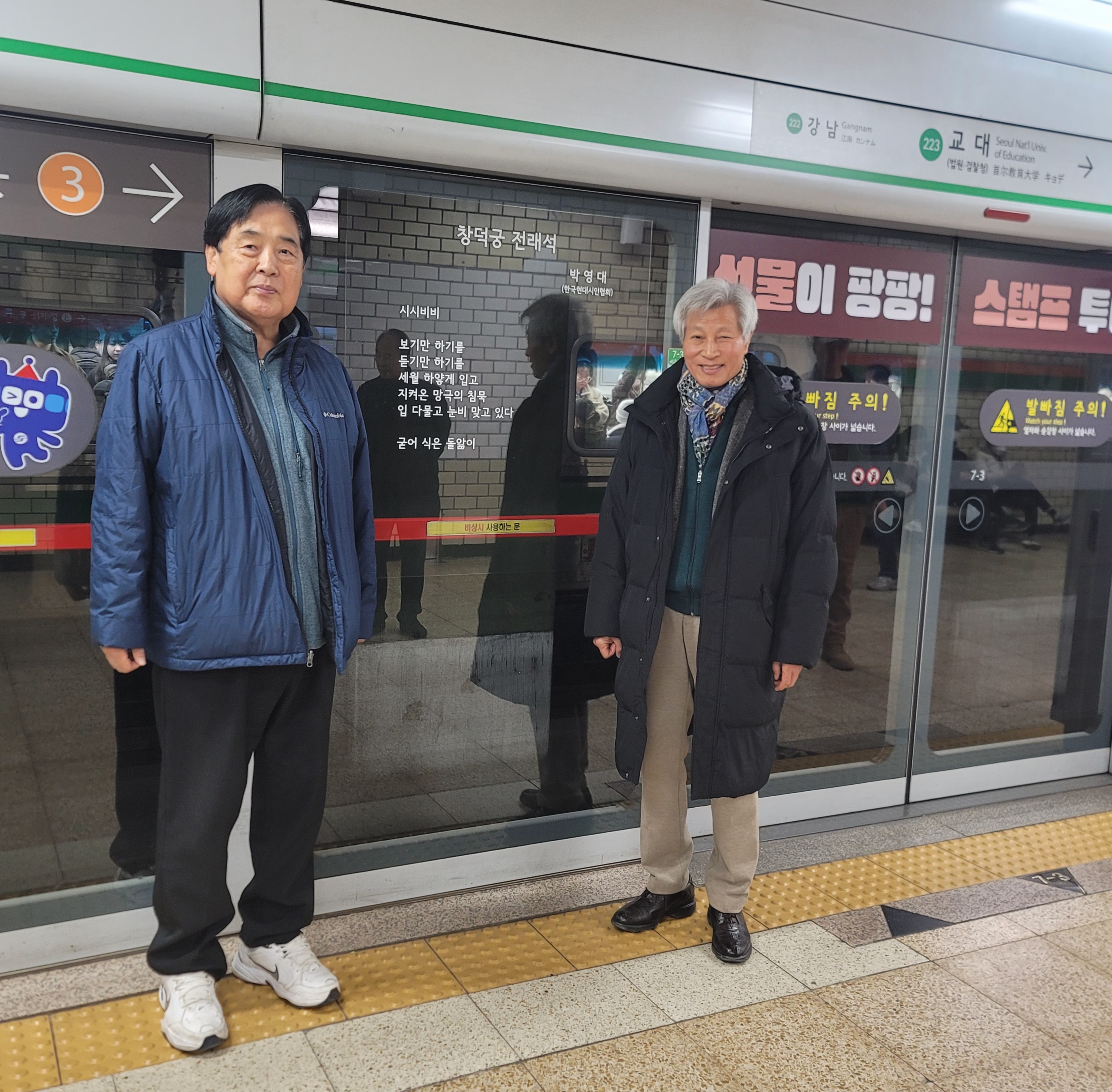 발 빠른 친구가 먼저 지하철 게시 작품을 사진에 담아 카톡에 올려 놓아 미리 보기는 했지만 식사후 지하철 한 역 가까운 교대역으로 가서 친구가 쓴 시를 보고 다들 즐거워 한다