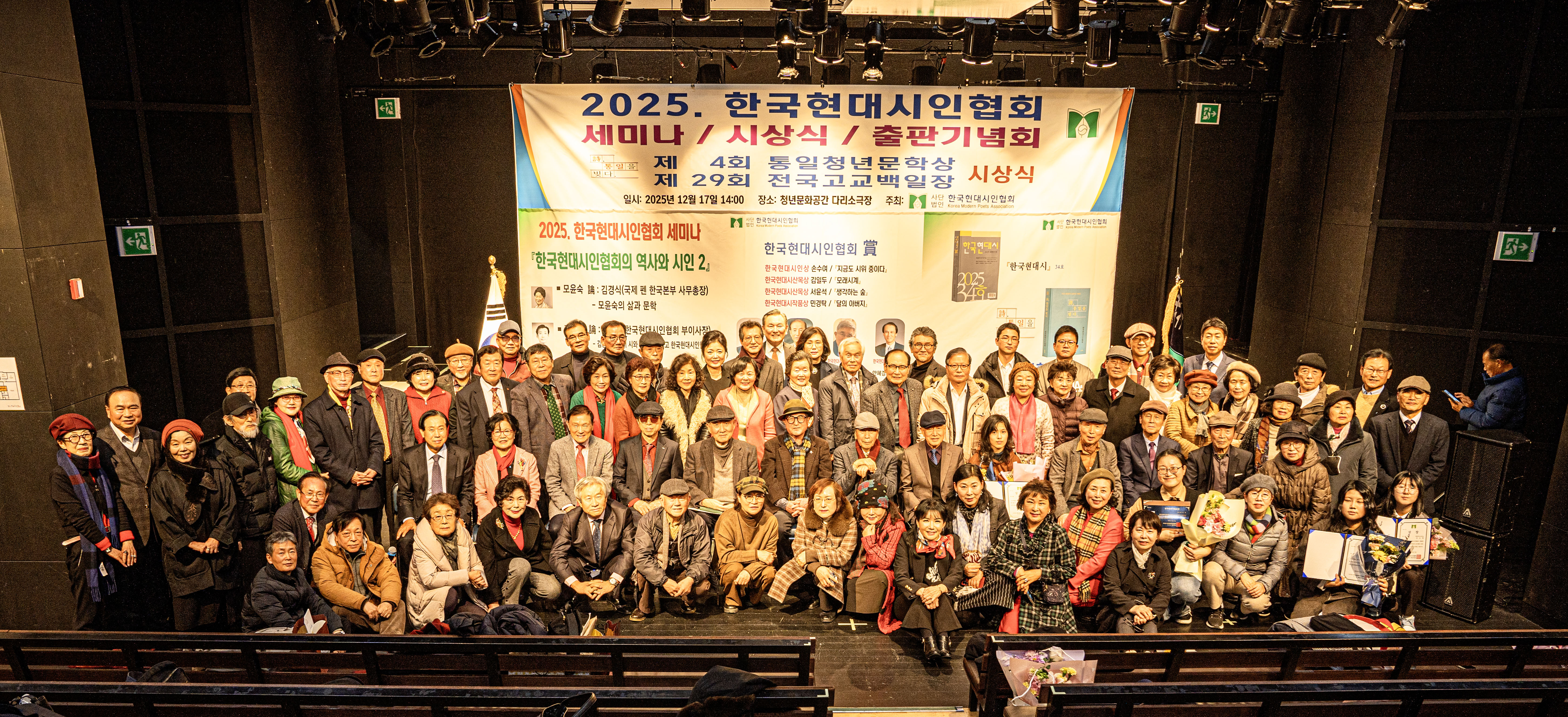 한국현대시인협회 제1부 세미나 제2부 시상식 출판기념회 2025. 12. 17 한국현대시인협회 시상식이 마포 다리소극장에서 열리다 제 48회 한국현대시인상 손수여 : 지금도 시위중이다 제18회 한국현대시 작품상 민경탁 : 달의 아버지 제1회 한국현대시 산목상 김일두 : 모래시계 서윤석 : 생각하는 숲 제4회 청년문학상 수필부문 : 우수상 : 조주현. 안충국 시 부문 : 우수상 : 강춘혁 제29회 전국고교백일장 차상 : 김채원 :(강화여자고등학교) 차하 : 김예진. 박수빈. 운희원. 강소명. 김해원 시상식에 앞서 세미나로 한국현대시의..